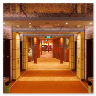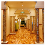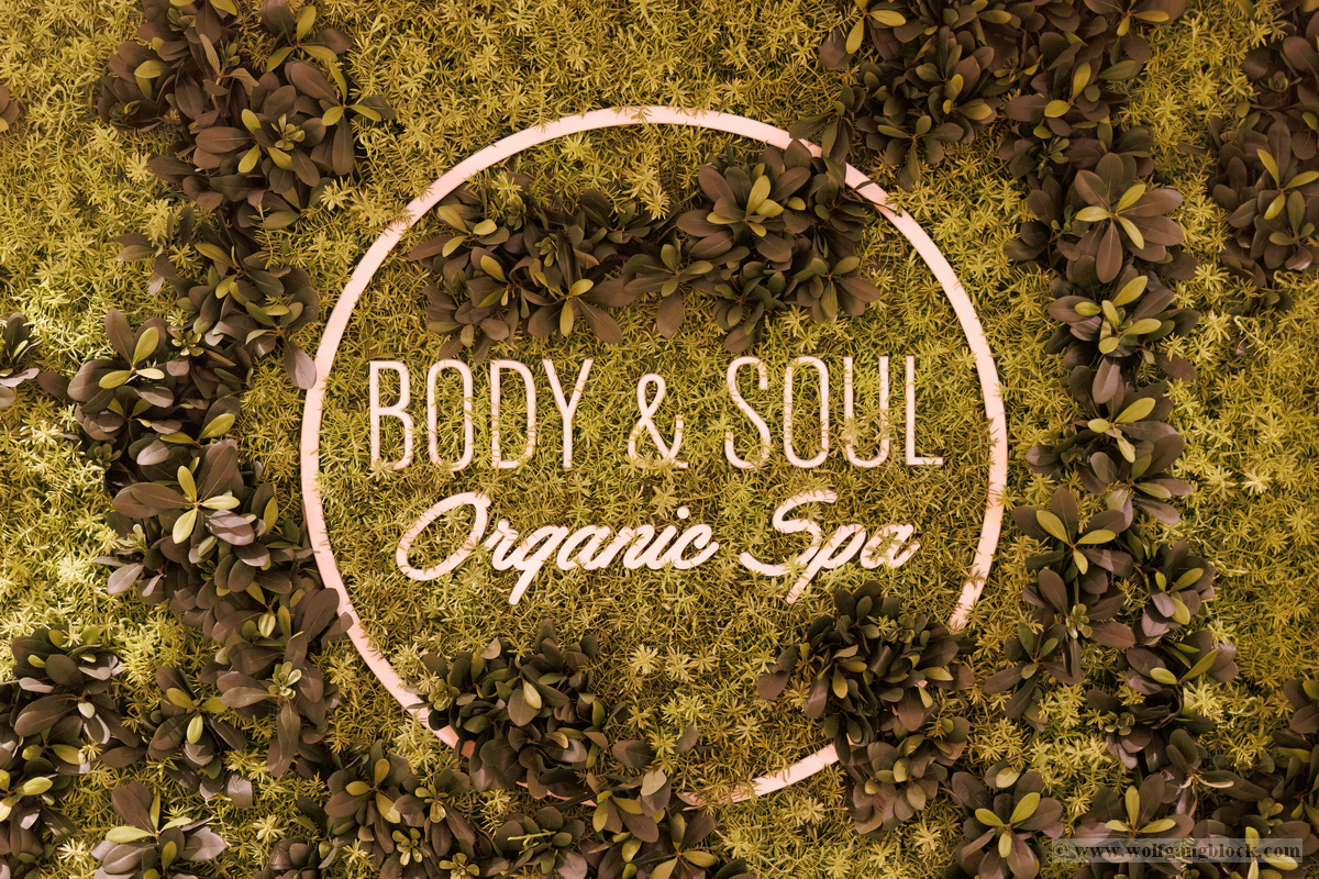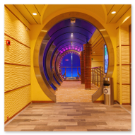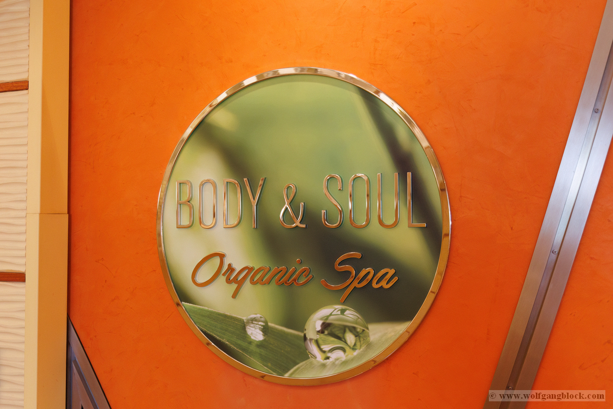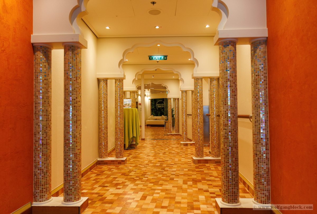 Doch nicht nur die Außendecks lockten uns. Wir tauchten auch tief in den „Bauch“ der AIDAluna ein, um die architektonischen Highlights im Inneren zu dokumentieren. Besonders beeindruckt hat uns der Bereich des Body & Soul Organic Spa. Schon beim Betreten des Ganges fühlt man sich in eine andere Welt versetzt. Die warmen, kräftigen Orange- und Ockertöne der Wände strahlen eine wohlige Gemütlichkeit aus. Der Weg führt durch elegant geschwungene, orientalisch anmutende Torbögen, die von kunstvoll gestalteten Säulen gestützt werden. Jede dieser Säulen ist mit unzähligen kleinen, irisierenden Mosaiksteinen besetzt, die das Licht in allen Farben des Regenbogens reflektieren.