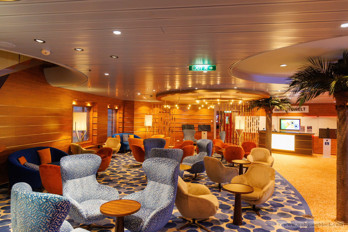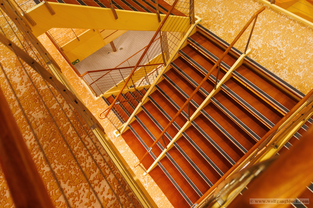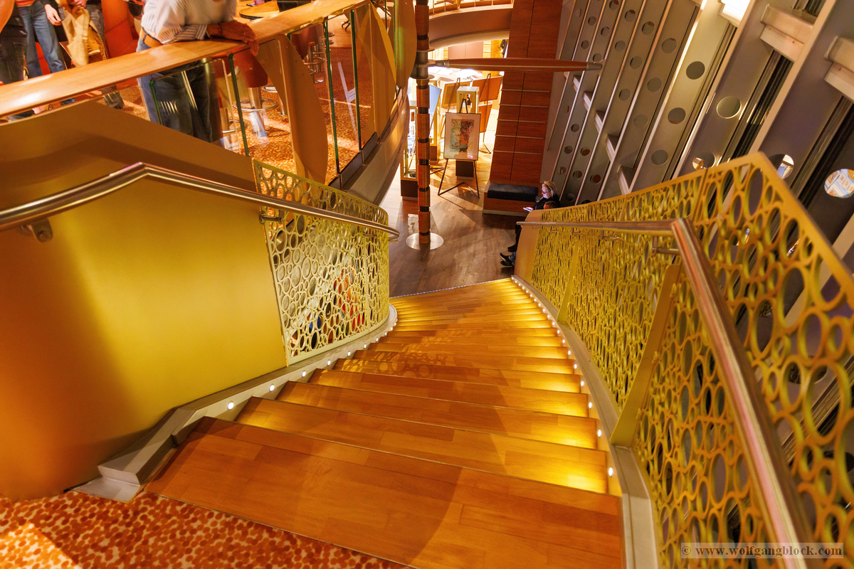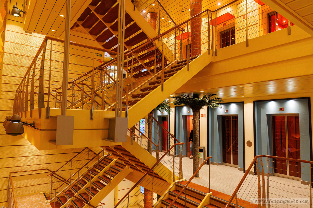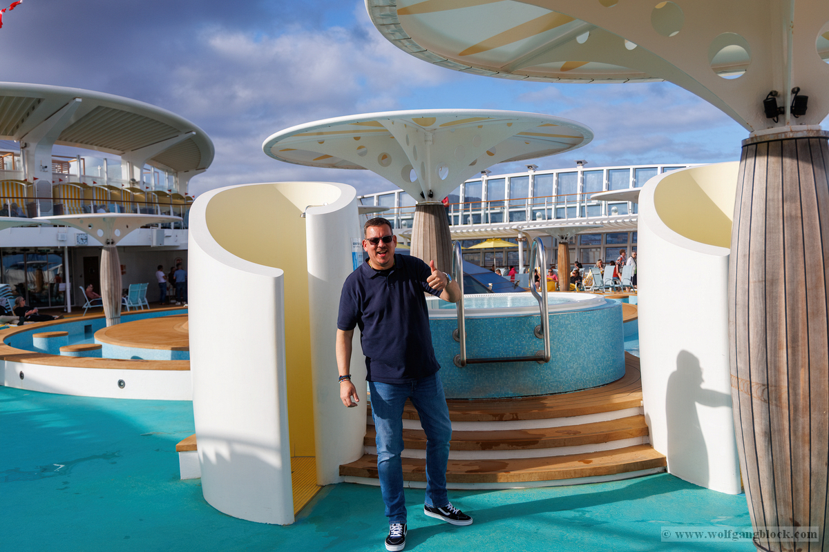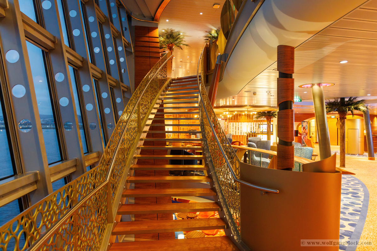 Nachdem wir unser Handgepäck verstaut und die Kabine kurz in Augenschein genommen hatten, hielt uns nichts mehr drinnen. Wir gönnten uns erst einmal einen ausgiebigen Rundgang über die Decks, um das Schiff kennenzulernen. Die Architektur im Inneren, insbesondere die weitläufigen Treppenhäuser, ist beeindruckend und verbindet die verschiedenen Erlebniswelten des Schiffs auf elegante Weise.