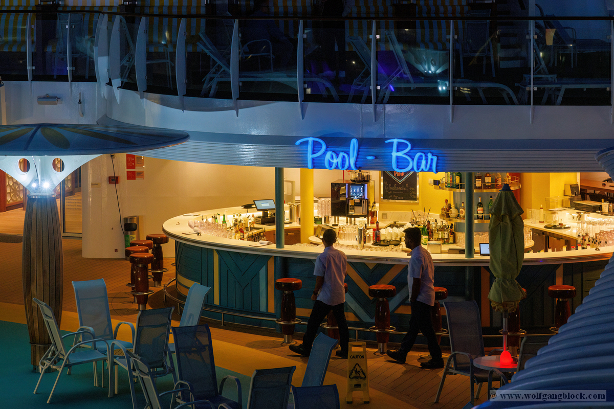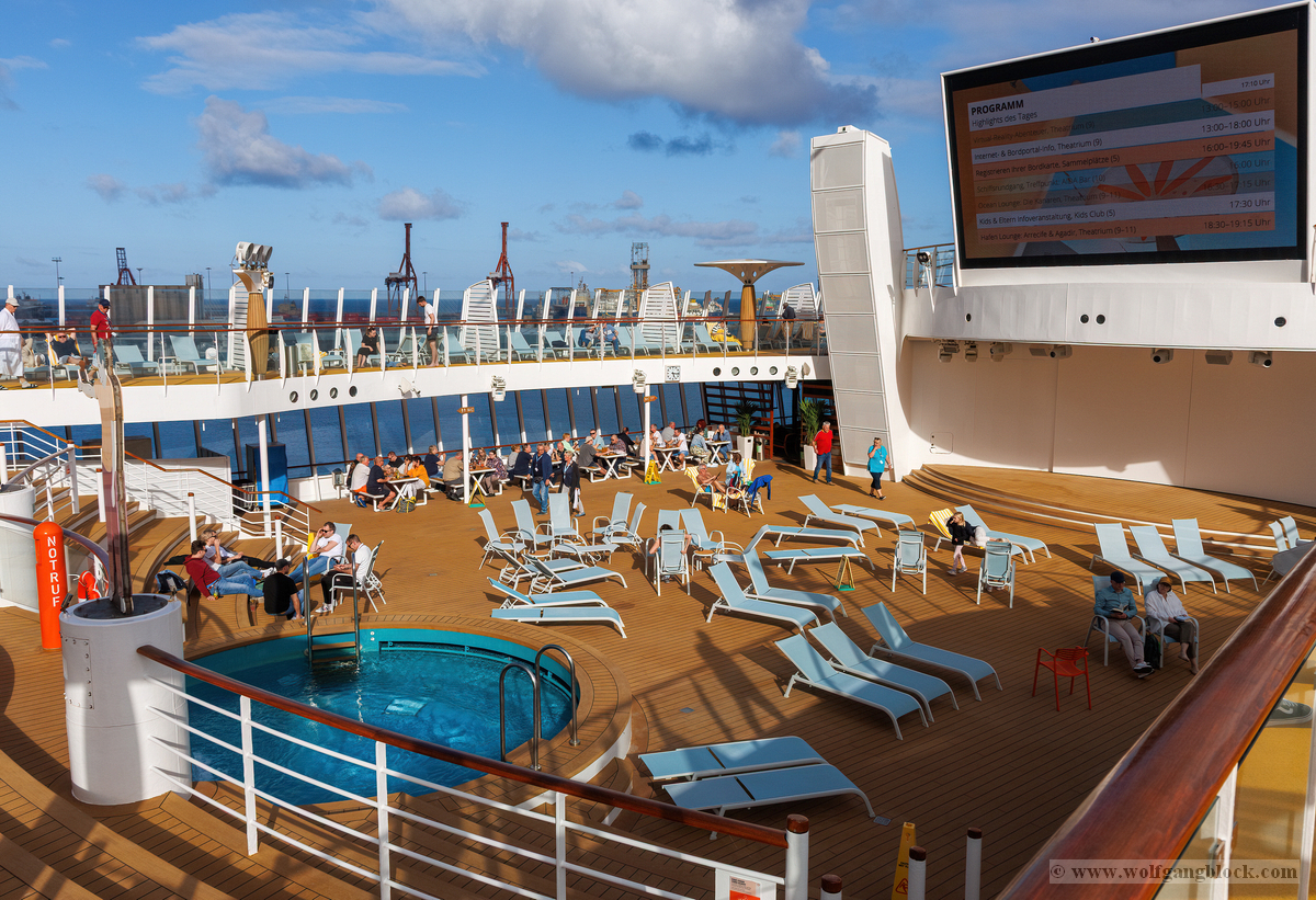 Gefühl: Der Urlaub ist da. Die Kabine ist bezogen, das Schiff erkundet und das erste Bier an der Pool Bar schmeckt nach Freiheit. Jetzt kann die Reise richtig losgehen! Leinen los um 21:00 Uhr!