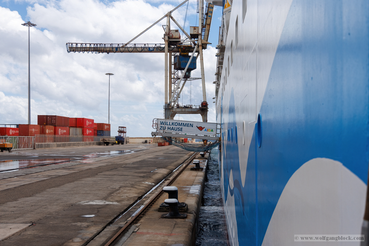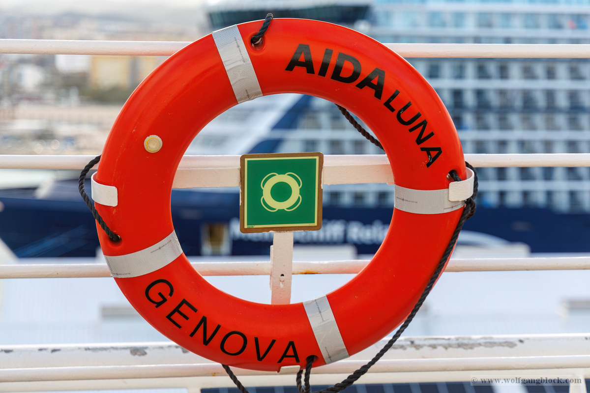 Von der Reling aus boten sich spektakuläre Weitwinkel-Perspektiven auf den Hafen von Las Palmas. Besonders beeindruckend war der direkte Vergleich der Größenverhältnisse: Direkt unter uns lag das moderne Cruise Terminal mit seinen Solarpaneelen, während ein Dock weiter die gewaltige Silhouette der „Mein Schiff Relax“ den Horizont dominierte. Ein roter Rettungsring mit dem Schriftzug „AIDAluna GENOVA“ im Vordergrund gab den Bildern die nötige maritime Rahmung und erinnerte uns daran, dass wir uns nun auf einem Schiff unter italienischer Flagge befanden. Der Rundgang führte uns bis ganz nach vorne an den Bug und weit nach hinten zum Heck, wo bunte Signalflaggen im Wind tanzten. In der Ferne ragten die massiven Verladekräne des Containerhafens wie stählerne Dinosaurier in den Himmel – ein künstlicher, industrieller Kontrast zur eleganten Welt der Kreuzfahrt. Wir saugten diese ersten visuellen Eindrücke förmlich auf; jede Ecke des Schiffs schien nur darauf zu warten, durch das Objektiv der R6 II verewigt zu werden.