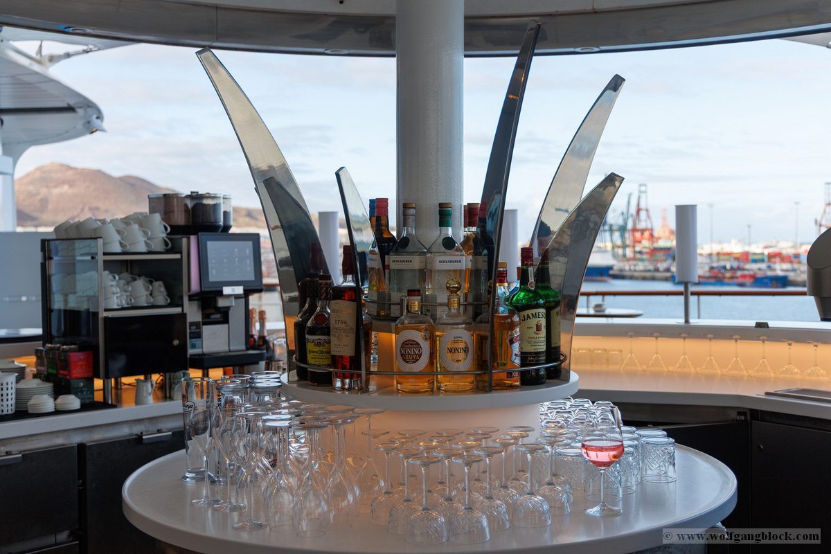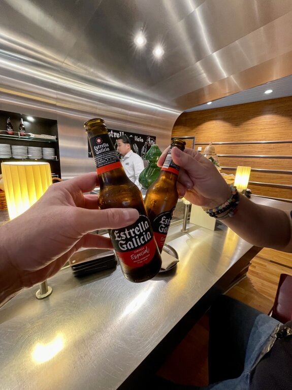 Nach der ausführlichen Dokumentation der Decks und der technischen Anlagen war es Zeit für ein neues Ziel: die Kaltgetränke-Logistik. Unser Weg führte uns von den Außendecks durch das Herz der kulinarischen Vielfalt auf Deck 10. Beim Betreten des Innenbereichs passierten wir den Yachtclub und die Lanai Bar. Die Gestaltung der Glastüren mit ihren handgezeichneten Logos vermittelte sofort eine entspannte, maritime Atmosphäre. Ein besonderer Blickfang auf dem Weg war das East Fusion und die angeschlossene Sushi Bar. Die Architektur hier ist ein Meisterwerk des modernen Designs: Warme Holztöne treffen auf elegante Goldakzente und eine indirekte Beleuchtung. Besonders beeindruckend war die Inszenierung der künstlichen Kirschblütenbäume im Restaurantbereich. Schließlich erreichten wir unser Ziel im Außenbereich. Es war Zeit, den Staub der Lanzarote-Pisten endgültig wegzuspülen. Dank unseres Pakets war die Wahl schnell getroffen: Ein herbes Radeberger Pilsner und ein naturtrübes Schöfferhofer Weizen. An einem der Holztische an Deck, mit direktem Blick auf die glitzernde Hafenoberfläche und die Silhouette der Vulkane im Hintergrund, stießen wir auf den erfolgreichen Tag an. Das Bild des erhobenen Glases gegen die tiefblaue Kulisse des Atlantiks ist für uns das ultimative Symbol dieser Reise: Freiheit, Genuss und der Sieg über den Alltag. Mit dieser Erfrischung im System waren wir bereit für das nächste Kapitel des Tages. Die Speicherkarten waren voll, die Gläser auch – ein perfekter Moment an Bord der Luna.