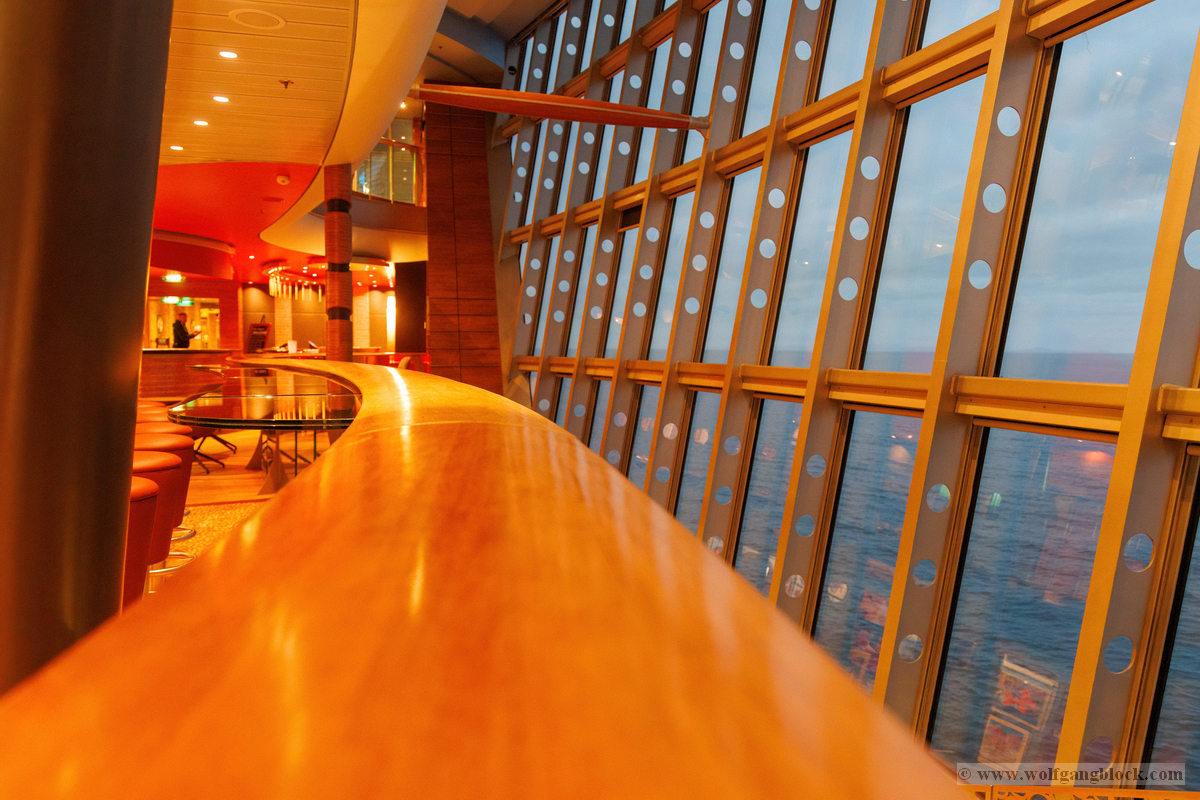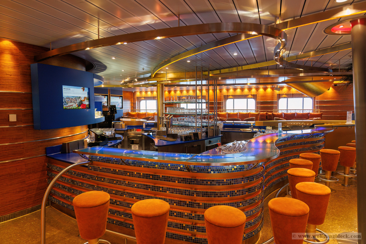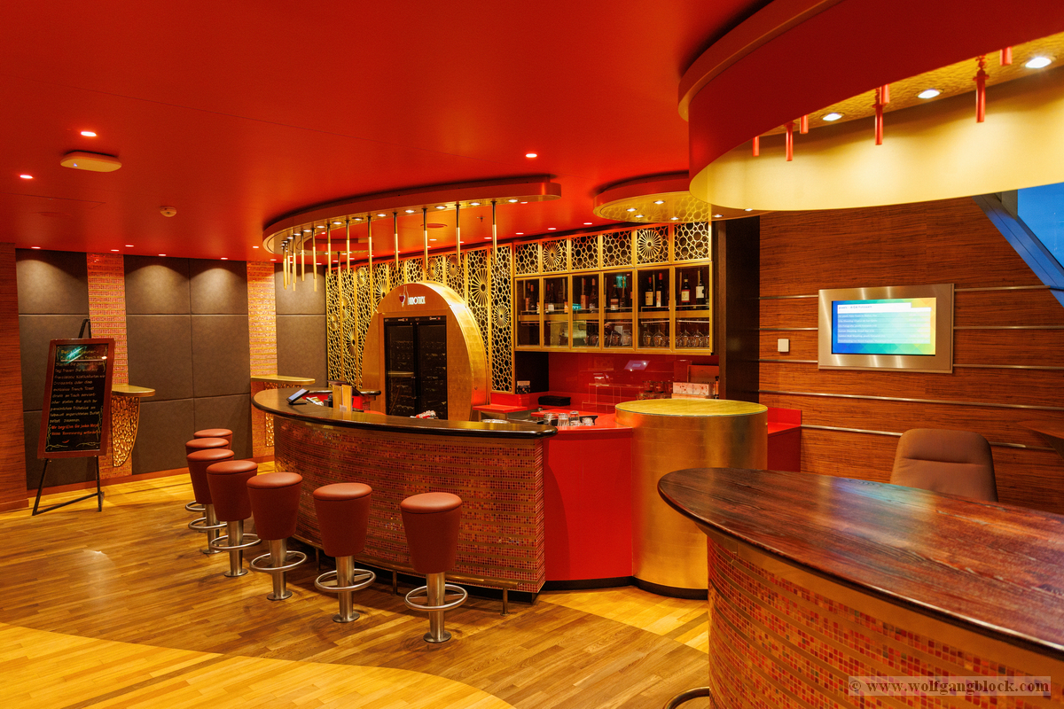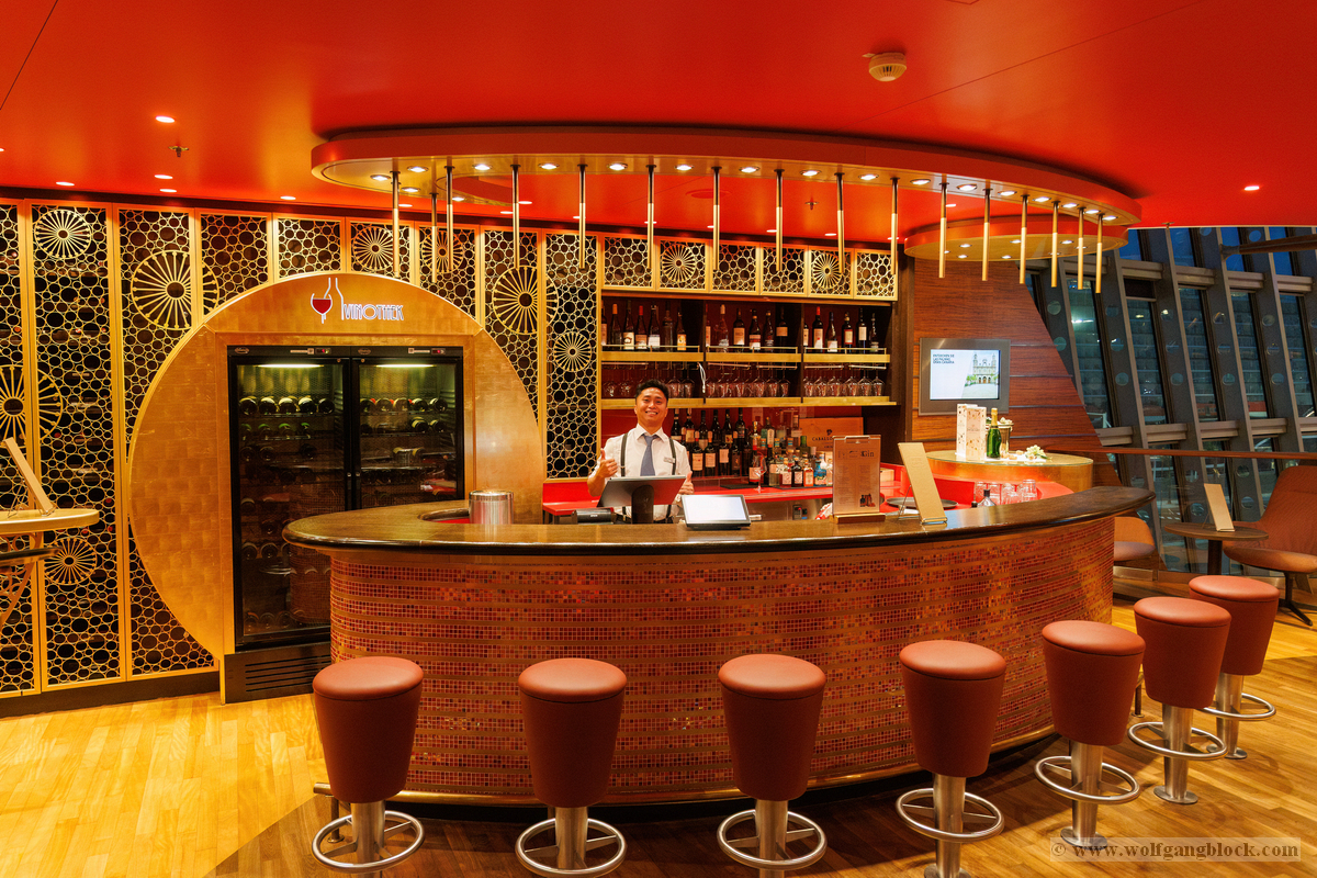 Ein weiteres Highlight im Schiffsinneren ist die Vinothek. Die Bar besticht durch ihr elegantes Design mit einer kräftig roten Decke und einer kunstvoll gestalteten Rückwand aus goldenen Ornamenten. Die warme Beleuchtung und die edlen Holzoberflächen schaffen eine exklusive Wohlfühlatmosphäre. Hier wurden wir bereits von einem lächelnden Barkeeper empfangen, der mit Stolz sein Reich präsentierte. Besonders fasziniert hat uns die AIDA Bar. Mit ihrem charakteristischen blauen Mosaik am Tresen und der geschwungenen Metallstruktur über der Bar ist sie ein echter Blickfang. Wenn man hier an der Reling steht, wird einem die Verbindung zum Meer erst richtig bewusst: Die riesigen, geneigten Fensterfronten des Theatriums bieten einen ungehinderten Blick auf den Hafen und das offene Wasser. Die warme Holzoberfläche der Brüstung im Vordergrund bildet dabei einen perfekten Rahmen für das maritime Panorama, während draußen langsam die Dämmerung einsetzt.