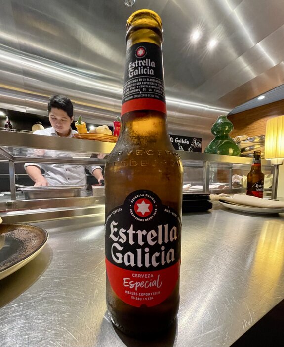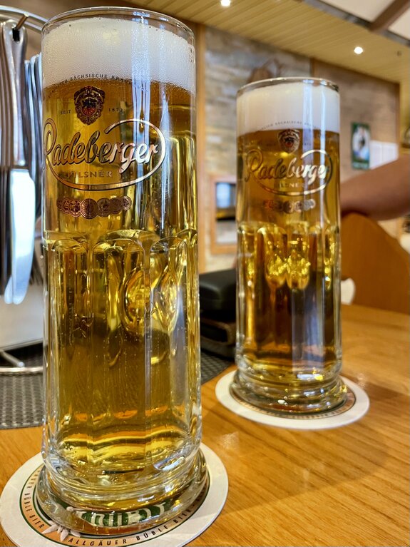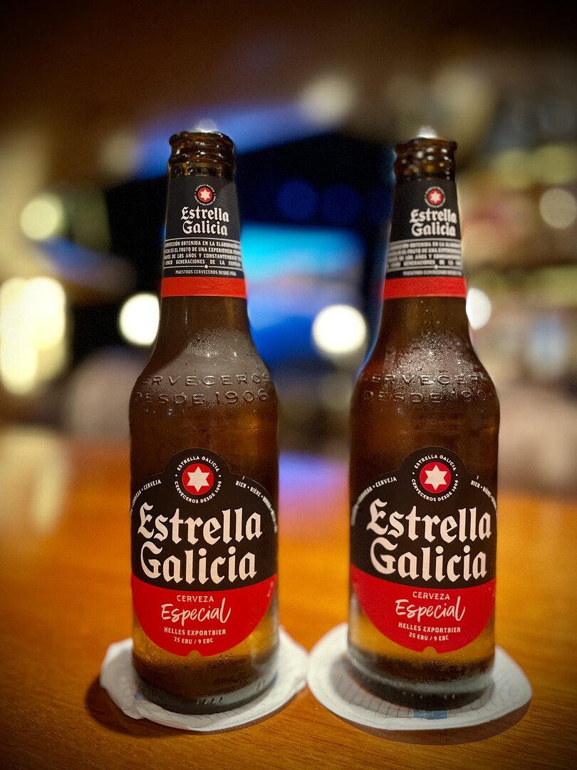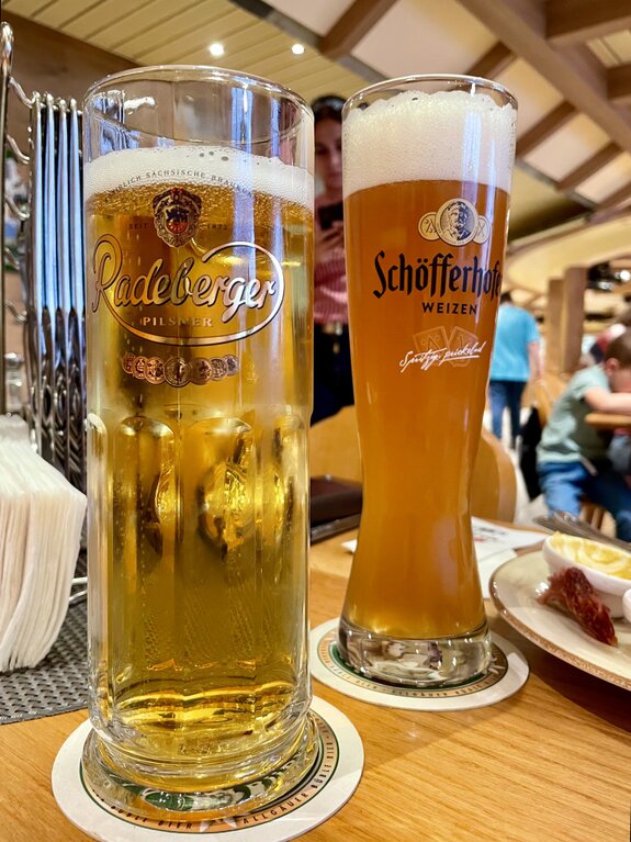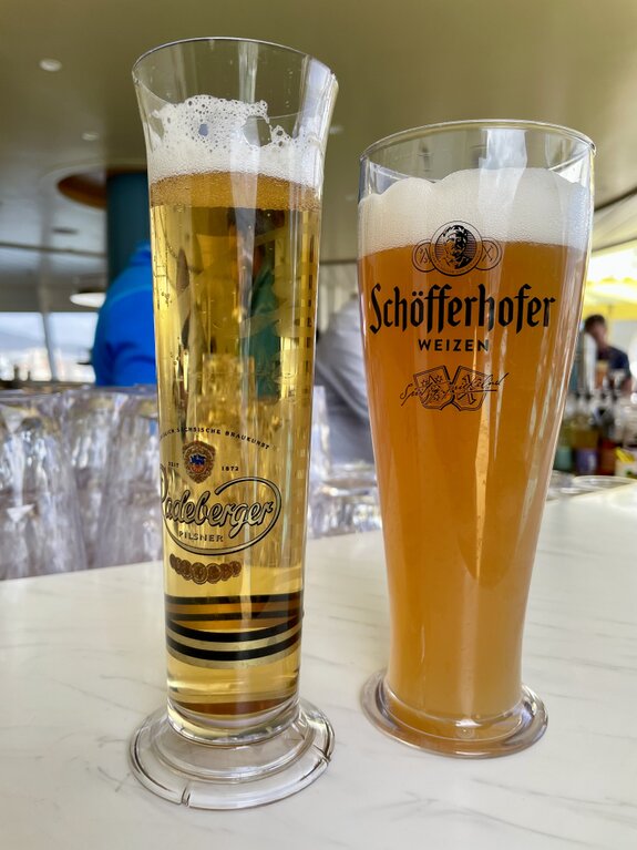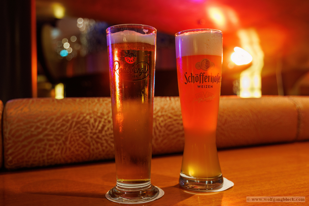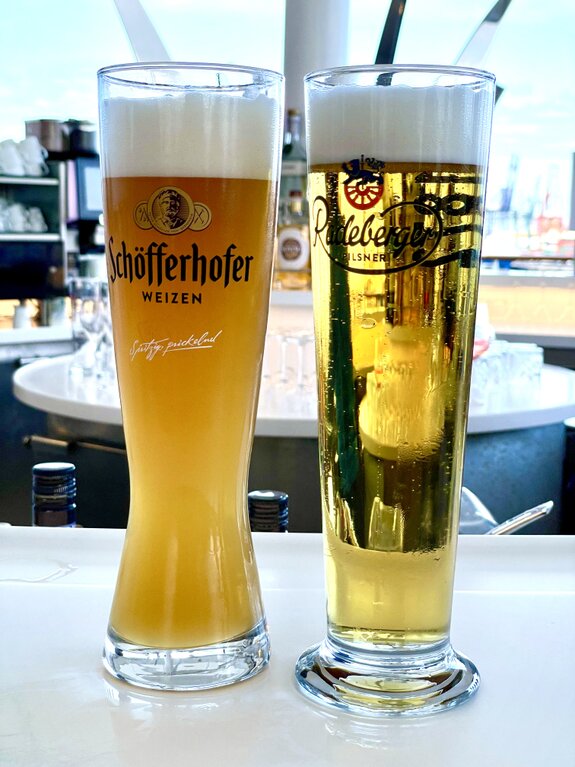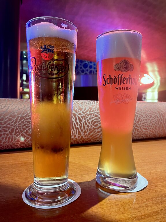 An der weißen Marmortheke der Bar ließen wir uns nieder. Die Wahl fiel auf zwei Klassiker: Ein herbes, goldgelbes Radeberger Pilsner im schlanken Glas und ein naturtrübes, spritziges Schöfferhofer Weizen. Die Gläser waren herrlich beschlagen von der Kälte der Getränke, was in der warmen Nachmittagssonne von Las Palmas für die perfekte Erfrischung sorgte.
