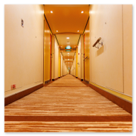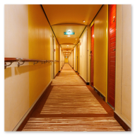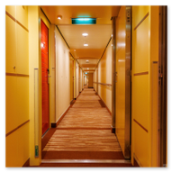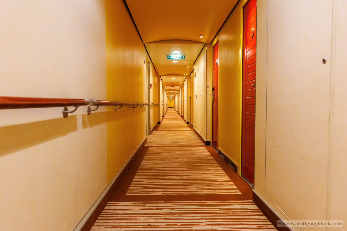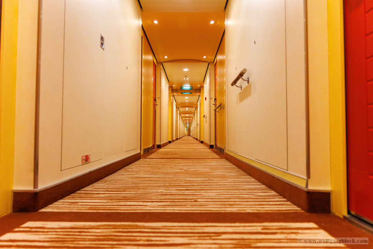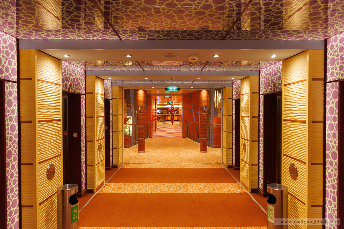 Sogar die Aufzugsbereiche sind ein visuelles Erlebnis. Auf Deck 10 empfing uns eine fast schon psychedelisch anmutende Decken- und Wandgestaltung in Lila-Mustern, die perfekt mit dem warmen Orange der Teppiche harmoniert. Es ist diese Liebe zum Detail in jedem Winkel, die das Schiffserlebnis so besonders macht. Zum Abschluss unseres Rundgangs faszinierten uns die scheinbar unendlichen Flure der AIDAluna. Die perfekt ausgeleuchteten Gänge mit ihren charakteristischen roten Türen bieten eine Fluchtpunkt-Perspektive, die die schiere Länge des Schiffs betont. Ob aus tiefer Perspektive oder im weiten Überblick – diese Gänge haben ihren ganz eigenen, symmetrischen Reiz.