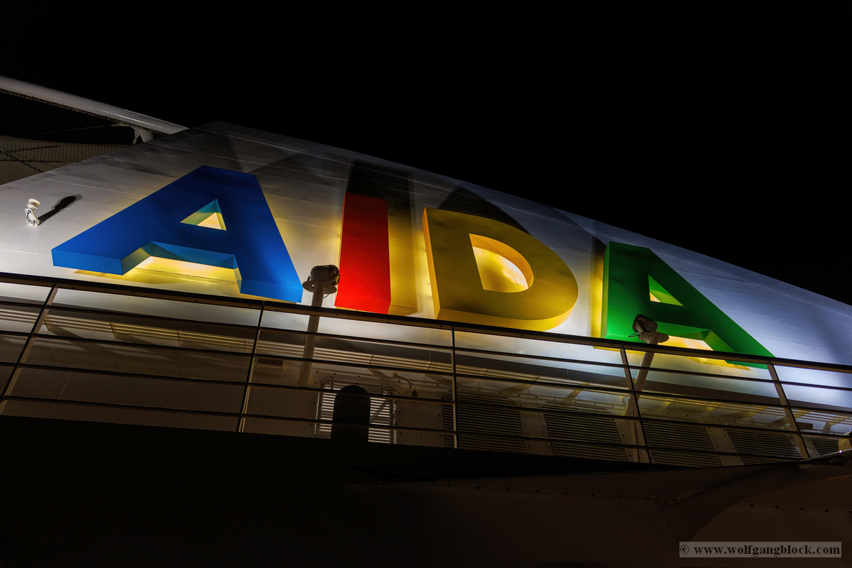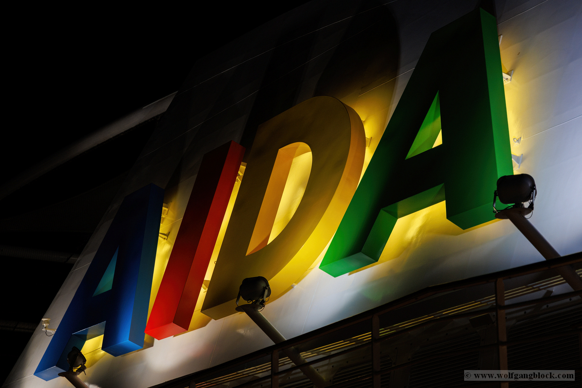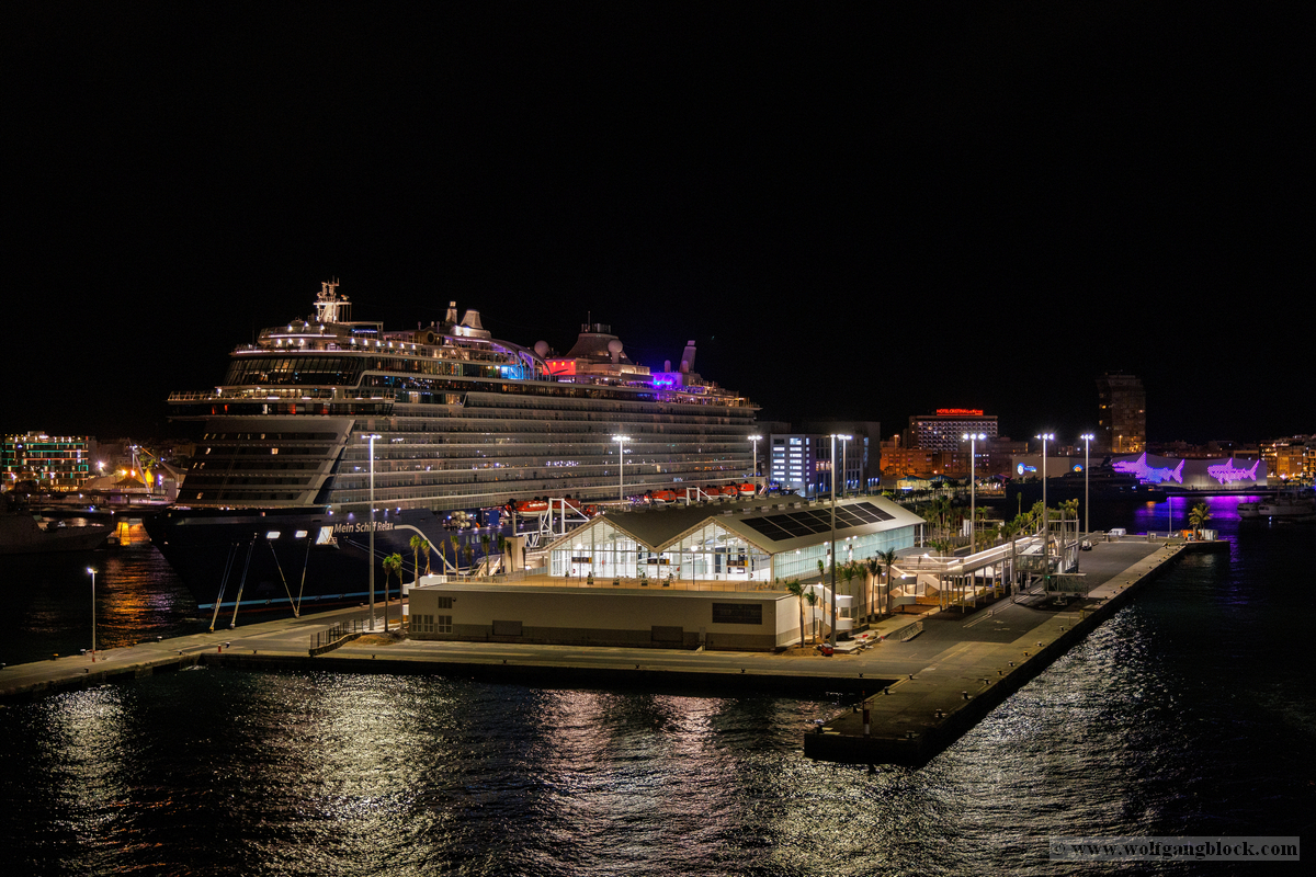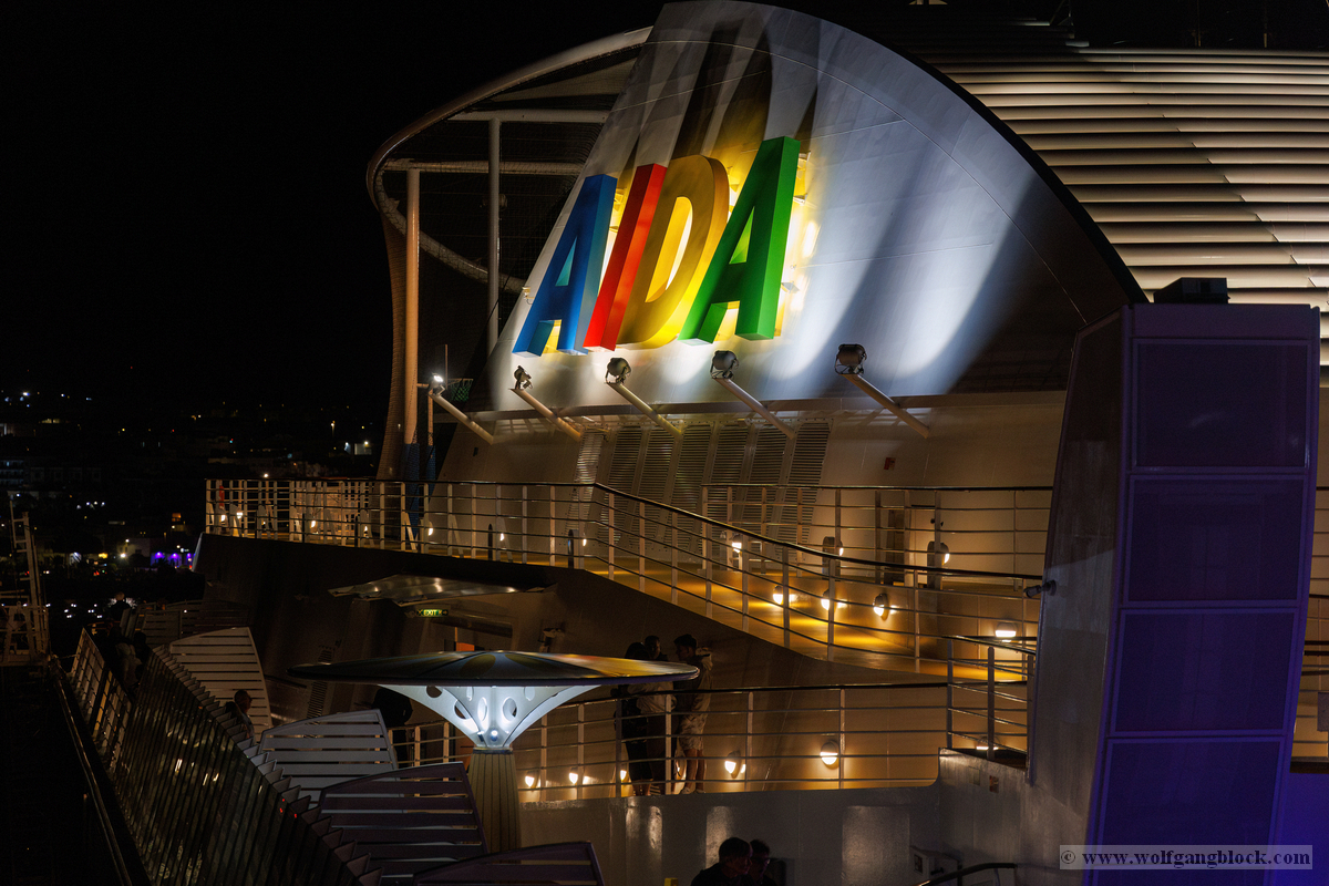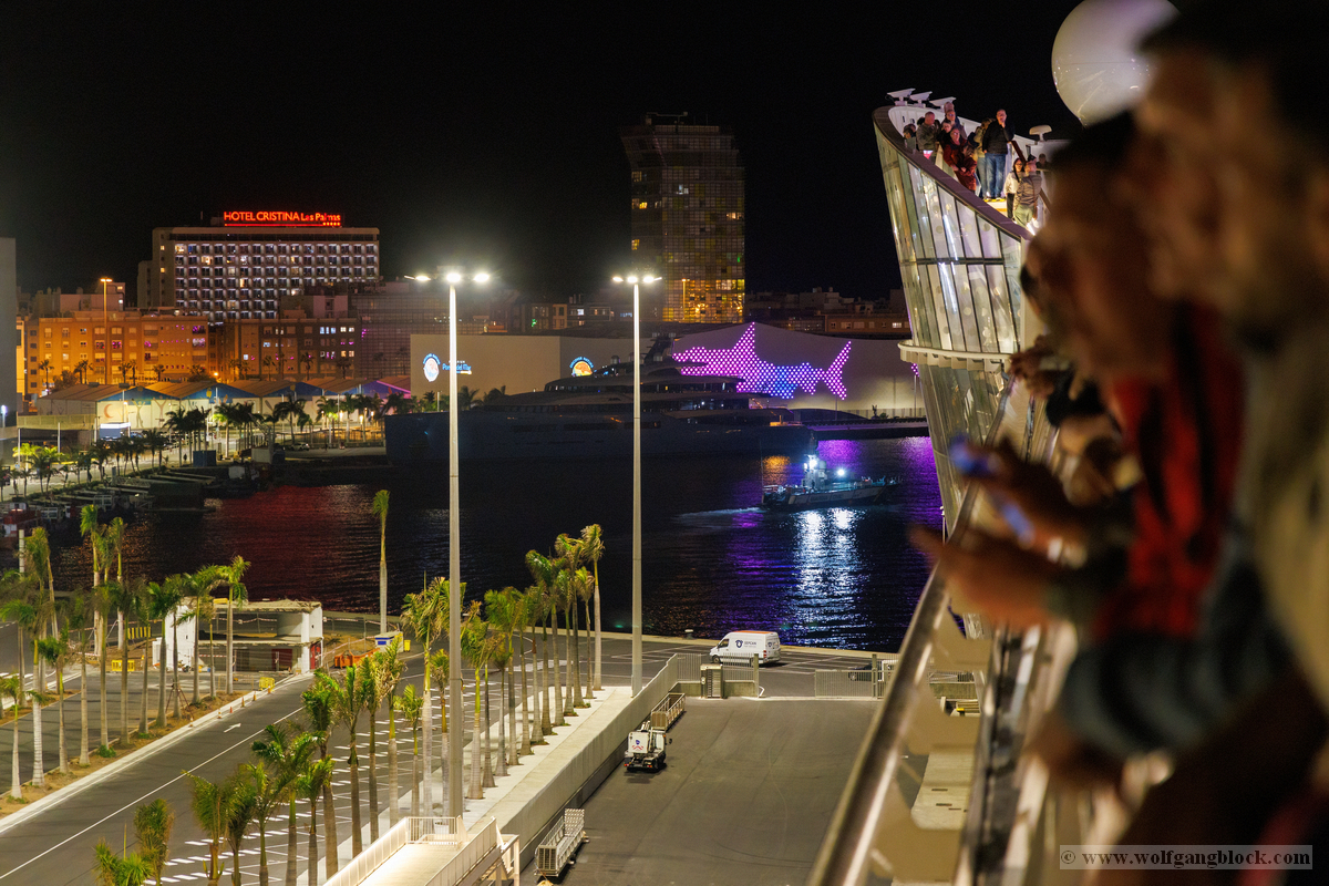 Gegen 21:00 Uhr erreichte die Spannung an Bord ihren Höhepunkt. Draußen war es längst dunkel geworden, und Las Palmas verwandelte sich in ein glitzerndes Lichtermeer. Wir bezogen Position an der Reling, um den Moment des Aufbruchs festzuhalten. Das Deck war gut gefüllt mit erwartungsvollen Passagieren, die alle den Moment herbeisehnten, an dem sich das Schiff endlich in Bewegung setzen würde. Über uns leuchtete der großformatige AIDA-Schriftzug in den vertrauten Farben, jetzt effektvoll von Scheinwerfern angestrahlt – ein starkes grafisches Motiv gegen das Schwarz der Nacht. Ein absoluter Blickfang in der nächtlichen Kulisse war das Aquarium „Poema del Mar“. Die Fassade war mit riesigen, violett leuchtenden Fisch- und Hai-Silhouetten inszeniert, die fast so wirkten, als würden sie durch die Nacht schwimmen. Es war ein faszinierendes Spiel aus Licht und Farbe, das den Abschied von Gran Canaria visuell perfekt abrundete. In der Ferne spiegelten sich die Lichter der Stadt im tiefschwarzen Hafenbecken. Dann ertönte das Kommando: „Leinen los!“. Von unserem Logenplatz oben blickten wir steil nach unten auf das Geschehen an der Pier. Ein letzter Blick auf das moderne Cruise Terminal und unsere „Nachbarin“, die Mein Schiff Relax, die noch fest vertäut an der Kaimauer lag, während wir uns langsam entfernten. Die Distanz zur Pier vergrößerte sich Zentimeter um Zentimeter, und das Terminal schrumpfte in der Ferne zu einem kleinen, beleuchteten Punkt.
