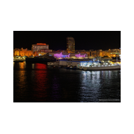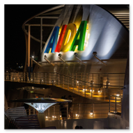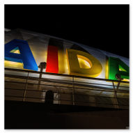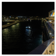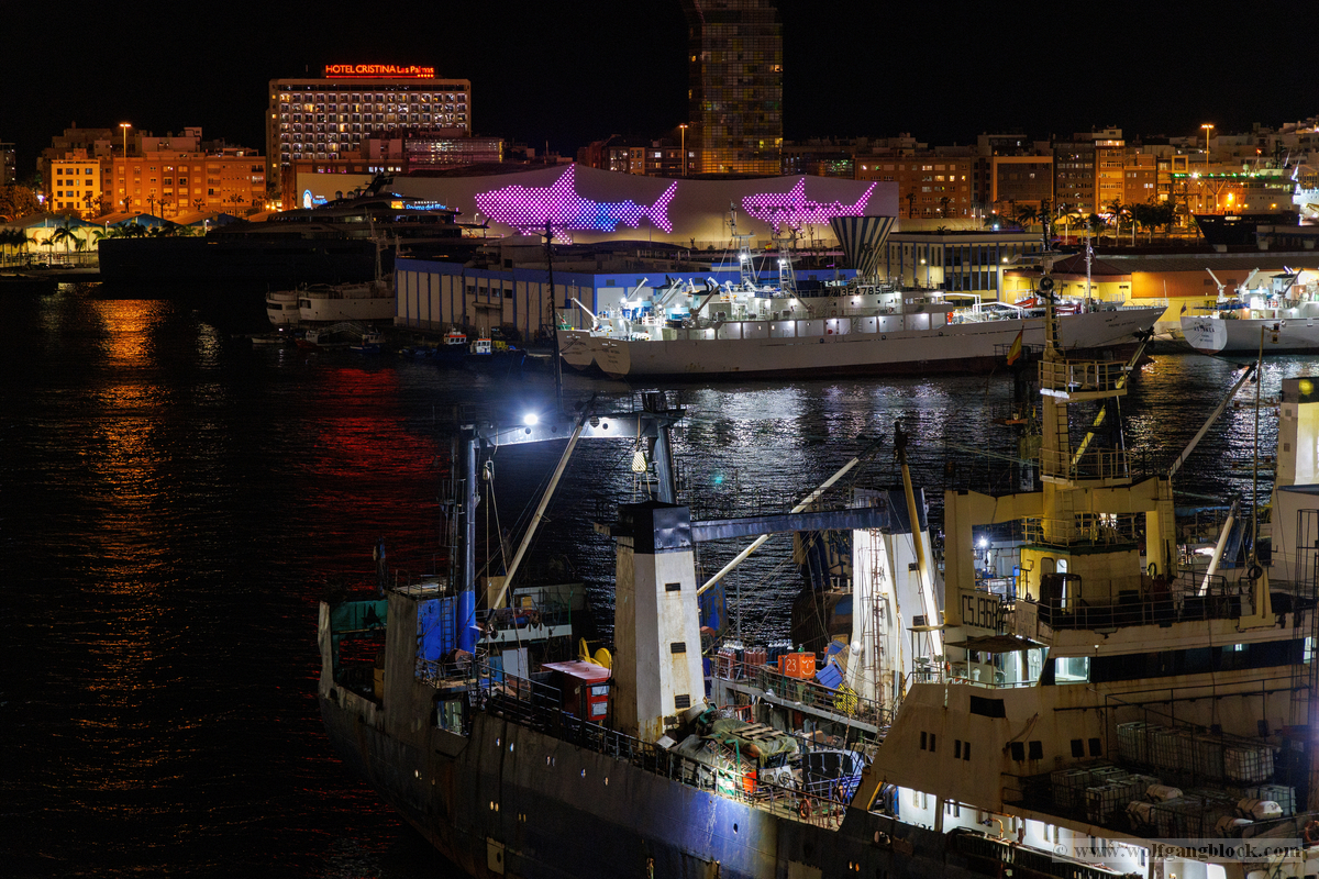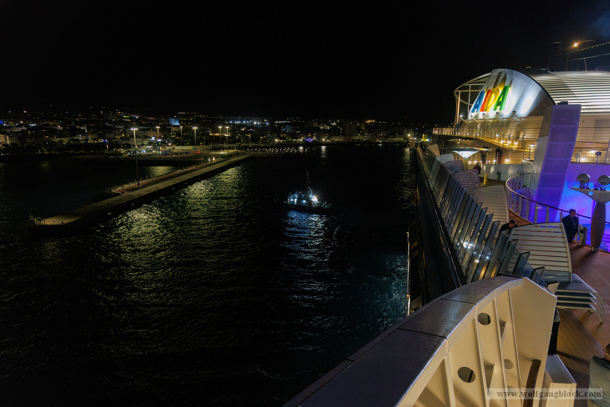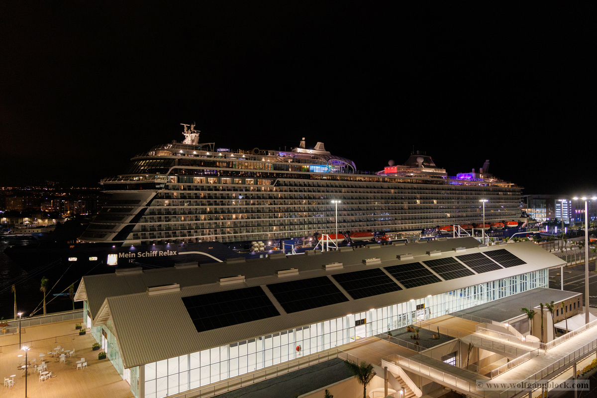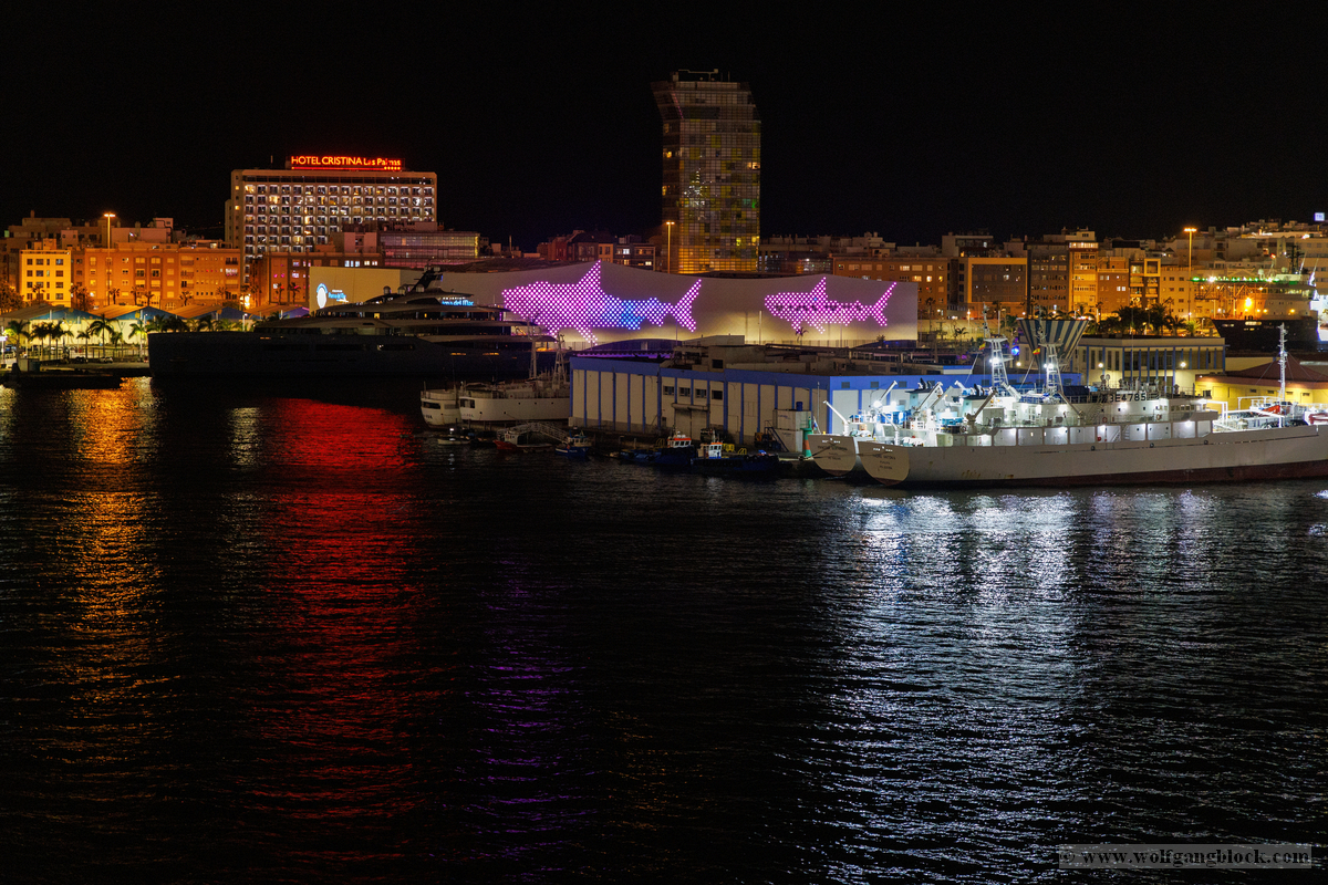 Gegen 21:00 Uhr erreichte die Spannung an Bord ihren Höhepunkt. Draußen war es längst dunkel geworden, und Las Palmas verwandelte sich in ein glitzerndes Lichtermeer. Wir bezogen Position an der Reling, um den Moment des Aufbruchs festzuhalten. Das Deck war gut gefüllt mit erwartungsvollen Passagieren, die alle den Moment herbeisehnten, an dem sich das Schiff endlich in Bewegung setzen würde. Über uns leuchtete der großformatige AIDA-Schriftzug in den vertrauten Farben, jetzt effektvoll von Scheinwerfern angestrahlt – ein starkes grafisches Motiv gegen das Schwarz der Nacht. Ein absoluter Blickfang in der nächtlichen Kulisse war das Aquarium „Poema del Mar“. Die Fassade war mit riesigen, violett leuchtenden Fisch- und Hai-Silhouetten inszeniert, die fast so wirkten, als würden sie durch die Nacht schwimmen. Es war ein faszinierendes Spiel aus Licht und Farbe, das den Abschied von Gran Canaria visuell perfekt abrundete. In der Ferne spiegelten sich die Lichter der Stadt im tiefschwarzen Hafenbecken. Dann ertönte das Kommando: „Leinen los!“. Von unserem Logenplatz oben blickten wir steil nach unten auf das Geschehen an der Pier. Ein letzter Blick auf das moderne Cruise Terminal und unsere „Nachbarin“, die Mein Schiff Relax, die noch fest vertäut an der Kaimauer lag, während wir uns langsam entfernten. Die Distanz zur Pier vergrößerte sich Zentimeter um Zentimeter, und das Terminal schrumpfte in der Ferne zu einem kleinen, beleuchteten Punkt.