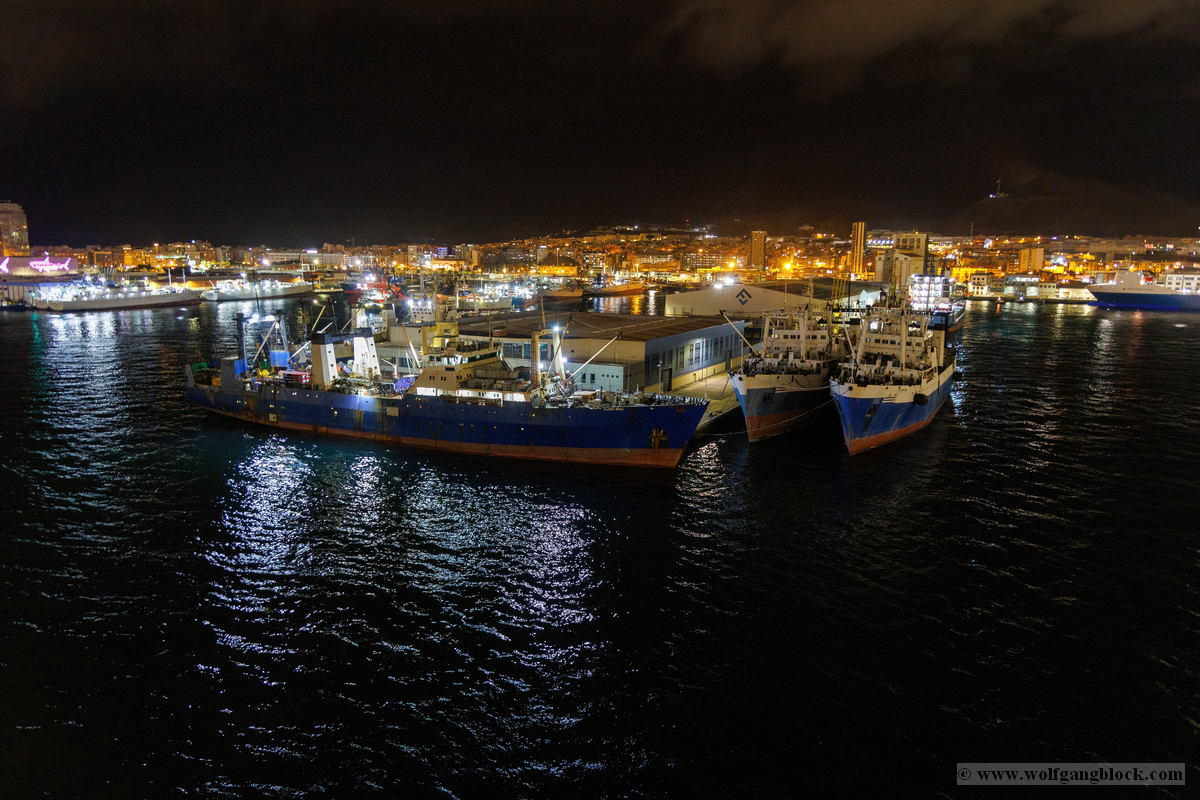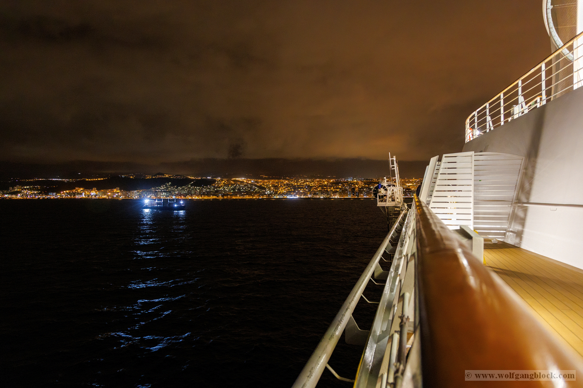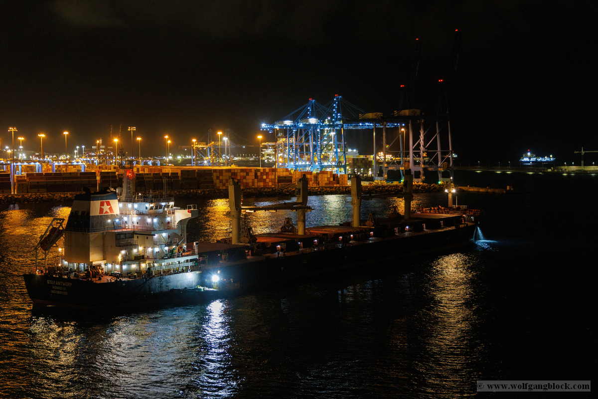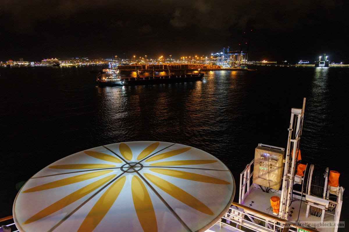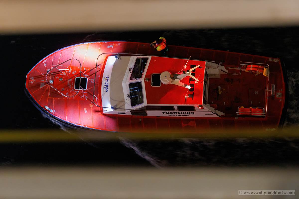 Wir glitten langsam an anderen Schiffen im Hafen vorbei. Überall herrschte emsige Betriebsamkeit unter dem grellen Licht der Hafenstrahler. Besonders beeindruckend wirkten die massiven Industrieschiffe, wie der Frachter Star Antwerp, die im Scheinwerferlicht fast wie Kulissen aus einem Film wirkten. Das Wasser glitzerte in Gold- und Silbertönen, während die Skyline von Las Palmas langsam am Horizont verblasste. Ein besonderes technisches Schauspiel bot das Lotsenboot (Pilot). Die wendige, leuchtend rote Barke – die Practicos Las Palmas – begleitete uns ein Stück weit aus dem Hafenbecken heraus. Von oben wirkte das Boot wie ein kleines, leuchtendes Spielzeug vor der massiven Bordwand der Luna, fokussiert im Scheinwerferkegel.