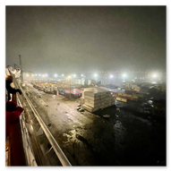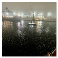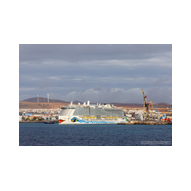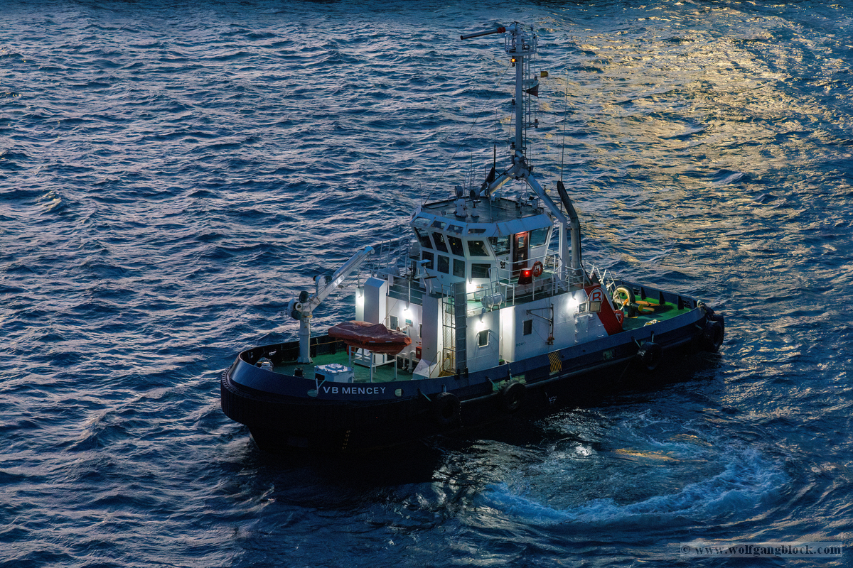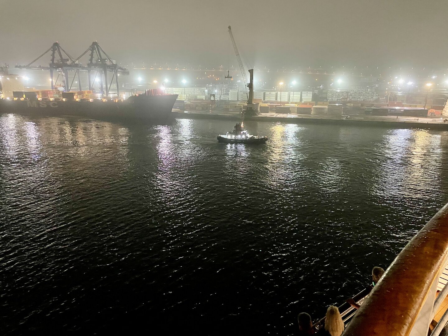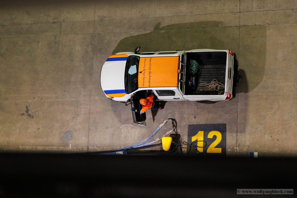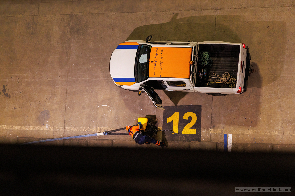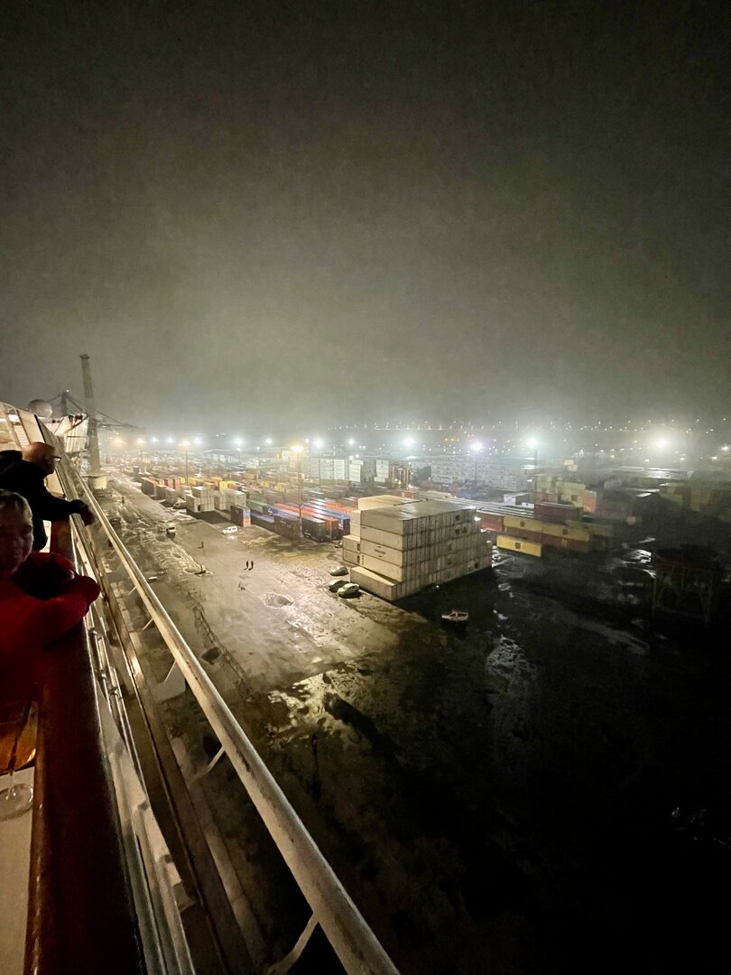 Wir glitten langsam an anderen Schiffen im Hafen vorbei. Überall herrschte emsige Betriebsamkeit unter dem grellen Licht der Hafenstrahler. Besonders beeindruckend wirkten die massiven Industrieschiffe, wie der Frachter Star Antwerp, die im Scheinwerferlicht fast wie Kulissen aus einem Film wirkten. Das Wasser glitzerte in Gold- und Silbertönen, während die Skyline von Las Palmas langsam am Horizont verblasste. Ein besonderes technisches Schauspiel bot das Lotsenboot (Pilot). Die wendige, leuchtend rote Barke – die Practicos Las Palmas – begleitete uns ein Stück weit aus dem Hafenbecken heraus. Von oben wirkte das Boot wie ein kleines, leuchtendes Spielzeug vor der massiven Bordwand der Luna, fokussiert im Scheinwerferkegel.