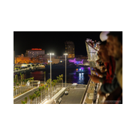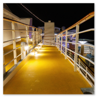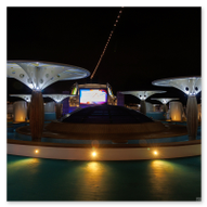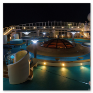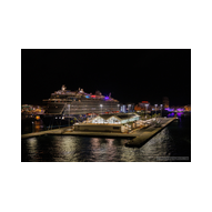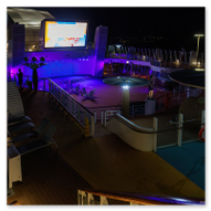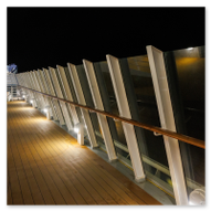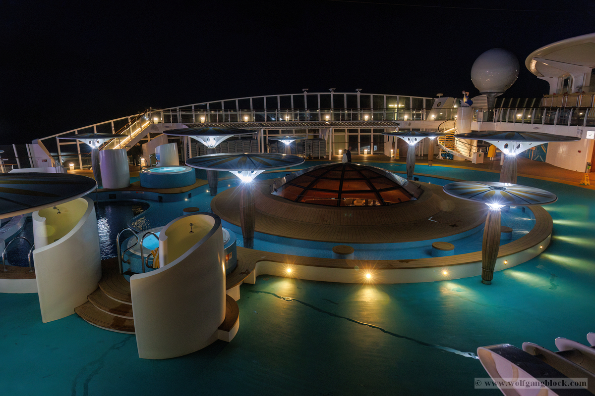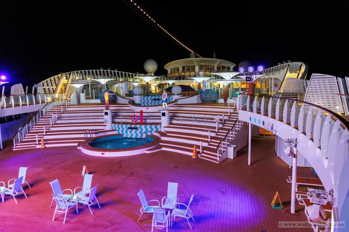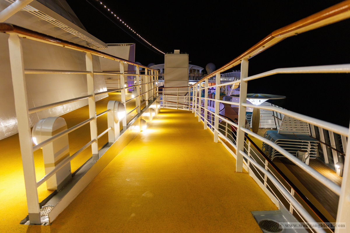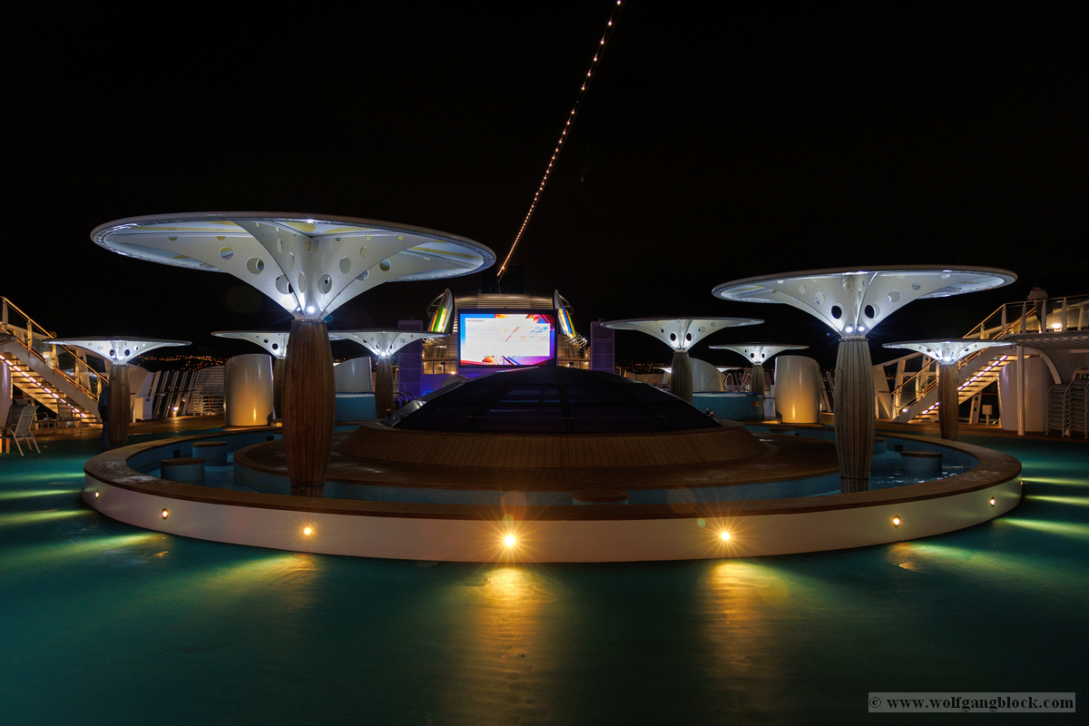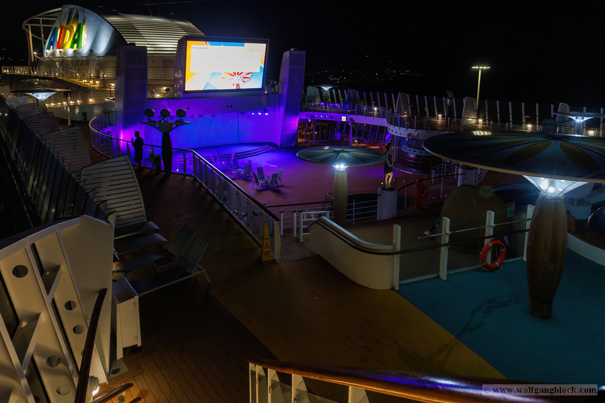 Bevor wir uns nun wieder in den Schiffsbauch begaben, habe ich noch ein paar Nachtbilder oben an Bord vom Schiff geschossen. Die Atmosphäre zu dieser späten Stunde ist einmalig: Der Fahrtwind ist kühler, das Schiff gleitet fast lautlos durch die Dunkelheit und die Decksbeleuchtung zaubert grafische Muster auf den Boden. Ein besonderer Spot war der beleuchtete "Helipad" am Heck. Die gelbe Sonnen-Grafik auf dem runden Sonnenschirm leuchtete unter den Strahlern intensiv auf und bildete einen scharfen Kontrast zum schwarzen Wasser unter uns. In der Ferne passierten wir den beleuchteten Containerterminal, dessen Kräne wie futuristische Denkmäler in den Nachthimmel ragten. Von der Reling aus warfen wir einen letzten Blick zurück auf die Küstenlinie von Gran Canaria. Las Palmas war nur noch ein schmales, funkelndes Band aus Lichtern am Horizont, das langsam in der Weite des Ozeans versank. Es war dieser Moment der totalen Ruhe an Deck, in dem man realisiert, dass man nun wirklich „draußen“ auf dem Atlantik ist. Die Architektur der AIDAluna wirkte in diesem künstlichen Licht fast schon unwirklich. Die leeren, perfekt ausgeleuchteten Promenaden mit ihren runden Bodenleuchten luden dazu ein, die Symmetrie und das Design des Schiffes noch einmal ganz ohne Menschenmassen festzuhalten. Jedes Detail, von den warmen Holztönen der Reling bis hin zur kühlen weißen Struktur der Aufbauten, kam im Scheinwerferlicht erst richtig zur Geltung. Danach sind wir ins Atrium zur Show gegangen, um den ersten Abend an Bord mit erstklassigem Entertainment ausklingen zu lassen. Während die Künstler auf der Bühne ihr Bestes gaben, pflügte die Luna unbeirrt durch die Wellen, Kurs Lanzarote.