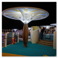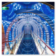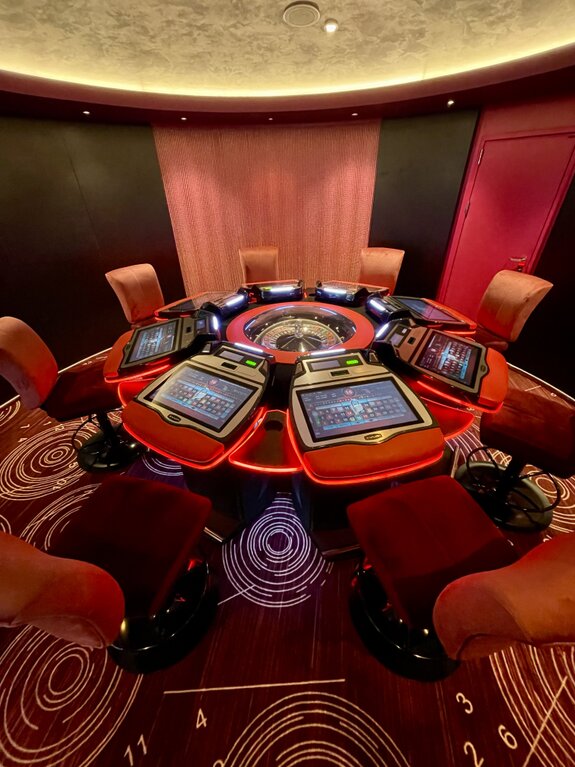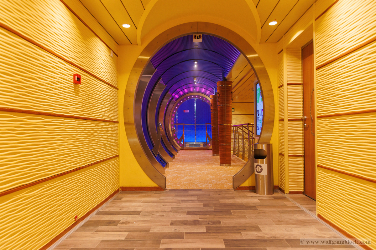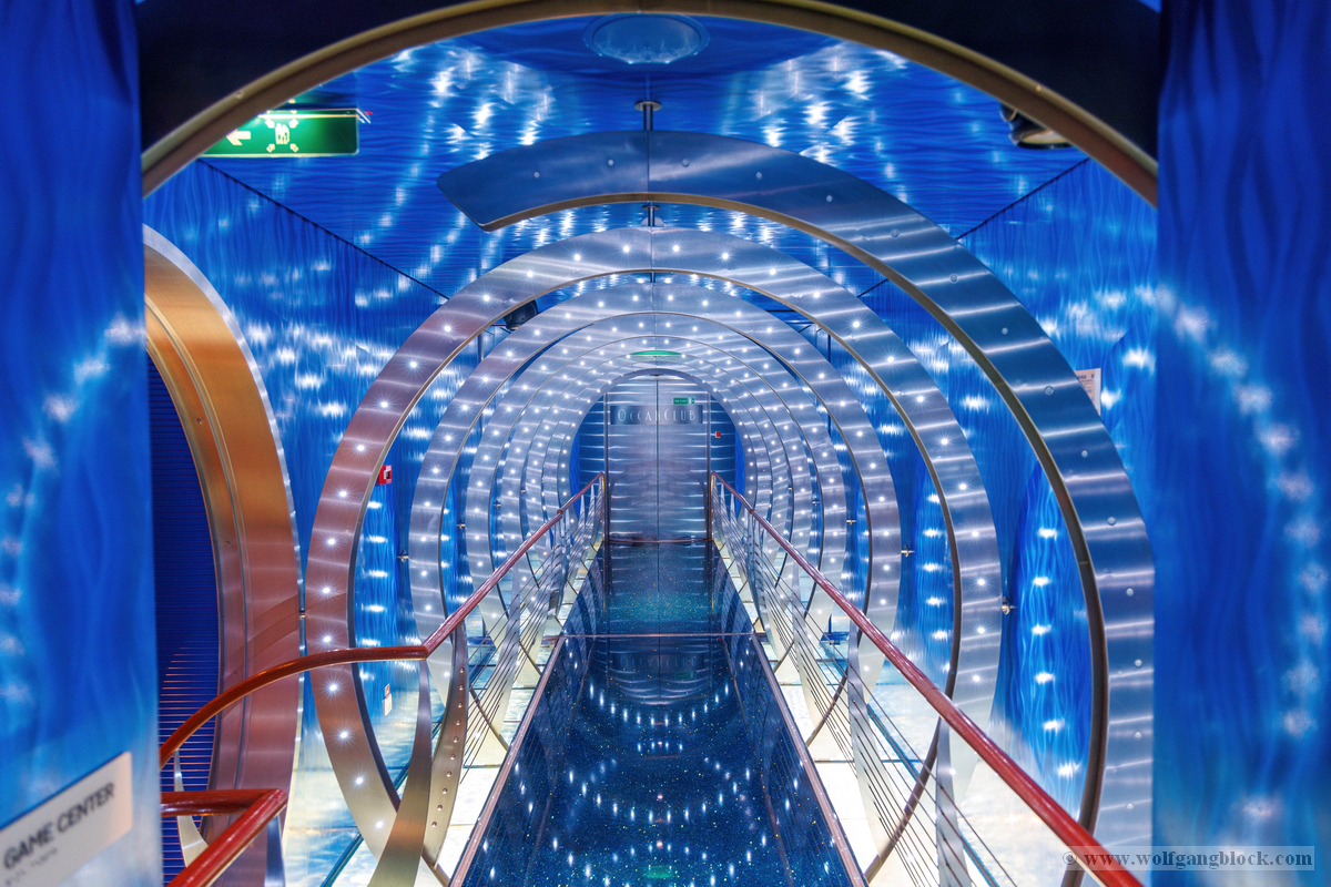 Kurz vor dem Übergang in die Partybereiche stießen wir auf ein fast schon futuristisches Designelement: Ein kreisförmiges Portal, das mit intensivem lila Licht inszeniert wurde. Es wirkt wie ein Tor in eine andere Dimension. Noch beeindruckender war jedoch der Zugang zum Ocean Club. Hier wandelt man durch einen Tunnel aus konzentrischen Lichtringen, die in tiefem Blau erstrahlen. Der hochglänzende Boden reflektiert das Licht und erzeugt eine fast surreale Tiefenwirkung – ein Paradies für jeden Fotografen, der mit Lichtstimmungen spielt. Es fühlte sich an wie ein High-Tech-Transit in eine andere Welt.