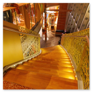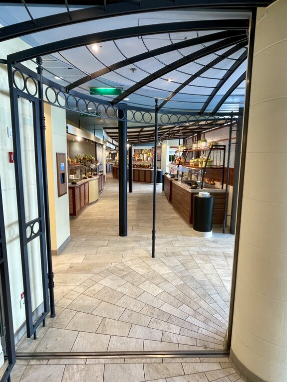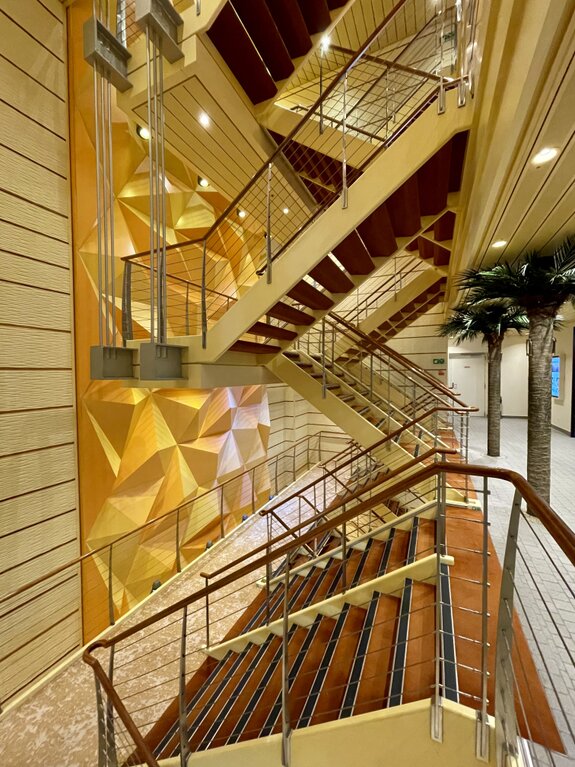 Auf unserem Weg durch die verschiedenen Decks fielen uns immer wieder die spektakulären Treppenhäuser ins Auge. Die Architektur der Sphinx-Klasse ist hier besonders gut sichtbar: Die Treppen winden sich in warmen Holztönen über mehrere Etagen, flankiert von Palmen, die mitten im Schiff für Urlaubsflair sorgen. Ein besonderes fotografisches Highlight war der Blick hinunter in die Kunstgalerie. Von der geschwungenen Treppe aus, deren Geländer mit einem markanten Kreismuster verziert ist, eröffnet sich ein Blick auf eine Welt voller Farben und Kreativität. Die ausgestellten Werke bilden einen spannenden Kontrast zur sonst so funktionalen Schiffsarchitektur.