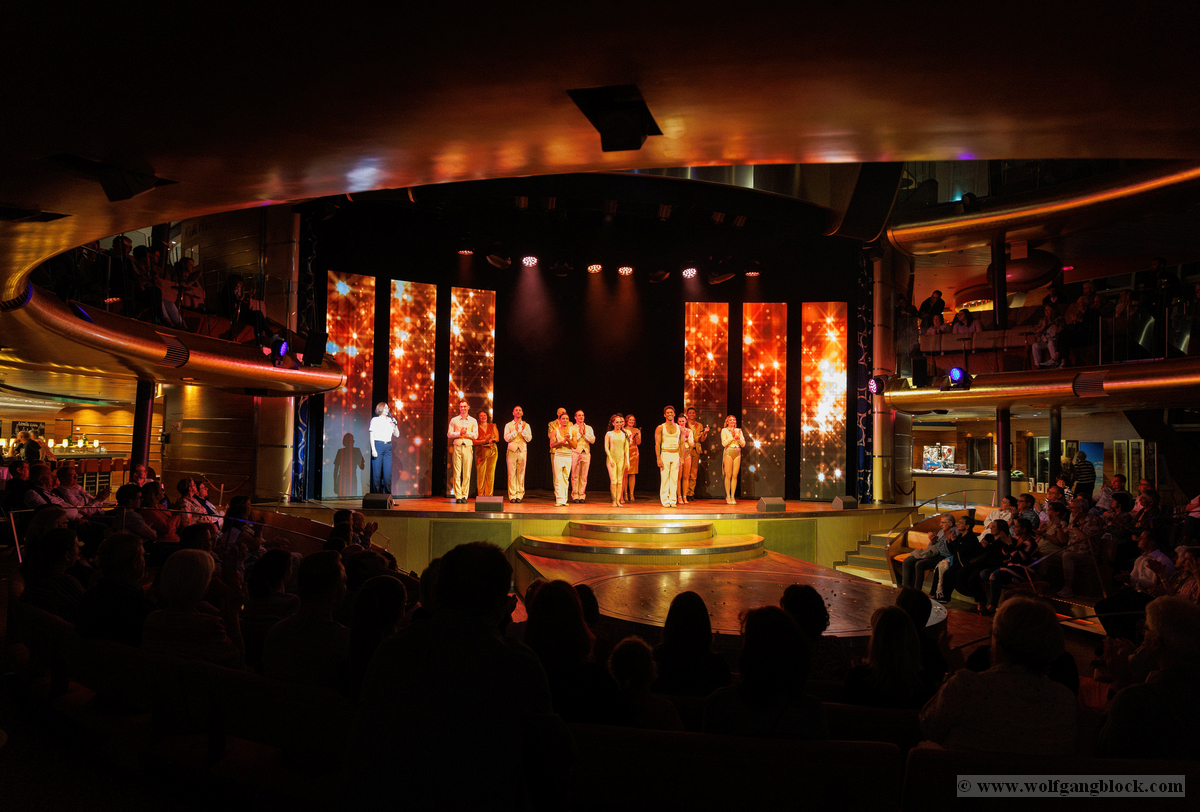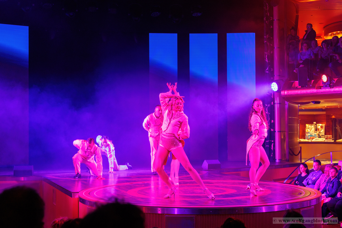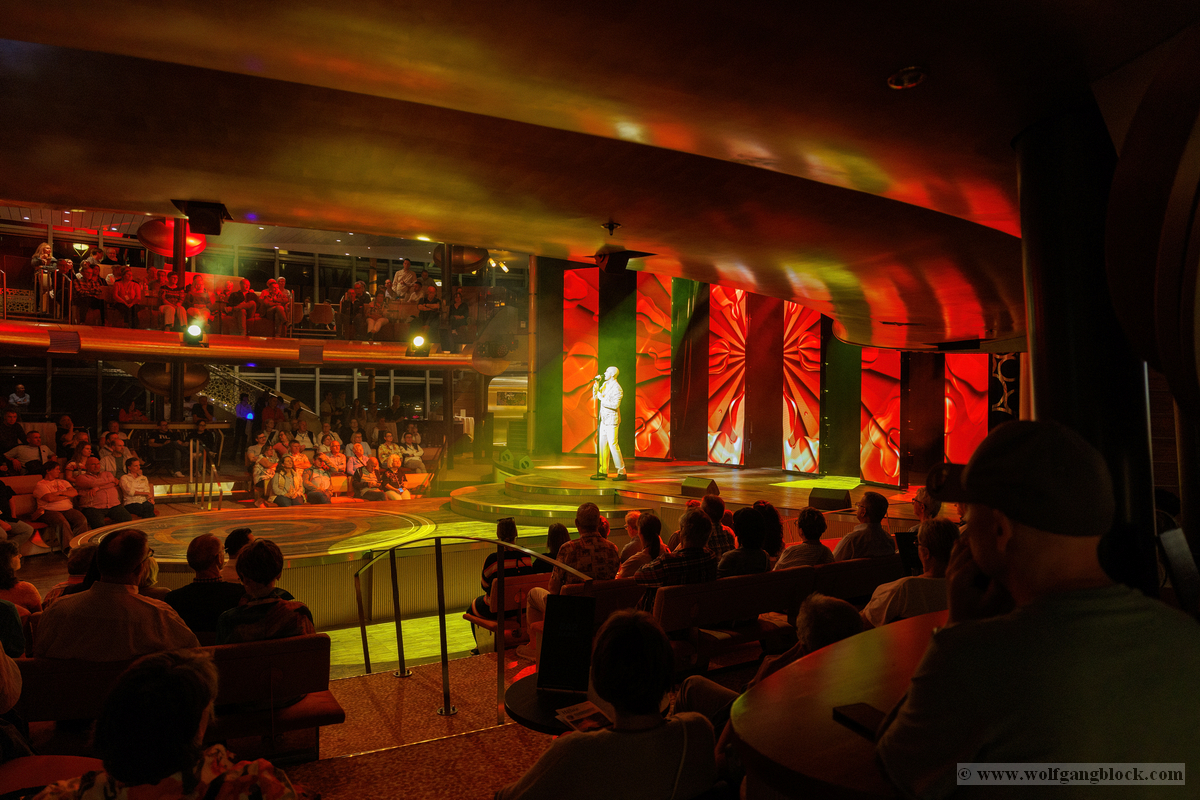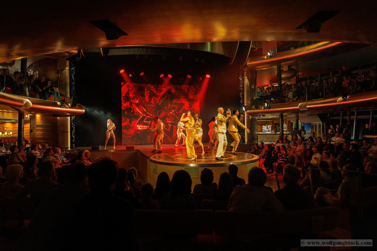 Vom kühlen Nachtwind an Deck zog es uns schließlich wieder zurück ins lebendige Herz des Schiffes. Im Theatrium hatte die Abendshow bereits begonnen und wir tauchten ein in eine Welt aus Licht, Musik und purer Energie. Das architektonische Konzept des Theatriums über drei Ebenen bietet von überall eine tolle Sicht, doch wir suchten uns einen strategisch günstigen Platz in einer der Lounges, um das Geschehen auf der Bühne festzuhalten. Die Bühne war in intensives, pinkfarbenes und violettes Licht getaucht, als das AIDA-Show-Ensemble die Szene übernahm. Die Kostüme glitzerten unter den Scheinwerfern, während die Künstler mit einer dynamischen Tanz-Performance den Raum füllten. Die Energie war im gesamten Zuschauerraum greifbar – ein mitreißender Mix aus modernen Rhythmen und klassischem Varieté-Flair. Ein absoluter Höhepunkt war die Akrobatik-Einlage. Eine Künstlerin zeigte eine atemberaubende Performance an den Vertikaltüchern, hoch über den Köpfen der Zuschauer. Zuerst in dramatisches rotes Licht gehüllt, wirkten die Figuren fast mystisch und zeigten eine unglaubliche Körperbeherrschung. Später wechselte die Stimmung in ein strahlendes Goldweiß, was die Eleganz und Leichtigkeit der Bewegungen unterstrich. Für Wolfgang war dies der perfekte Test für den schnellen Autofokus der R6 II – die scharfen Linien des Körpers gegen den farbigen Hintergrund ergaben fantastische Aufnahmen. Kurz darauf vereinte sich das gesamte Ensemble zum großen Finale. In ihren schimmernden, hellen Kostümen füllten sie die Bühne mit einer unglaublichen Präsenz. Die Choreografien waren perfekt auf die rhythmischen Klänge abgestimmt, und die Lichteffekte tanzten förmlich mit den Künstlern. Es war die ideale Mischung aus Glamour und moderner Show-Action. Zum Abschluss verneigten sich die Künstler unter dem donnernden Applaus des Publikums. Die LED-Wände im Hintergrund zeigten funkelnde Grafiken, die die festliche Stimmung perfekt abrundeten. Es war der ideale emotionale Abschluss für unseren ersten Tag – ein Tag, der mit dem Kofferpacken in Frankfurt begann und nun mit stehenden Ovationen auf dem Atlantik endete. Mit diesen farbenfrohen Bildern und dem Rhythmus der Show im Kopf begaben wir uns schließlich zurück in unseren „Bunker“ auf Deck 8. Die Luna pflügte währenddessen unbeirrt durch die Dunkelheit des Atlantiks, Kurs Lanzarote.