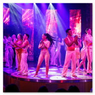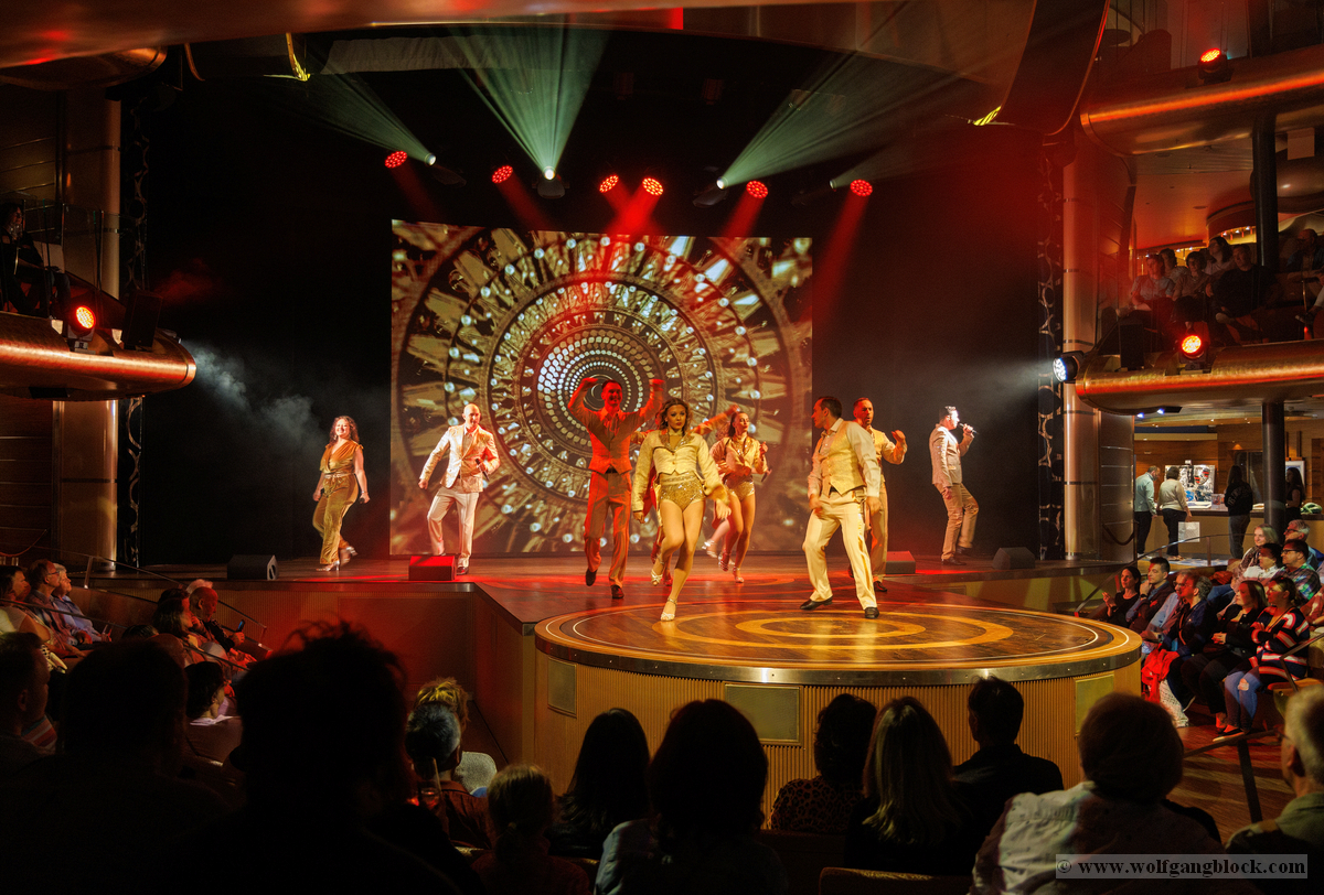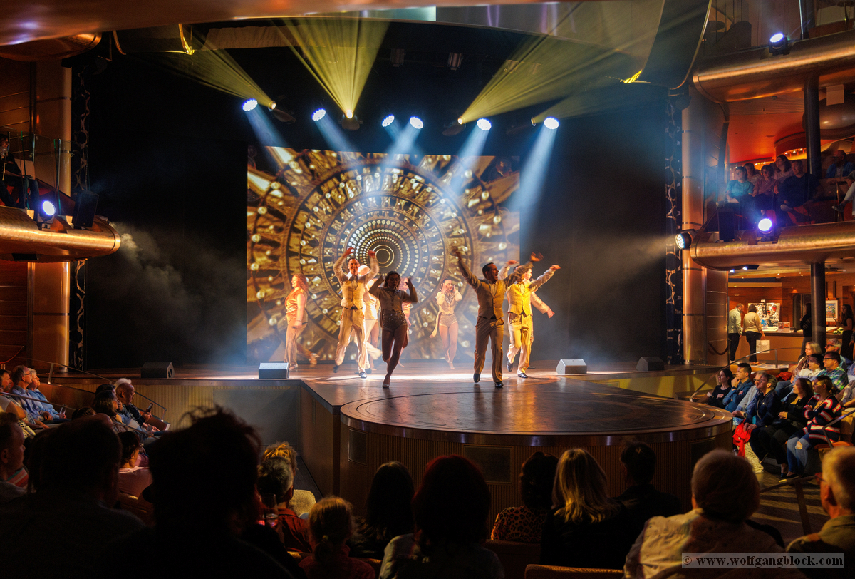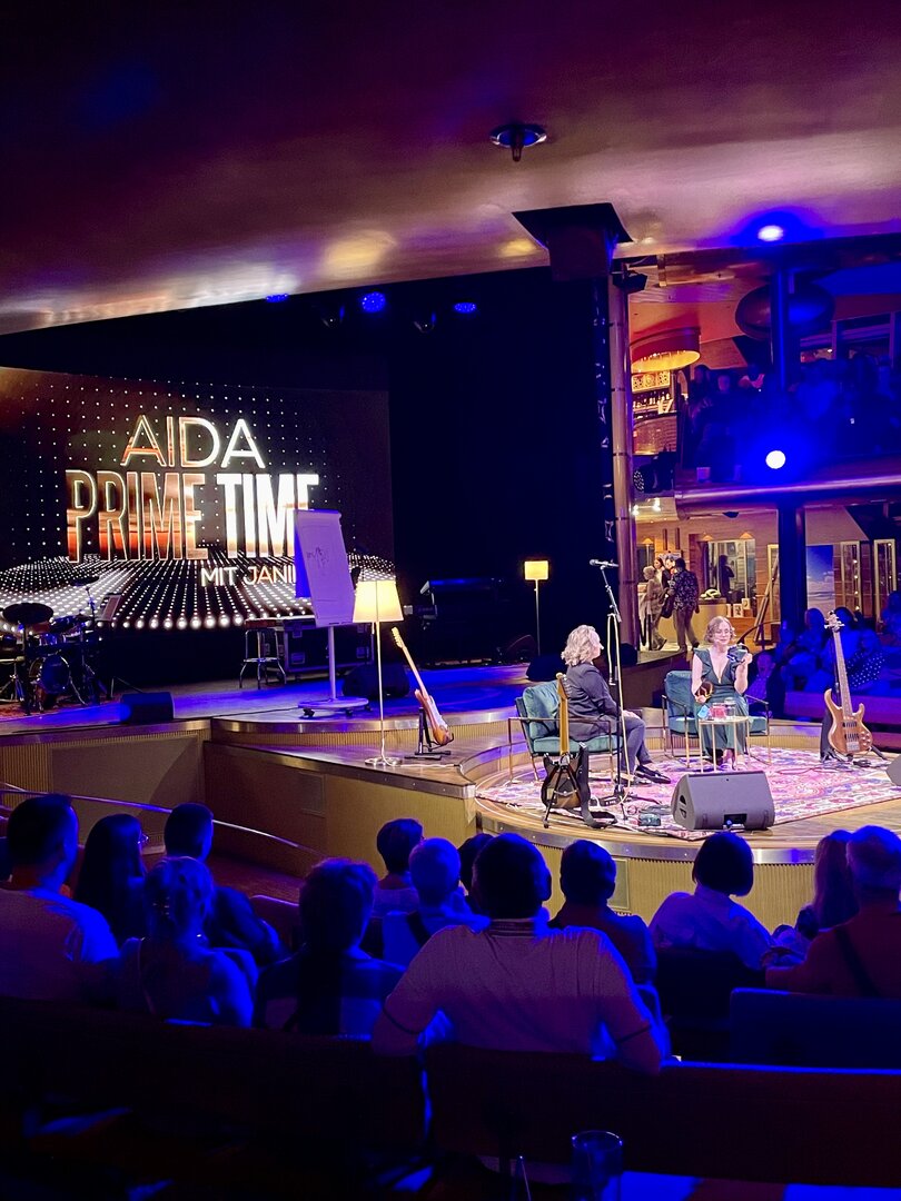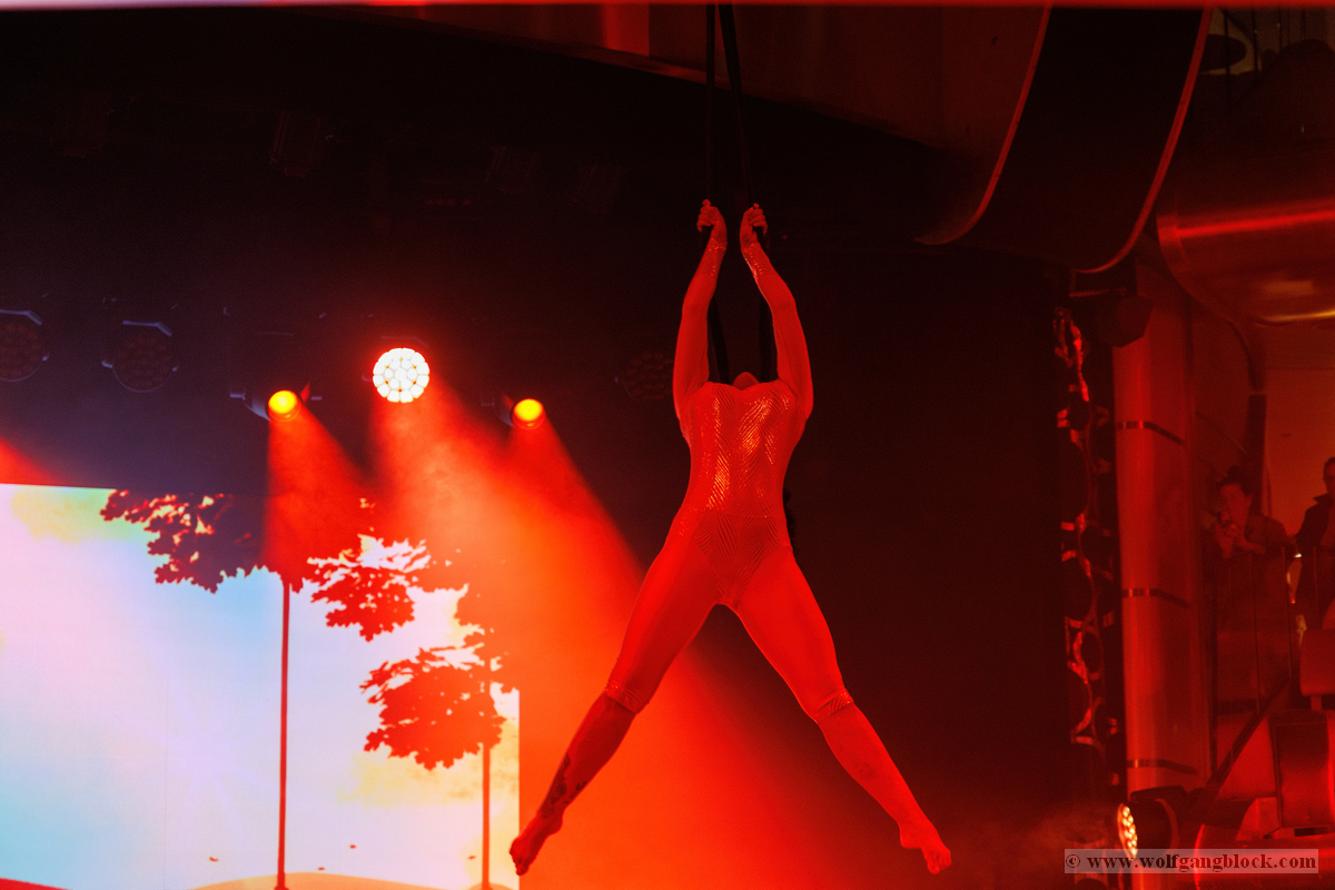 Vom kühlen Nachtwind an Deck zog es uns schließlich wieder zurück ins lebendige Herz des Schiffes. Im Theatrium hatte die Abendshow bereits begonnen und wir tauchten ein in eine Welt aus Licht, Musik und purer Energie. Das architektonische Konzept des Theatriums über drei Ebenen bietet von überall eine tolle Sicht, doch wir suchten uns einen strategisch günstigen Platz in einer der Lounges, um das Geschehen auf der Bühne festzuhalten. Die Bühne war in intensives, pinkfarbenes und violettes Licht getaucht, als das AIDA-Show-Ensemble die Szene übernahm. Die Kostüme glitzerten unter den Scheinwerfern, während die Künstler mit einer dynamischen Tanz-Performance den Raum füllten. Die Energie war im gesamten Zuschauerraum greifbar – ein mitreißender Mix aus modernen Rhythmen und klassischem Varieté-Flair. Ein absoluter Höhepunkt war die Akrobatik-Einlage. Eine Künstlerin zeigte eine atemberaubende Performance an den Vertikaltüchern, hoch über den Köpfen der Zuschauer. Zuerst in dramatisches rotes Licht gehüllt, wirkten die Figuren fast mystisch und zeigten eine unglaubliche Körperbeherrschung. Später wechselte die Stimmung in ein strahlendes Goldweiß, was die Eleganz und Leichtigkeit der Bewegungen unterstrich. Für Wolfgang war dies der perfekte Test für den schnellen Autofokus der R6 II – die scharfen Linien des Körpers gegen den farbigen Hintergrund ergaben fantastische Aufnahmen. Kurz darauf vereinte sich das gesamte Ensemble zum großen Finale. In ihren schimmernden, hellen Kostümen füllten sie die Bühne mit einer unglaublichen Präsenz. Die Choreografien waren perfekt auf die rhythmischen Klänge abgestimmt, und die Lichteffekte tanzten förmlich mit den Künstlern. Es war die ideale Mischung aus Glamour und moderner Show-Action. Zum Abschluss verneigten sich die Künstler unter dem donnernden Applaus des Publikums. Die LED-Wände im Hintergrund zeigten funkelnde Grafiken, die die festliche Stimmung perfekt abrundeten. Es war der ideale emotionale Abschluss für unseren ersten Tag – ein Tag, der mit dem Kofferpacken in Frankfurt begann und nun mit stehenden Ovationen auf dem Atlantik endete. Mit diesen farbenfrohen Bildern und dem Rhythmus der Show im Kopf begaben wir uns schließlich zurück in unseren „Bunker“ auf Deck 8. Die Luna pflügte währenddessen unbeirrt durch die Dunkelheit des Atlantiks, Kurs Lanzarote.