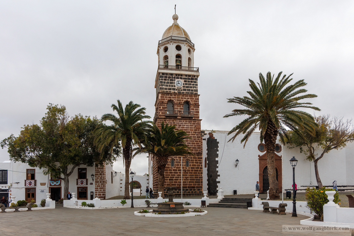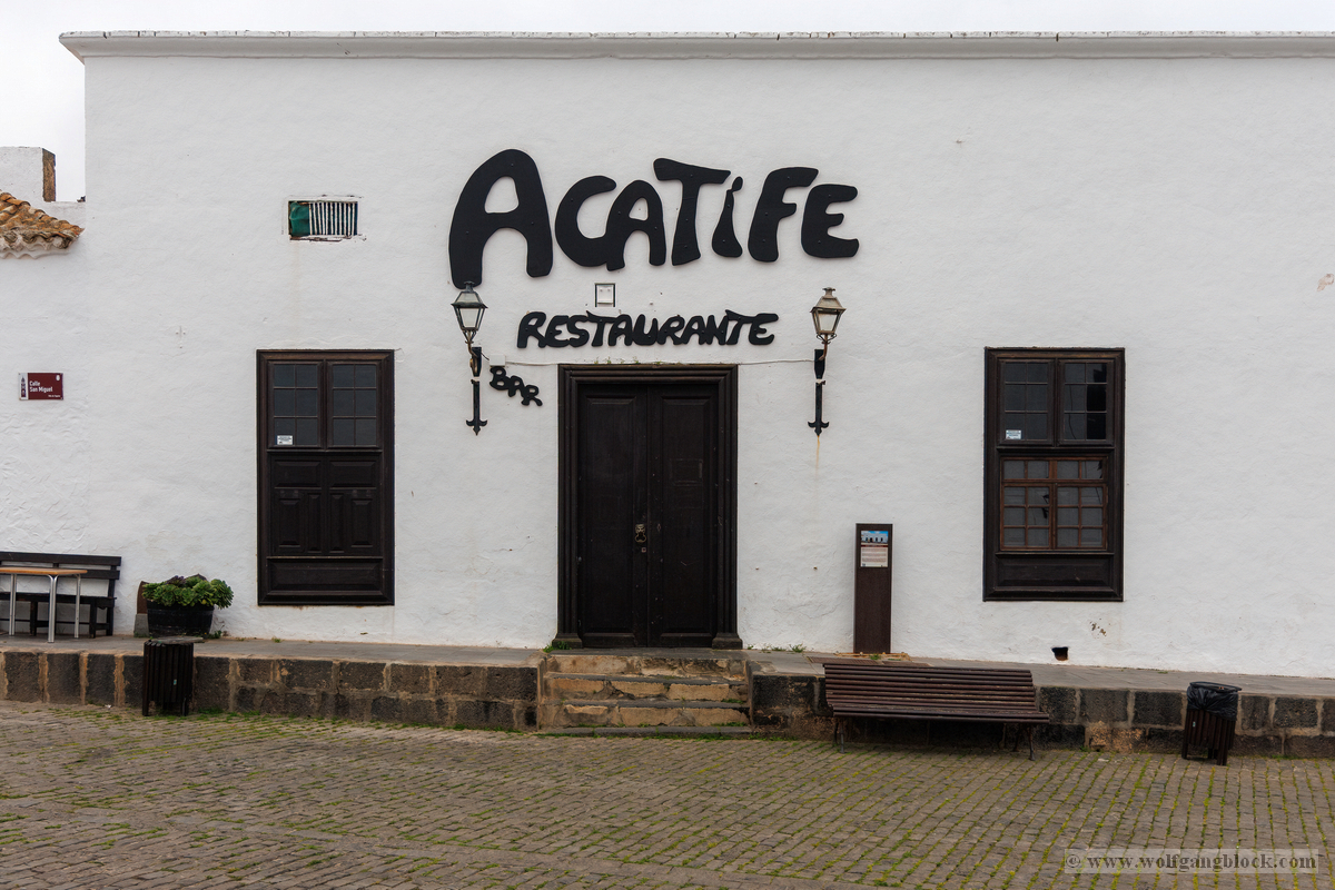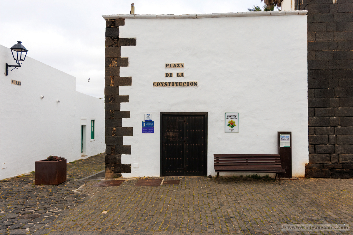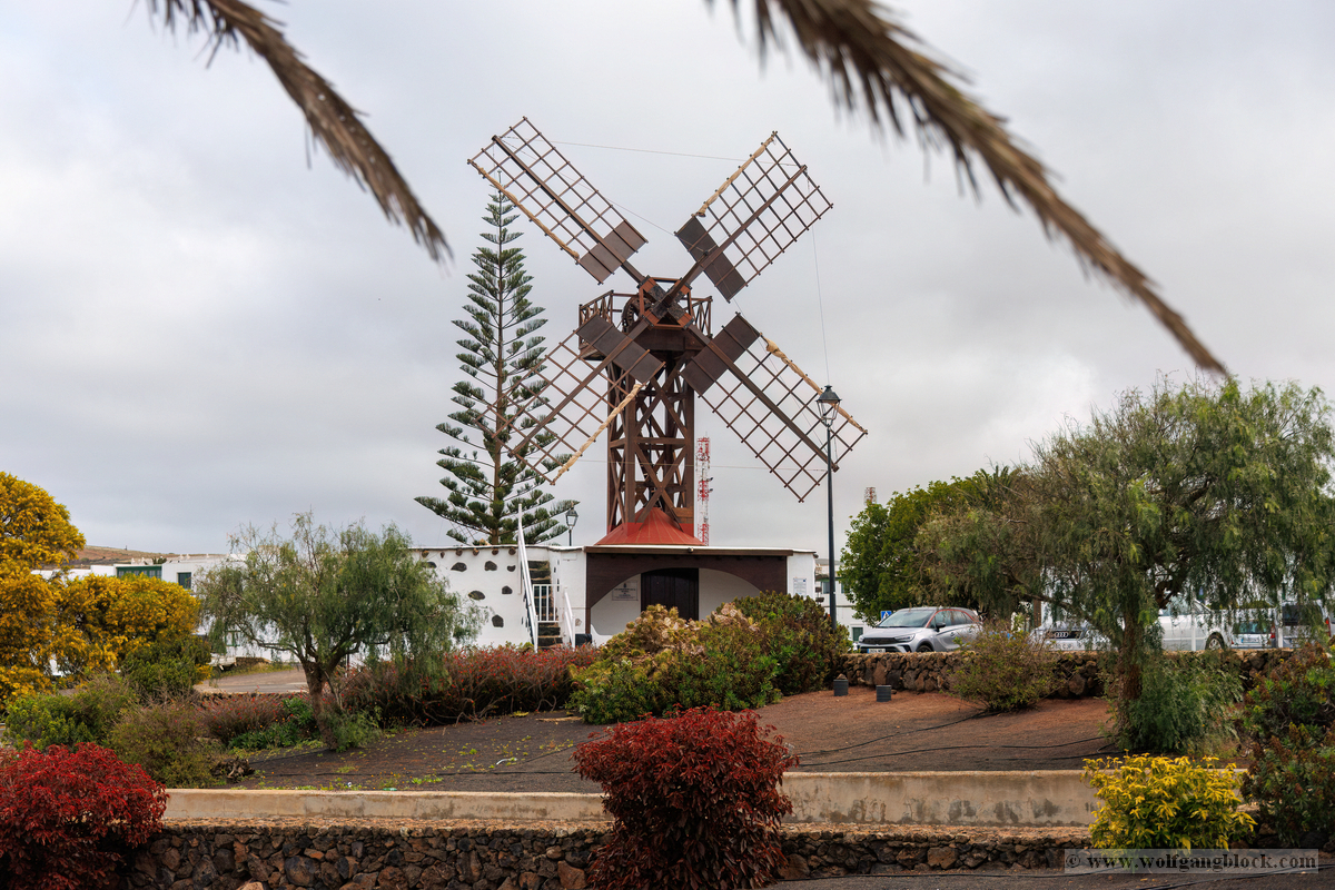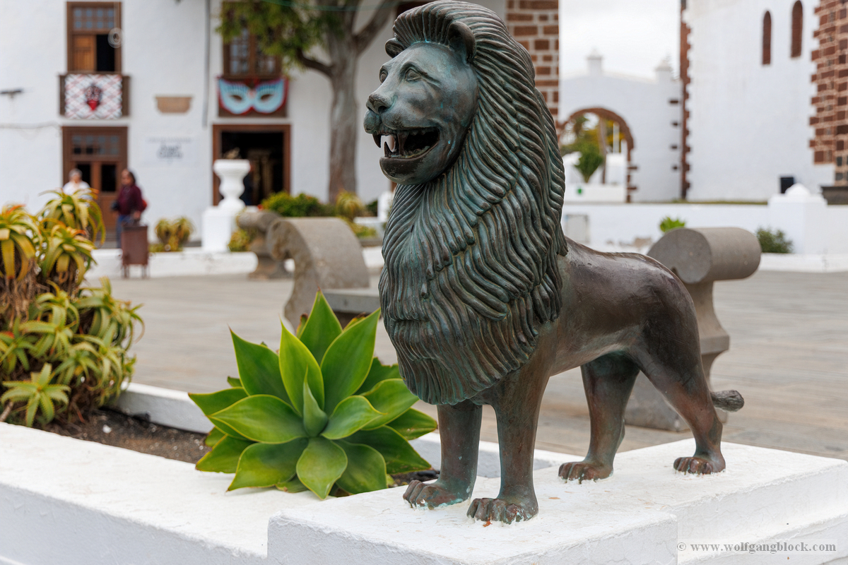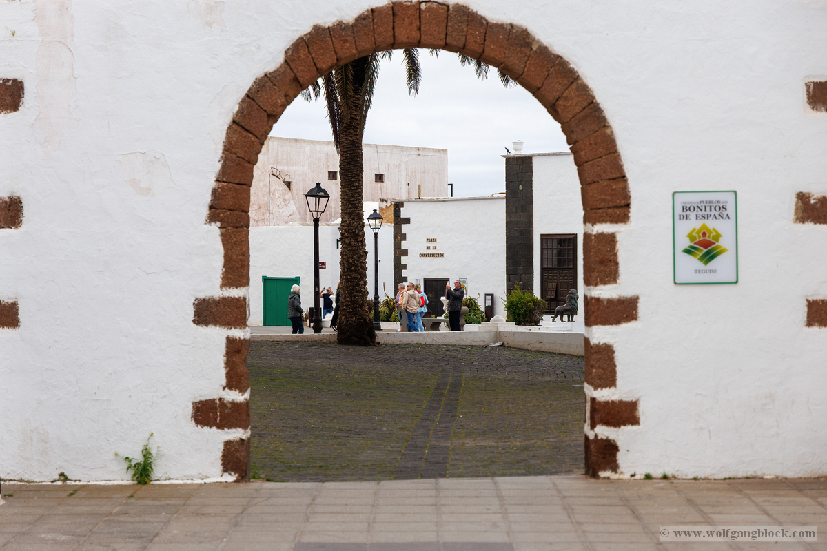 Nach der Infiltration von Lagomar setzte unsere Kolonne die Fahrt fort. Nächstes Ziel: Das historische Teguise, die ehemalige Hauptstadt der Insel. Wir hatten ein enges Zeitfenster von nur 30 Minuten – eine taktische Herausforderung für jeden Fotografen, aber genug Zeit, um die Essenz dieses geschichtsträchtigen Ortes zu sichern. Teguise empfing uns mit einer fast schon meditativen Ruhe und einer architektonischen Reinheit, die in jedem Pixel unserer Aufnahmen spürbar wurde.Schon am Ortsrand fiel unser Blick auf eine klassische Windmühle (Molino), deren hölzerne Flügel majestätisch gegen den wolkenverhangenen Himmel ragten. Sie ist ein stummer Zeuge der landwirtschaftlichen Vergangenheit Lanzarotes und ein perfektes Motiv, um die Harmonie zwischen traditioneller Technik und der rauen Natur festzuhalten. Besonders die Details der Holzkonstruktion und die Einbettung in die schwarze Vulkanerde boten spannende Kontraste, die wir durch das dichte Blattwerk der Palmen hindurch dramatisch inszenierten. Wir näherten uns dem Herzen des Ortes durch einen rustikalen Rundbogen aus braunem Vulkangestein. Dieser steinerne Torbogen gewährte uns einen ersten Blick auf die Plaza de la Constitución und diente gleichzeitig als natürlicher Rahmen für das Treiben auf dem Platz. Ein kleines Schild an einer der strahlend weißen Wände wies stolz darauf hin, dass Teguise zu den „Pueblos más bonitos de España“ zählt – eine Auszeichnung, die wir angesichts der symmetrischen Ästhetik sofort bestätigen konnten. Die Plaza de la Constitución selbst ist ein Musterbeispiel für die Gestaltungskraft Lanzarotes. Ein schlichtes, aber wirkungsvolles Schild mit der Aufschrift „PLAZA DE LA CONSTITUCION“ zierte eine der weißen Mauern, direkt neben einer dunklen Holztür und einer einladenden Bank. Diese Reduktion auf das Wesentliche – Weiß, Braun und das raue Schwarz des Lavagesteins an den Gebäudeecken – zieht sich durch das gesamte Dorf. Ein besonderer Blickfang an der Plaza war die bronzene Löwenstatue, die auf einem schlichten weißen Sockel thronte. Das Maul zum Brüllen geöffnet, bildete die dunkle Patina des Metalls einen scharfen Kontrast zum hellen Mauerwerk im Hintergrund. Direkt daneben lieferte das Casa-Museo del Timple erstklassige forensische Details: Die dunkle, kunstvoll geschnitzte Holztür und die perfekt ausgerichteten Fensterrahmen hoben sich kontrastreich von der makellos weißen Fassade ab. Ein weiteres kulturelles Zeugnis der Inseltradition entdeckten wir inmitten der kargen Aloe-Vera-Pflanzen: Die bronzene Statue eines Tamborilero (Tamburin-Tänzers). Die gebeugte Haltung des Musikers und die Detailtiefe der Skulptur fingen die lebendige Folklore Lanzarotes perfekt ein – ein stilles, aber kraftvolles Motiv vor der Kulisse der weißen Häuserfronten. Den architektonischen Fixpunkt bildete die Kirche Nuestra Señora de Guadalupe. Der imposante Glockenturm mit seinem dunklen Steinmauerwerk und der markanten Kuppel ragte über die Palmenwipfel hinaus. Besonders faszinierend war ein Detail an der Kirchenwand: Ein Portal aus rötlichem Lavagestein, über dem zwei kreisförmige Fenster wie Augen wirkten – eine fast schon anthropomorphe Fassade, die uns zum Innehalten zwang. Der Kontrast zwischen dem grauen Himmel, dem dunklen Stein und dem strahlenden Weiß der umliegenden Gebäude war fotografisch extrem reizvoll. Selbst moderne Elemente wie der Eingang einer CaixaBank, der in einen massiven, roten Gesteinsrahmen in eine alte Mauer eingelassen war, fügten sich nahtlos in das Bild ein und zeigten, wie Tradition und Moderne hier koexistieren. Die schmalen Gassen mit ihren Kopfsteinpflastern und den leuchtend grünen Türen lieferten uns immer wieder neue Perspektiven. Besonders das Artesanía Lanzarotena, mit seinen geschnitzten Holzfiguren an der Fassade und dem satten Grün der Tür, war ein Beweis für die lebendige Handwerkstradition des Ortes. Auch das Restaurant Acatife mit seinem markanten schwarzen Schriftzug auf weißem Grund fügte sich perfekt in die grafische Ordnung von Teguise ein. Jede Ecke schien wie für den Sucher der R6 II komponiert zu sein. Teguise fühlte sich an wie eine Zeitkapsel. Nach 30 Minuten intensiver Dokumentation war es Zeit für den Rückzug zum Jeep. Die Akkus der Kameras glühten, doch die Speicherkarten waren um einige wertvolle Beweisstücke reicher.