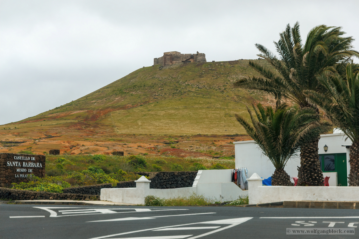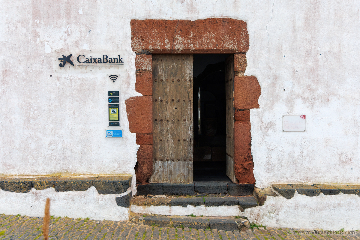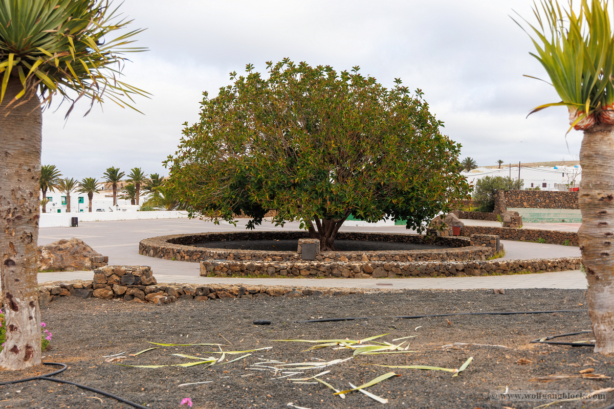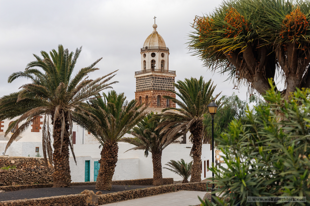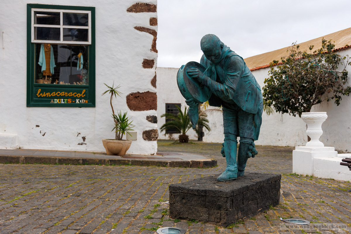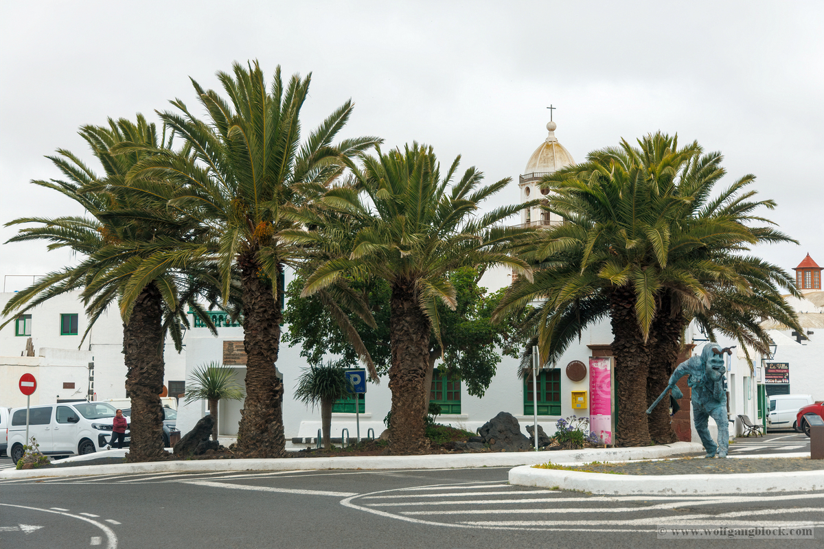 Nach der Infiltration von Lagomar setzte unsere Kolonne die Fahrt fort. Nächstes Ziel: Das historische Teguise, die ehemalige Hauptstadt der Insel. Wir hatten ein enges Zeitfenster von nur 30 Minuten – eine taktische Herausforderung für jeden Fotografen, aber genug Zeit, um die Essenz dieses geschichtsträchtigen Ortes zu sichern. Teguise empfing uns mit einer fast schon meditativen Ruhe und einer architektonischen Reinheit, die in jedem Pixel unserer Aufnahmen spürbar wurde.Schon am Ortsrand fiel unser Blick auf eine klassische Windmühle (Molino), deren hölzerne Flügel majestätisch gegen den wolkenverhangenen Himmel ragten. Sie ist ein stummer Zeuge der landwirtschaftlichen Vergangenheit Lanzarotes und ein perfektes Motiv, um die Harmonie zwischen traditioneller Technik und der rauen Natur festzuhalten. Besonders die Details der Holzkonstruktion und die Einbettung in die schwarze Vulkanerde boten spannende Kontraste, die wir durch das dichte Blattwerk der Palmen hindurch dramatisch inszenierten. Wir näherten uns dem Herzen des Ortes durch einen rustikalen Rundbogen aus braunem Vulkangestein. Dieser steinerne Torbogen gewährte uns einen ersten Blick auf die Plaza de la Constitución und diente gleichzeitig als natürlicher Rahmen für das Treiben auf dem Platz. Ein kleines Schild an einer der strahlend weißen Wände wies stolz darauf hin, dass Teguise zu den „Pueblos más bonitos de España“ zählt – eine Auszeichnung, die wir angesichts der symmetrischen Ästhetik sofort bestätigen konnten. Die Plaza de la Constitución selbst ist ein Musterbeispiel für die Gestaltungskraft Lanzarotes. Ein schlichtes, aber wirkungsvolles Schild mit der Aufschrift „PLAZA DE LA CONSTITUCION“ zierte eine der weißen Mauern, direkt neben einer dunklen Holztür und einer einladenden Bank. Diese Reduktion auf das Wesentliche – Weiß, Braun und das raue Schwarz des Lavagesteins an den Gebäudeecken – zieht sich durch das gesamte Dorf. Ein besonderer Blickfang an der Plaza war die bronzene Löwenstatue, die auf einem schlichten weißen Sockel thronte. Das Maul zum Brüllen geöffnet, bildete die dunkle Patina des Metalls einen scharfen Kontrast zum hellen Mauerwerk im Hintergrund. Direkt daneben lieferte das Casa-Museo del Timple erstklassige forensische Details: Die dunkle, kunstvoll geschnitzte Holztür und die perfekt ausgerichteten Fensterrahmen hoben sich kontrastreich von der makellos weißen Fassade ab. Ein weiteres kulturelles Zeugnis der Inseltradition entdeckten wir inmitten der kargen Aloe-Vera-Pflanzen: Die bronzene Statue eines Tamborilero (Tamburin-Tänzers). Die gebeugte Haltung des Musikers und die Detailtiefe der Skulptur fingen die lebendige Folklore Lanzarotes perfekt ein – ein stilles, aber kraftvolles Motiv vor der Kulisse der weißen Häuserfronten. Den architektonischen Fixpunkt bildete die Kirche Nuestra Señora de Guadalupe. Der imposante Glockenturm mit seinem dunklen Steinmauerwerk und der markanten Kuppel ragte über die Palmenwipfel hinaus. Besonders faszinierend war ein Detail an der Kirchenwand: Ein Portal aus rötlichem Lavagestein, über dem zwei kreisförmige Fenster wie Augen wirkten – eine fast schon anthropomorphe Fassade, die uns zum Innehalten zwang. Der Kontrast zwischen dem grauen Himmel, dem dunklen Stein und dem strahlenden Weiß der umliegenden Gebäude war fotografisch extrem reizvoll. Selbst moderne Elemente wie der Eingang einer CaixaBank, der in einen massiven, roten Gesteinsrahmen in eine alte Mauer eingelassen war, fügten sich nahtlos in das Bild ein und zeigten, wie Tradition und Moderne hier koexistieren. Die schmalen Gassen mit ihren Kopfsteinpflastern und den leuchtend grünen Türen lieferten uns immer wieder neue Perspektiven. Besonders das Artesanía Lanzarotena, mit seinen geschnitzten Holzfiguren an der Fassade und dem satten Grün der Tür, war ein Beweis für die lebendige Handwerkstradition des Ortes. Auch das Restaurant Acatife mit seinem markanten schwarzen Schriftzug auf weißem Grund fügte sich perfekt in die grafische Ordnung von Teguise ein. Jede Ecke schien wie für den Sucher der R6 II komponiert zu sein. Teguise fühlte sich an wie eine Zeitkapsel. Nach 30 Minuten intensiver Dokumentation war es Zeit für den Rückzug zum Jeep. Die Akkus der Kameras glühten, doch die Speicherkarten waren um einige wertvolle Beweisstücke reicher.