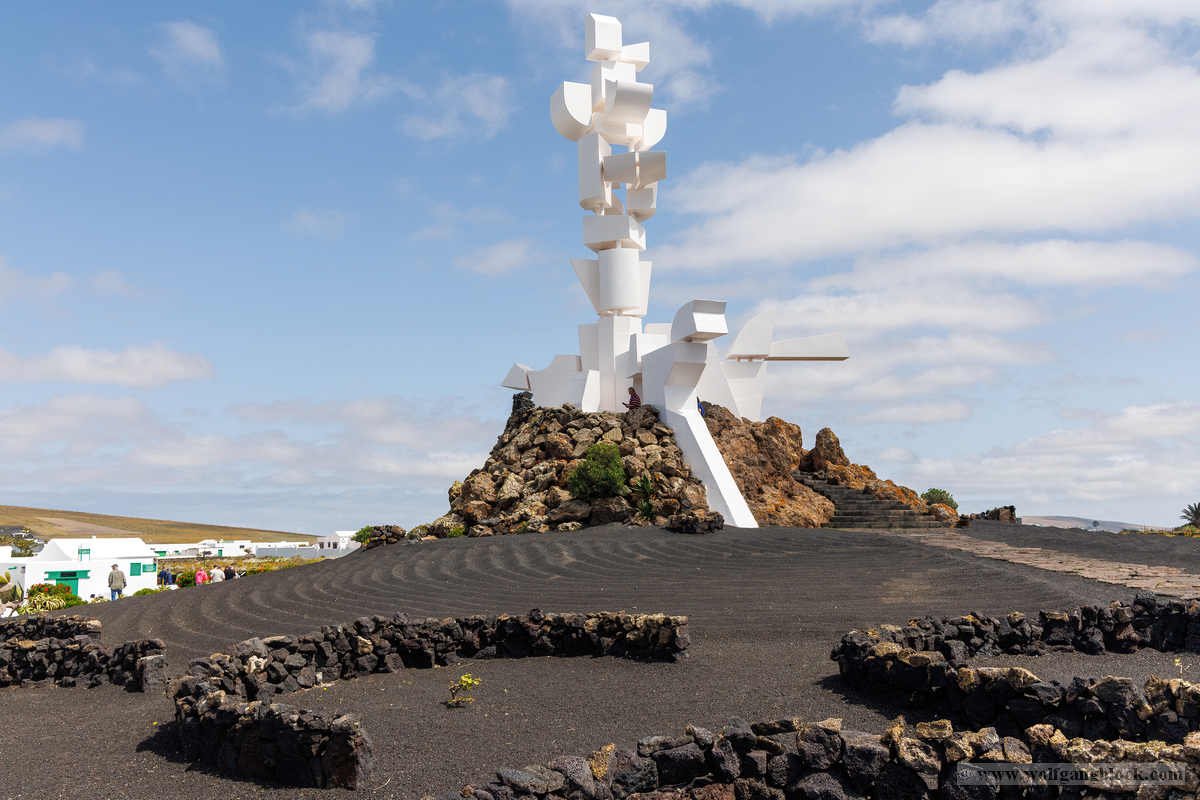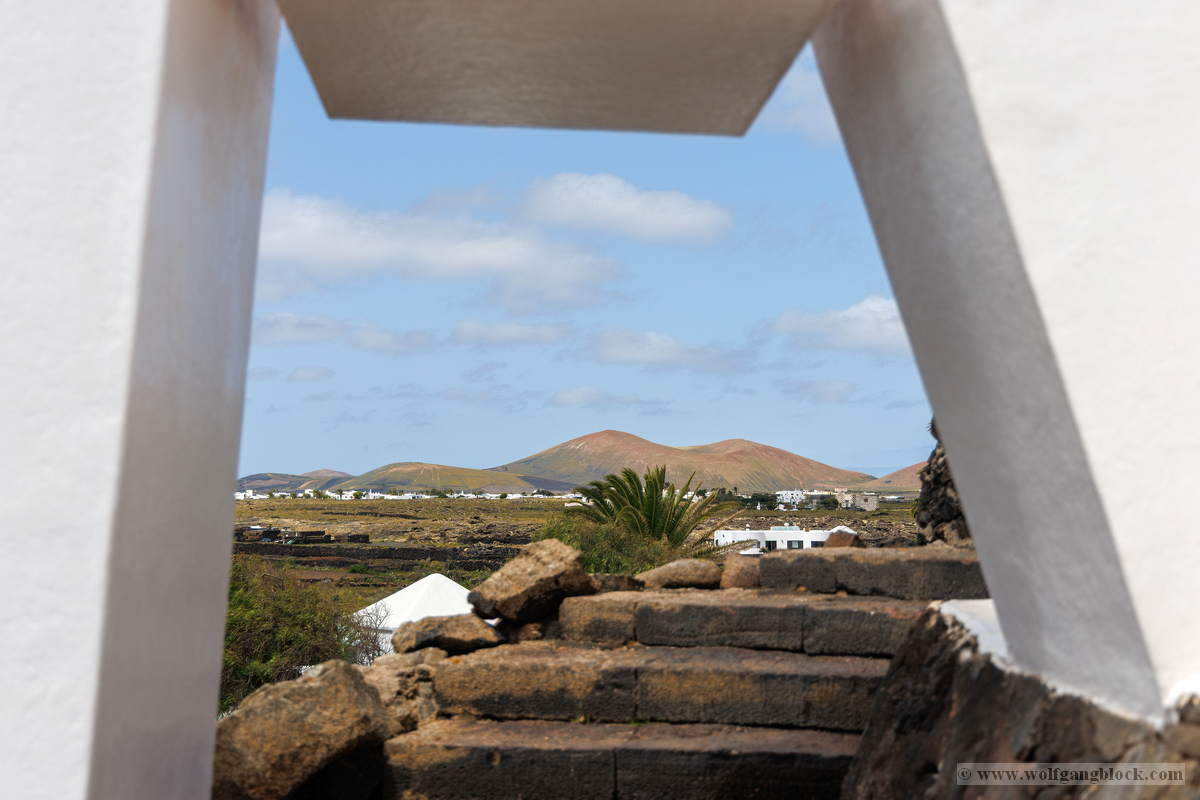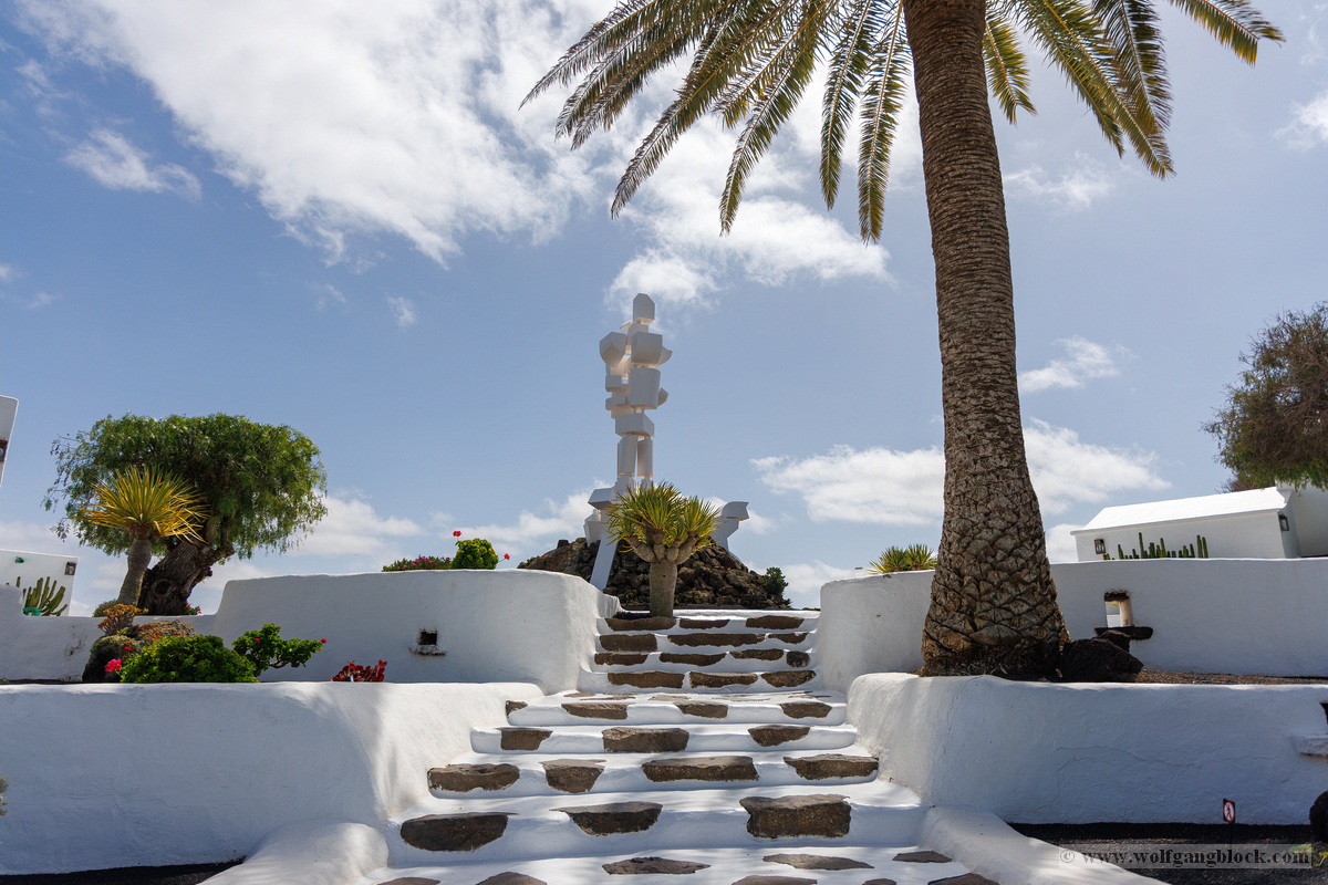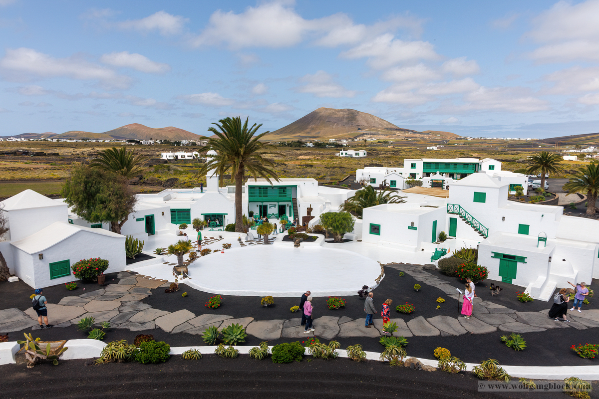 Nach den weiten Feldern von La Geria steuerte unsere Jeep-Kolonne das geografische Herz der Insel an: San Bartolomé. Hier ragt das Monumento a la Fecundidad (Denkmal der Fruchtbarkeit) majestätisch in den blauen Himmel. César Manrique schuf dieses 15 Meter hohe, strahlend weiße Monument als tiefe Verbeugung vor den Bauern der Insel, die der kargen vulkanischen Erde – ihrer „Scholle“ – seit Jahrhunderten mit bloßen Händen das Überleben abringen. Die kubistischen Formen der Skulptur bilden einen harten, fast schon chirurgischen Kontrast zum tiefschwarzen Boden und den ockerfarbenen Vulkanflanken im Hintergrund. Wir näherten uns dem Monument über eine breite Treppe aus dunklem Stein, flankiert von weiß getünchten Mauern und einer mächtigen Palme, die wie ein natürlicher Wächter wirkte. Ein besonderes fotografisches Highlight war das Spiel mit den Sichtachsen der angrenzenden Architektur. Manrique hat hier ein Ensemble geschaffen, das die traditionelle Bauweise Lanzarotes – weiße Mauern, grünes Holz, dunkles Gestein – perfekt konserviert. Besonders faszinierend war eine Perspektive, die wir durch eine der weißen, rechteckigen Maueröffnungen einfingen: Der Blick wurde wie durch einen natürlichen Rahmen direkt auf die fernen Vulkankegel gelenkt. Diese „Rahmung“ der Landschaft ist ein klassisches Element des Manrique-Stils und ein Beweis dafür, wie Architektur die Wahrnehmung von Natur steuern kann. Aus erhöhter Position dokumentierten wir das gesamte Areal der Casa-Museo del Campesino. Der zentrale weiße Platz mit seinem markanten kreisförmigen Bodenmuster wird von einer Reihe niedriger Gebäude umschlossen, deren Fenster und Türen im typischen Lanzarote-Grün leuchten. Es ist ein Ort der Ordnung inmitten der wilden Vulkanlandschaft. In den Außenbereichen entdeckten wir zudem Zeugen der harten landwirtschaftlichen Vergangenheit: Ein historisches, rostiges Ackergerät aus massivem Eisen und Holz stand als stummes Mahnmal auf der dunklen Asche. Trotz der kargen Umgebung bot der Ort überraschende Details für Makro-Aufnahmen. Zwischen den Steinen leuchtete die gelbe Blütenpracht von Sukkulenten hervor, die wir in einer Detailstudie sicherten – ein kleiner, aber kraftvoller Farbtupfer gegen das dominante Weiß und Schwarz des Geländes. Nachdem wir diese architektonische Reinheit gesichert hatten, setzten wir unsere Reise fort. Das Bauerndenkmal war für uns nicht nur ein Fotostopp, sondern eine visuelle Bestätigung dafür, dass auf dieser Insel Kunst und der Kampf um den fruchtbaren Boden untrennbar miteinander verbunden sind.