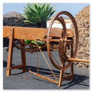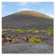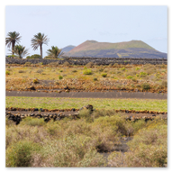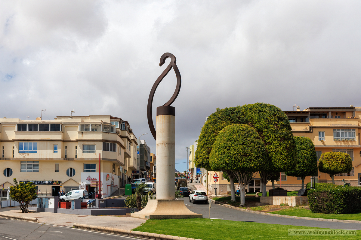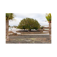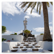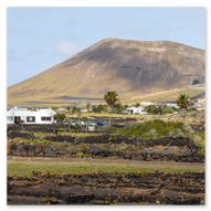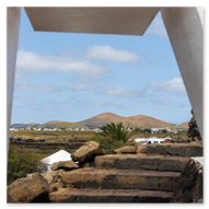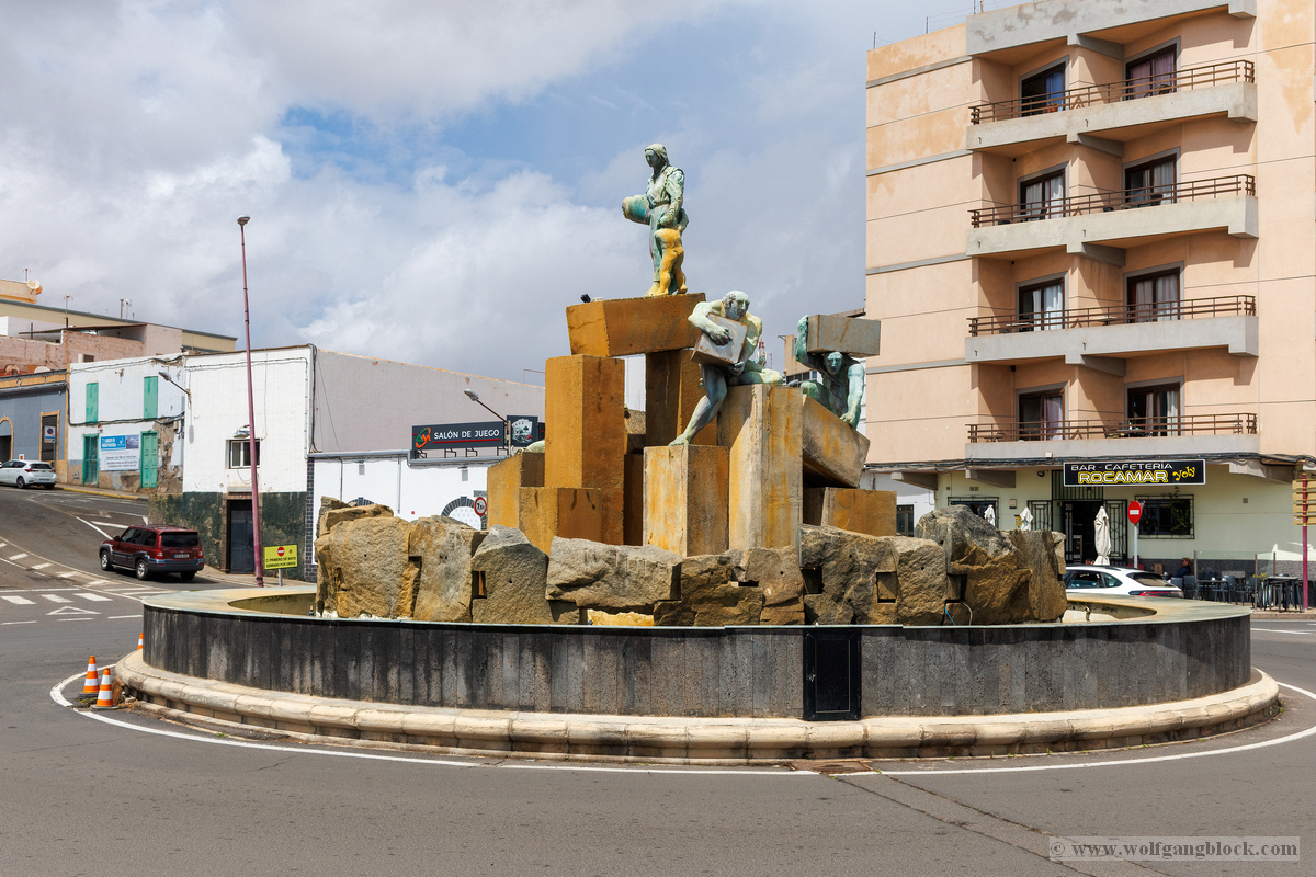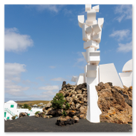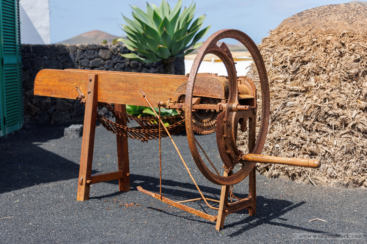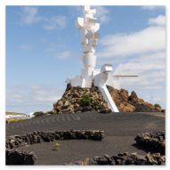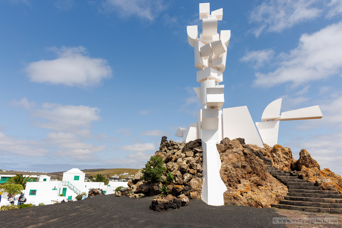 Nach den weiten Feldern von La Geria steuerte unsere Jeep-Kolonne das geografische Herz der Insel an: San Bartolomé. Hier ragt das Monumento a la Fecundidad (Denkmal der Fruchtbarkeit) majestätisch in den blauen Himmel. César Manrique schuf dieses 15 Meter hohe, strahlend weiße Monument als tiefe Verbeugung vor den Bauern der Insel, die der kargen vulkanischen Erde – ihrer „Scholle“ – seit Jahrhunderten mit bloßen Händen das Überleben abringen. Die kubistischen Formen der Skulptur bilden einen harten, fast schon chirurgischen Kontrast zum tiefschwarzen Boden und den ockerfarbenen Vulkanflanken im Hintergrund. Wir näherten uns dem Monument über eine breite Treppe aus dunklem Stein, flankiert von weiß getünchten Mauern und einer mächtigen Palme, die wie ein natürlicher Wächter wirkte. Ein besonderes fotografisches Highlight war das Spiel mit den Sichtachsen der angrenzenden Architektur. Manrique hat hier ein Ensemble geschaffen, das die traditionelle Bauweise Lanzarotes – weiße Mauern, grünes Holz, dunkles Gestein – perfekt konserviert. Besonders faszinierend war eine Perspektive, die wir durch eine der weißen, rechteckigen Maueröffnungen einfingen: Der Blick wurde wie durch einen natürlichen Rahmen direkt auf die fernen Vulkankegel gelenkt. Diese „Rahmung“ der Landschaft ist ein klassisches Element des Manrique-Stils und ein Beweis dafür, wie Architektur die Wahrnehmung von Natur steuern kann. Aus erhöhter Position dokumentierten wir das gesamte Areal der Casa-Museo del Campesino. Der zentrale weiße Platz mit seinem markanten kreisförmigen Bodenmuster wird von einer Reihe niedriger Gebäude umschlossen, deren Fenster und Türen im typischen Lanzarote-Grün leuchten. Es ist ein Ort der Ordnung inmitten der wilden Vulkanlandschaft. In den Außenbereichen entdeckten wir zudem Zeugen der harten landwirtschaftlichen Vergangenheit: Ein historisches, rostiges Ackergerät aus massivem Eisen und Holz stand als stummes Mahnmal auf der dunklen Asche. Trotz der kargen Umgebung bot der Ort überraschende Details für Makro-Aufnahmen. Zwischen den Steinen leuchtete die gelbe Blütenpracht von Sukkulenten hervor, die wir in einer Detailstudie sicherten – ein kleiner, aber kraftvoller Farbtupfer gegen das dominante Weiß und Schwarz des Geländes. Nachdem wir diese architektonische Reinheit gesichert hatten, setzten wir unsere Reise fort. Das Bauerndenkmal war für uns nicht nur ein Fotostopp, sondern eine visuelle Bestätigung dafür, dass auf dieser Insel Kunst und der Kampf um den fruchtbaren Boden untrennbar miteinander verbunden sind.