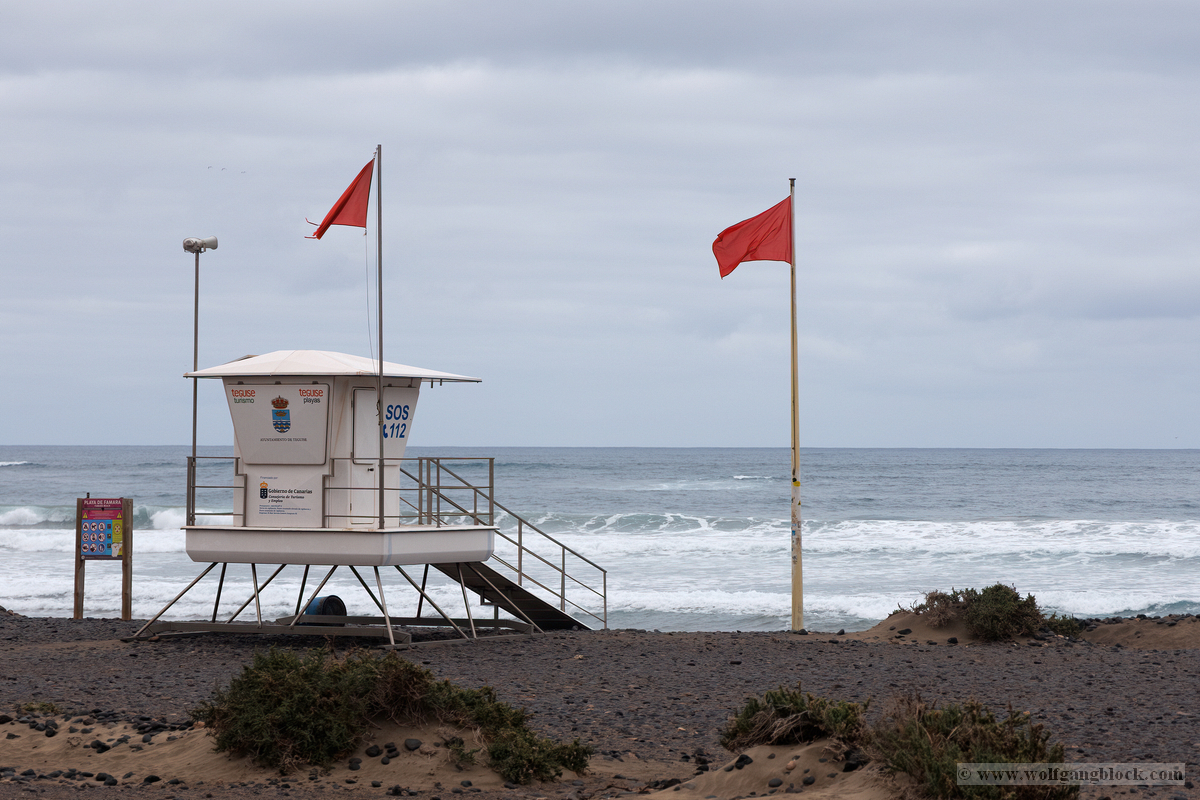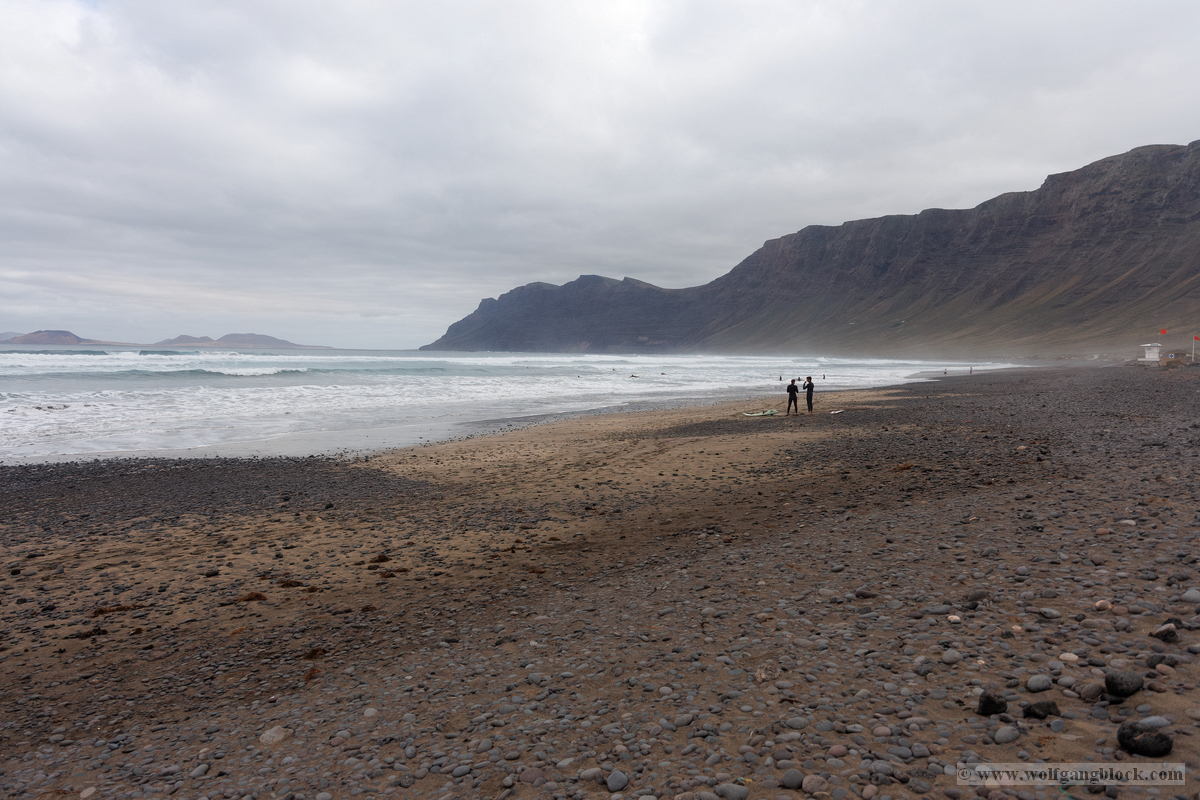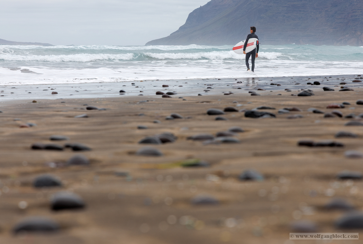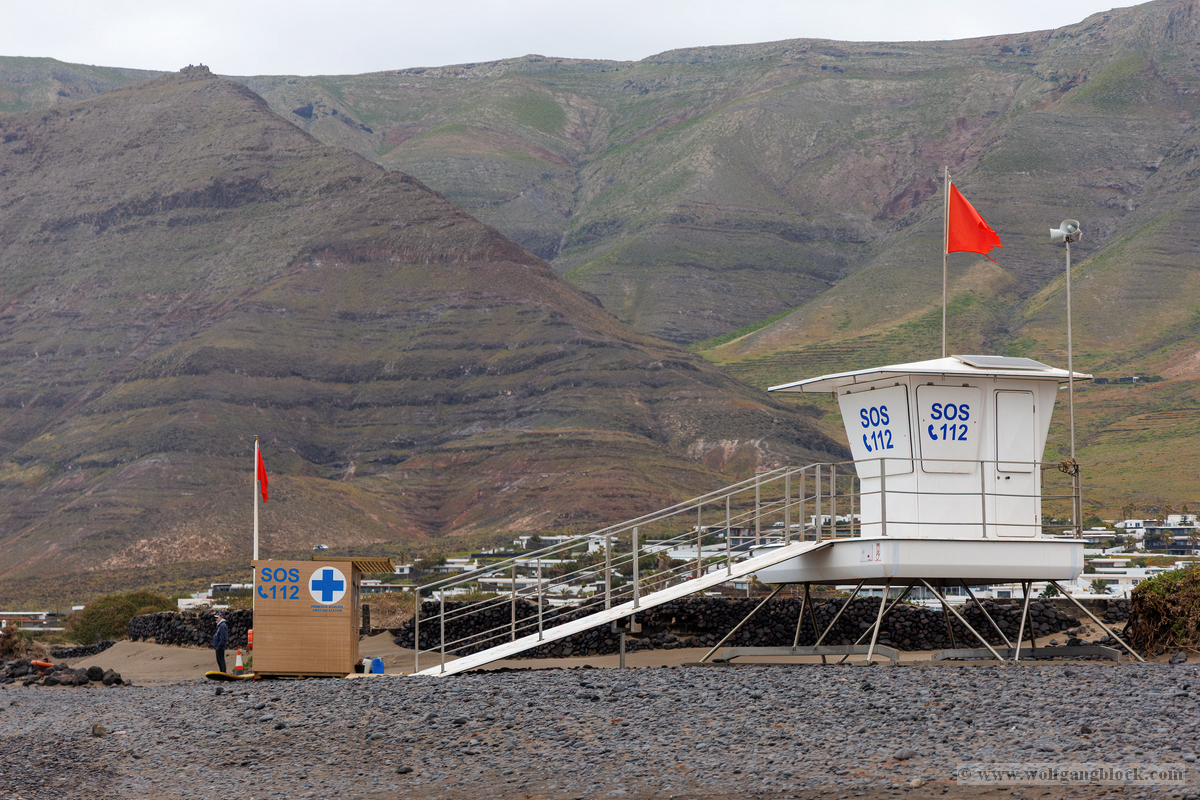 Famara ist kein gewöhnlicher Badestrand; es ist ein Ort der rohen Naturgewalt. Im Hintergrund ragt das enorme Massiv des Risco de Famara fast 600 Meter senkrecht aus dem Atlantik empor – eine gigantische Felswand, die oft von Wolkenfetzen umspielt wird. Die Weitwinkel-Optik der R6 II kam hier voll zum Einsatz, um die gewaltigen Dimensionen zwischen den dunklen Klippen und der weiten, schäumenden Brandung einzufangen. An diesem Tag herrschten klassische „Red Flag“-Bedingungen. An den weißen Lifeguard-Türmen peitschten die roten Flaggen im Wind – ein unmissverständliches Signal für die gefährlichen Unterströmungen. Die kleinen Rettungsstationen mit der Aufschrift „SOS 112“ wirkten fast verloren vor der Kulisse der mächtigen Berge. Doch genau diese Bedingungen lockten die Spezialisten an: Die Surfer. Wie dunkle Punkte tanzten sie auf dem Wasser, wartend auf die perfekte Welle. Wir beobachteten einen Surfer in seinem Neoprenanzug, der sein weiß-rotes Board mit einer fast rituellen Gelassenheit in Richtung der tosenden Gischt trug. Die R6 II fixierte den Fokus mit chirurgischer Präzision auf die Wassertropfen, die vom Board perlten, während im Hintergrund die nächste massive Walze heranrollte. Das Licht war diffus und forderte den Sensor unserer Kameras heraus. In der Ferne, hinter dem Dunst der aufgewirbelten Gischt, zeichneten sich die Umrisse der Nachbarinseln ab – wie ferne Festungen inmitten des graublauen Ozeans.