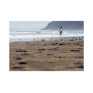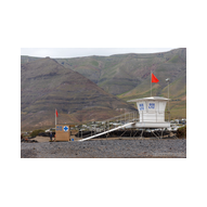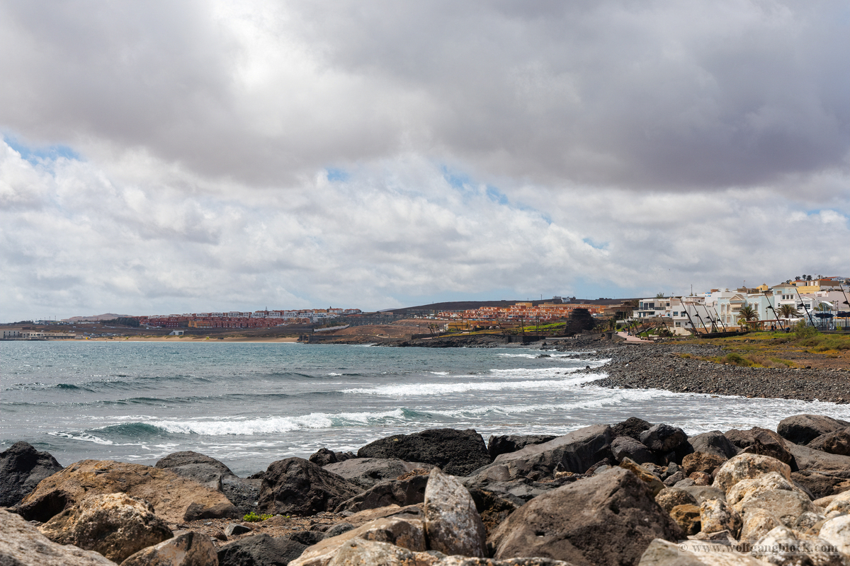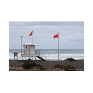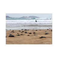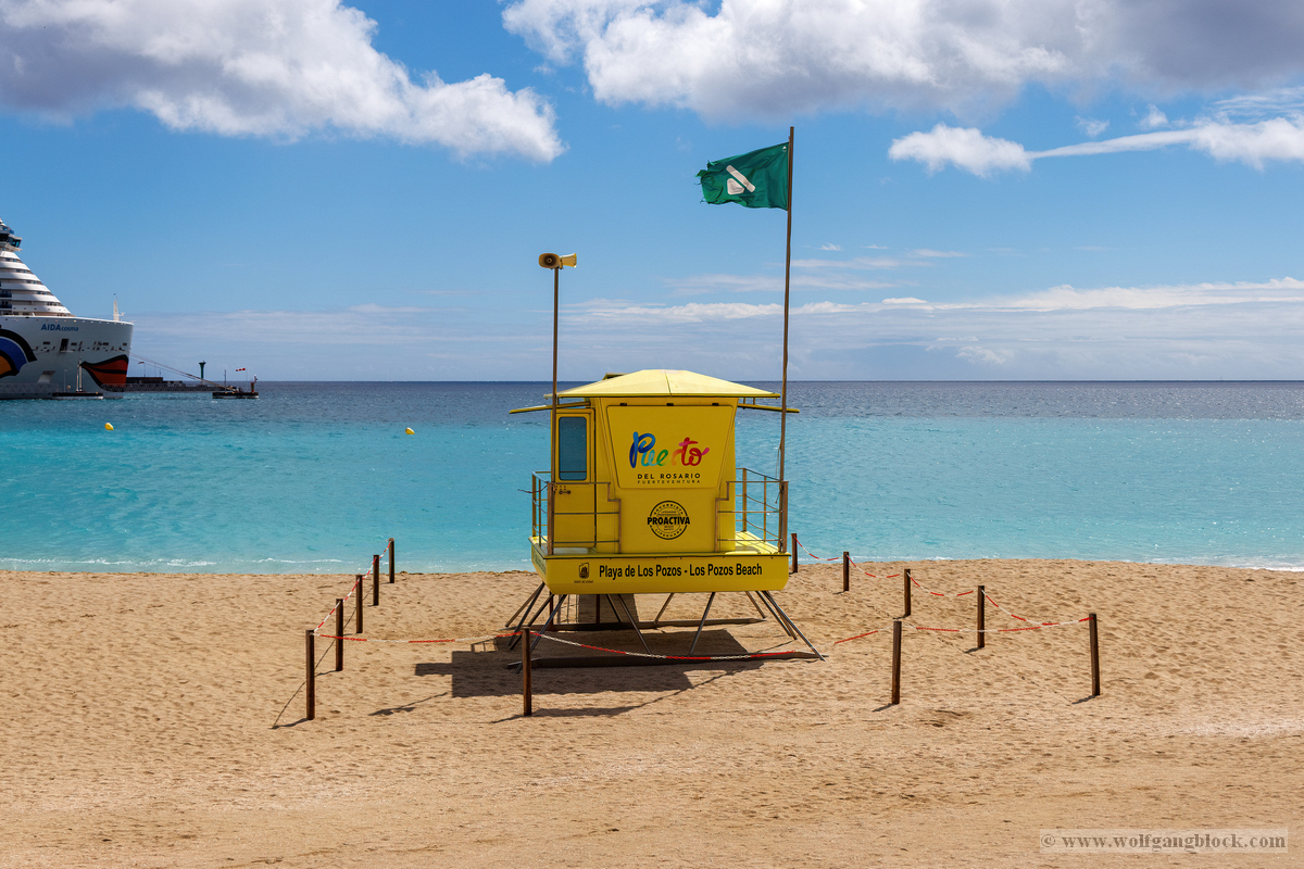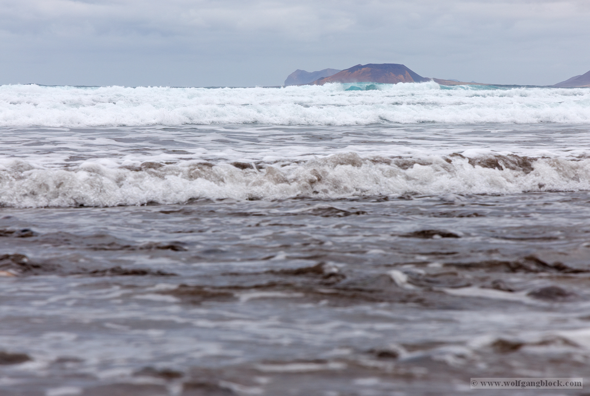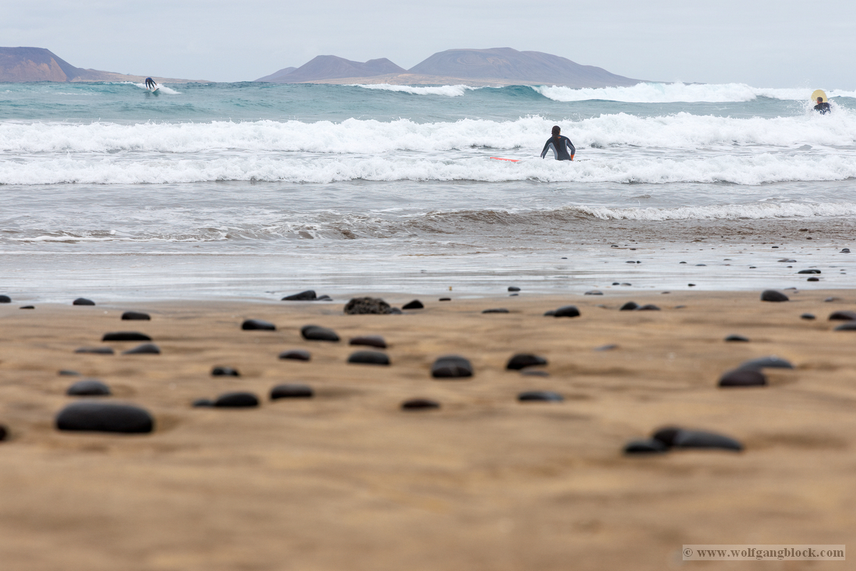 Famara ist kein gewöhnlicher Badestrand; es ist ein Ort der rohen Naturgewalt. Im Hintergrund ragt das enorme Massiv des Risco de Famara fast 600 Meter senkrecht aus dem Atlantik empor – eine gigantische Felswand, die oft von Wolkenfetzen umspielt wird. Die Weitwinkel-Optik der R6 II kam hier voll zum Einsatz, um die gewaltigen Dimensionen zwischen den dunklen Klippen und der weiten, schäumenden Brandung einzufangen. An diesem Tag herrschten klassische „Red Flag“-Bedingungen. An den weißen Lifeguard-Türmen peitschten die roten Flaggen im Wind – ein unmissverständliches Signal für die gefährlichen Unterströmungen. Die kleinen Rettungsstationen mit der Aufschrift „SOS 112“ wirkten fast verloren vor der Kulisse der mächtigen Berge. Doch genau diese Bedingungen lockten die Spezialisten an: Die Surfer. Wie dunkle Punkte tanzten sie auf dem Wasser, wartend auf die perfekte Welle. Wir beobachteten einen Surfer in seinem Neoprenanzug, der sein weiß-rotes Board mit einer fast rituellen Gelassenheit in Richtung der tosenden Gischt trug. Die R6 II fixierte den Fokus mit chirurgischer Präzision auf die Wassertropfen, die vom Board perlten, während im Hintergrund die nächste massive Walze heranrollte. Das Licht war diffus und forderte den Sensor unserer Kameras heraus. In der Ferne, hinter dem Dunst der aufgewirbelten Gischt, zeichneten sich die Umrisse der Nachbarinseln ab – wie ferne Festungen inmitten des graublauen Ozeans.