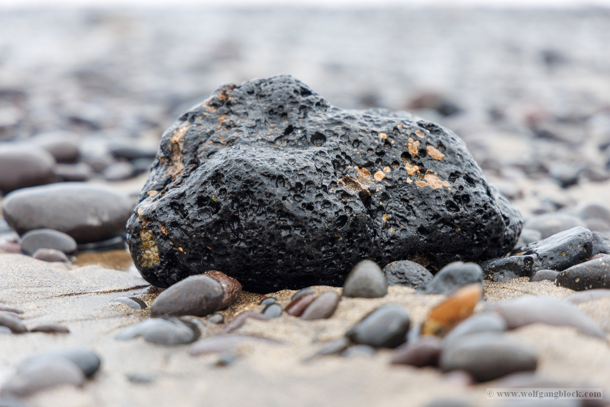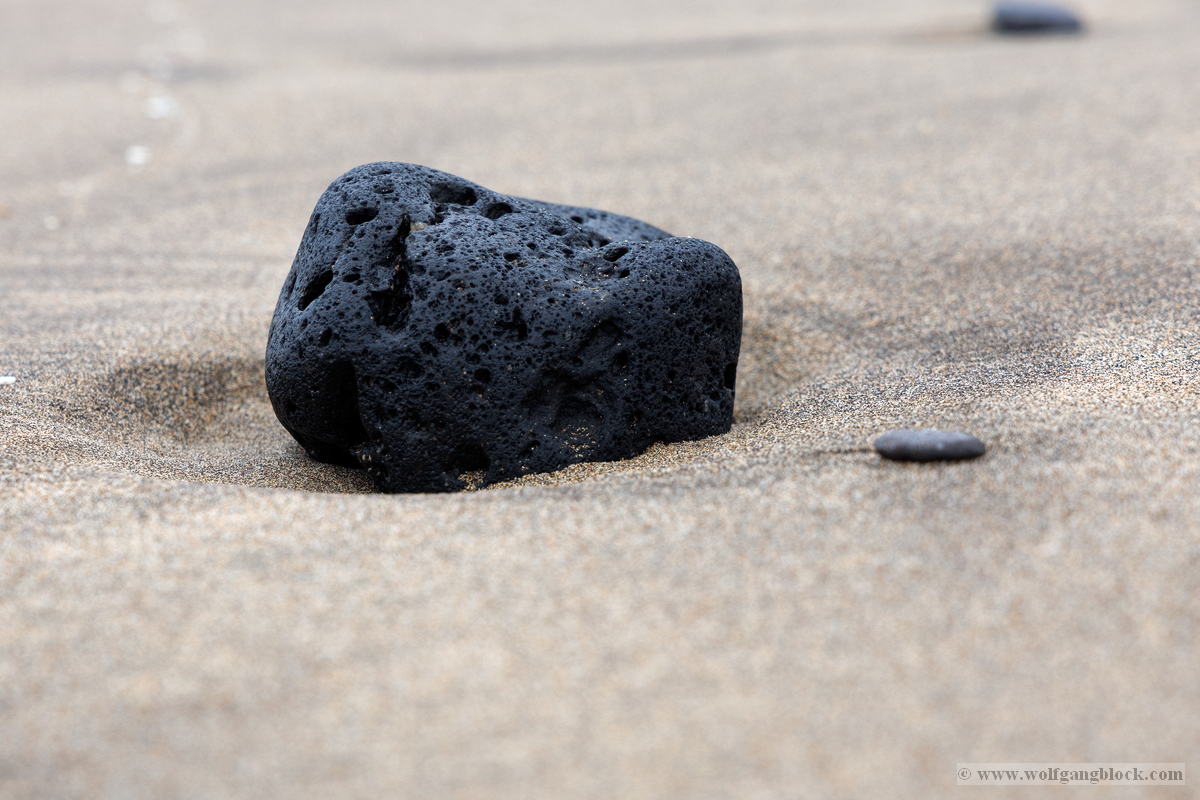 Während die Wellen gegen die Küste hämmerten, richteten wir unsere Objektive auf den Boden. Lanzarote ist eine Insel der harten Kontraste, und das zeigt sich besonders im Detail. Zwischen dem hellbraunen Sand liegen unzählige, tiefschwarze Lavasteine. Diese Fragmente sind die stummen Zeugen der vulkanischen Geburtsstunde Lanzarotes. Wir sicherten makroskopische Aufnahmen dieser Gesteine. Die poröse, fast schon schwammartige Struktur des schwarzen Basalts bildete einen fantastischen Kontrast zur weichen Textur des feuchten Sandes. Jedes Loch im Stein erzählt von Gasen, die vor Jahrtausenden aus der glühenden Lava entwichen sind. Diese Bilder sind die forensischen Beweisstücke unserer Mission: Die Insel besteht nicht aus Erde, sondern aus erstarrter Energie.