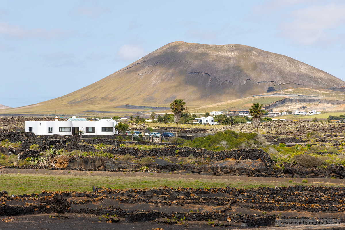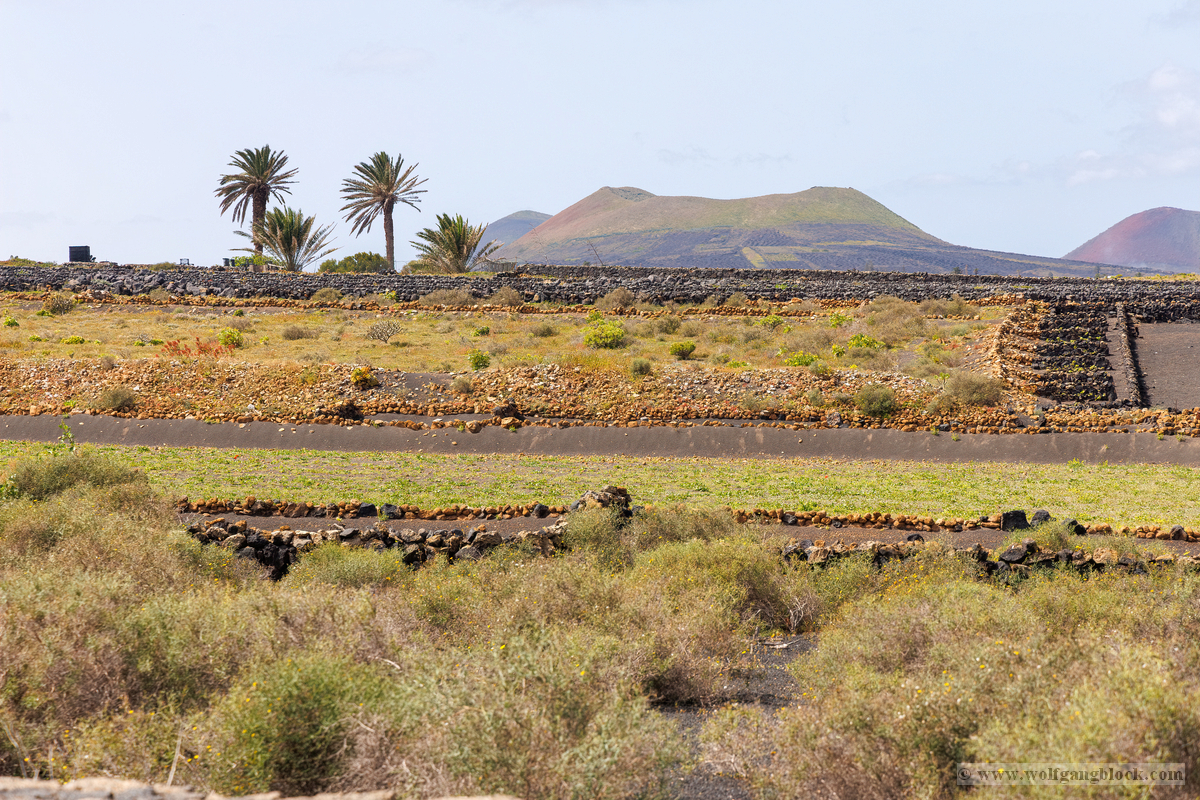 Nach der Fahrt durch die Kraterlandschaft erreichten wir eines der weltweit faszinierendsten Weinanbaugebiete: La Geria. Hier hat der Mensch aus der Katastrophe der historischen Vulkanausbrüche eine einzigartige Kulturlandschaft geschaffen. Aus dem fahrenden Jeep bot sich uns ein surreales Bild. Die schwarzen Felder der Lapilli (Vulkanasche) waren mit tausenden halbkreisförmigen Mauern aus Lavagestein übersät. Diese sogenannten „Zocos“ schützen die Reben vor den unerbittlichen Passatwinden. Da wir durch den vorangegangenen Regen ein ungewöhnlich farbenfrohes Lanzarote erlebten, mischten sich unter das dominante Schwarz der Asche und das frische Grün der Weinstöcke leuchtend gelbe Teppiche aus Wildblumen – ein botanisches Wunder auf Zeit. Die geometrische Präzision, mit der die Trichter (Hoyos) in den Boden gegraben wurden, ist aus der Cockpit-Perspektive besonders beeindruckend. Es wirkt wie ein riesiges, natürliches Kunstwerk. Die R6 II hielt die harten Kontraste zwischen den dunklen Steinen und den hellen, weißen Fincas fest, die vereinzelt wie Außenposten in den Hängen thronen.