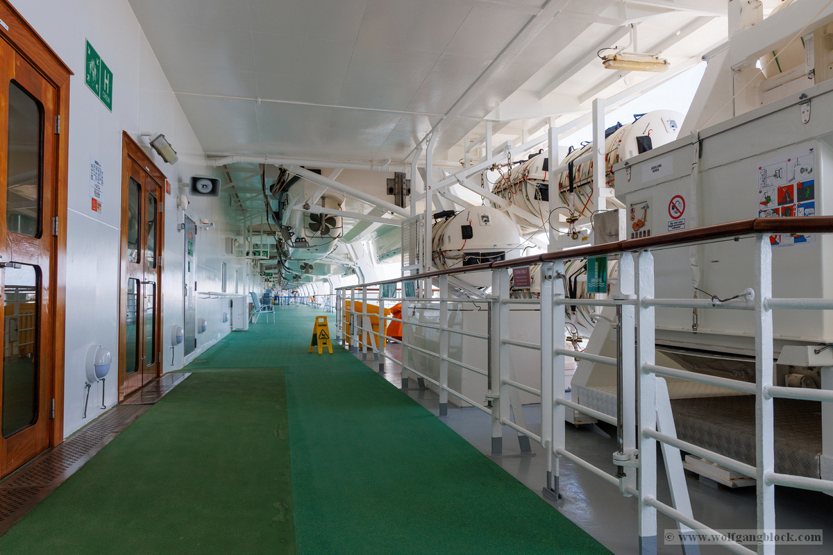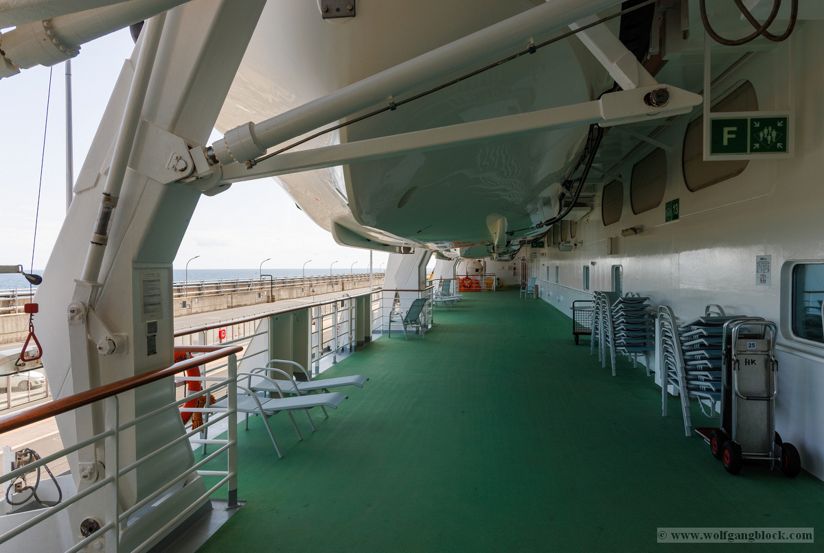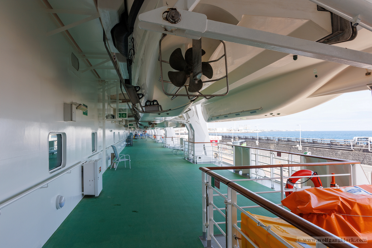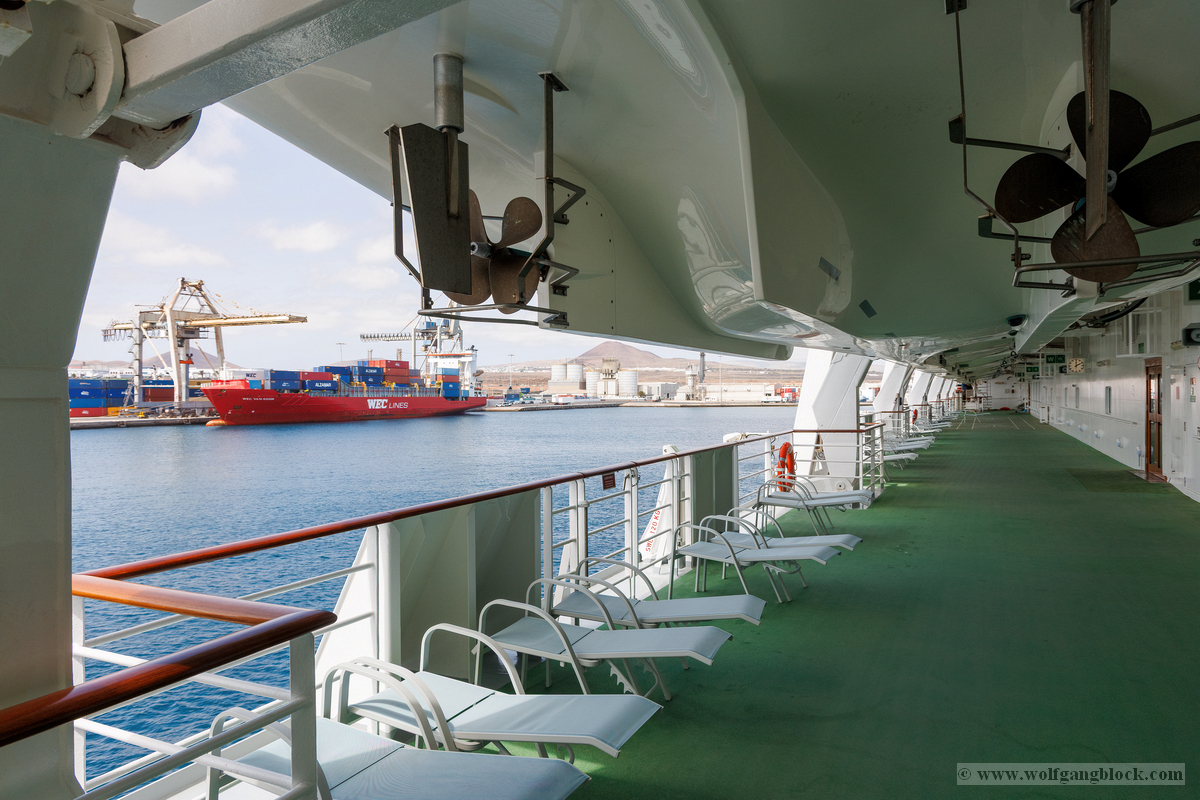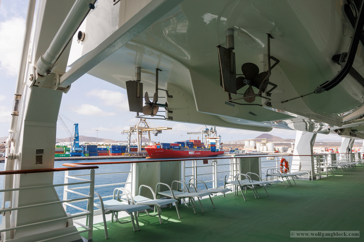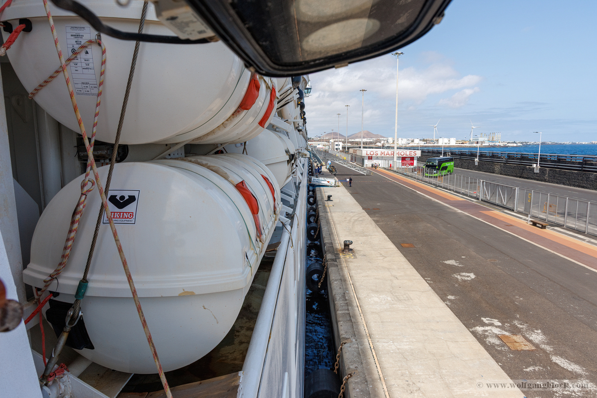 Wieder zurück an Bord hielt uns das „Kaiserwetter“ weiterhin in Atem. Wir nutzten die ruhigen Minuten vor dem Auslaufen für einen Streifzug über die Promenade auf Deck 5. Dieser Bereich ist ein Paradies für Detail-Aufnahmen, da die mächtigen gelben Rettungsboote hier ein schützendes Dach über dem grünen Deck bilden und gleichzeitig spannende Sichtachsen zum Hafen und zum Meer eröffnen. Die Kamera fixierte die mechanischen Details der Bootspropeller und die komplexe Struktur der Davits, die durch das harte Sonnenlicht plastisch hervorgehoben wurden. Wir dokumentierten verschiedene Stationen, von Rettungsboot Nummer 7 bis hin zu den Tenderbooten 11 und 13. Die Symmetrie der Aufhängungen und die technologische Ordnung an der Schiffsflanke lieferten grafisch höchst interessante Kompositionen. Ein Blick über die Reling entlang der Schiffshülle offenbarte die schiere Länge. Vorbei an den aufgereihten weißen Containern der Rettungsinseln fiel der Blick hinunter zur Pier, wo die Hafenlogistik in vollem Gange war. Sogar die abstrakten Formen der Schiffsbemalung – blaue Wellen, die über die runden Bullaugen der unteren Decks schwappen – boten erstklassiges Material für Bildstudien. Nachdem wir die Luna sowohl von Land als auch von Deck aus umfassend dokumentiert hatten, zogen wir uns kurzzeitig zurück. Die Speicherkarten waren nun prall gefüllt mit dem Kontrast zwischen der wilden Natur Lanzarotes und der glänzenden technischen Welt unserer schwimmenden Heimat.