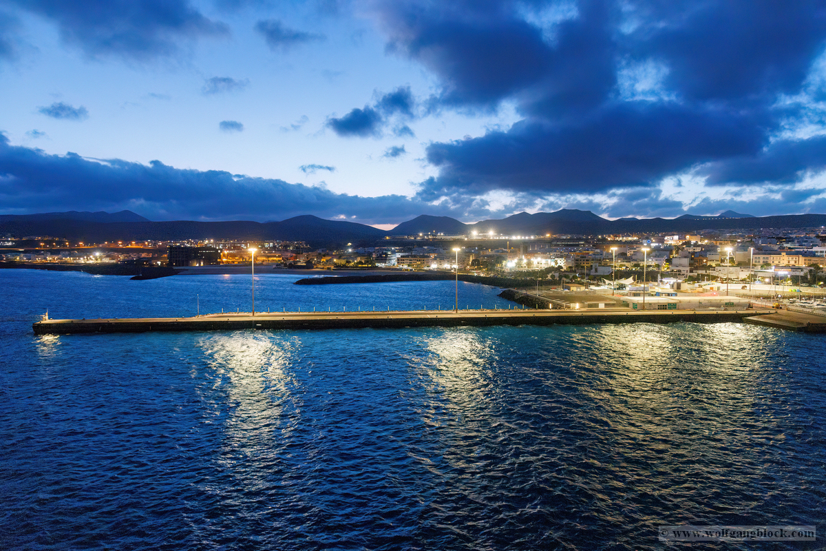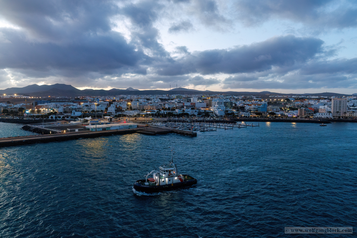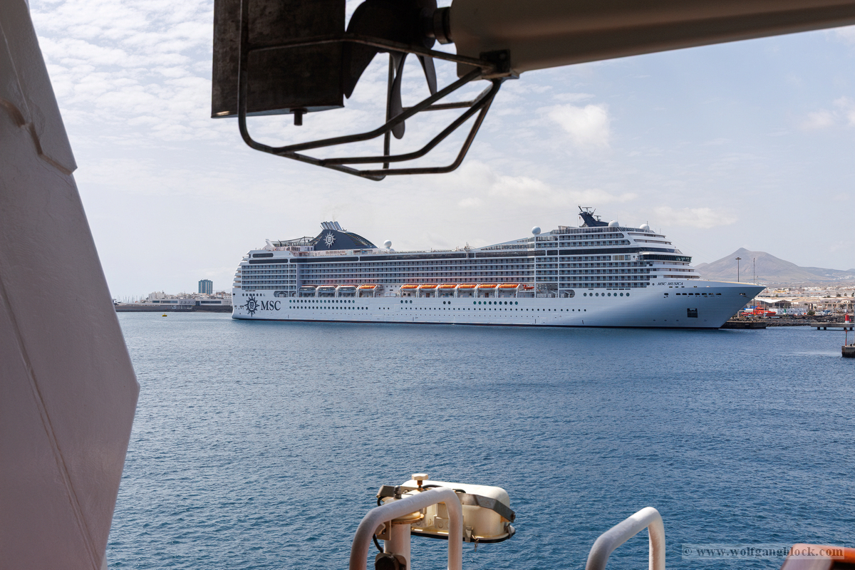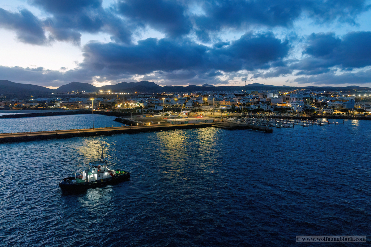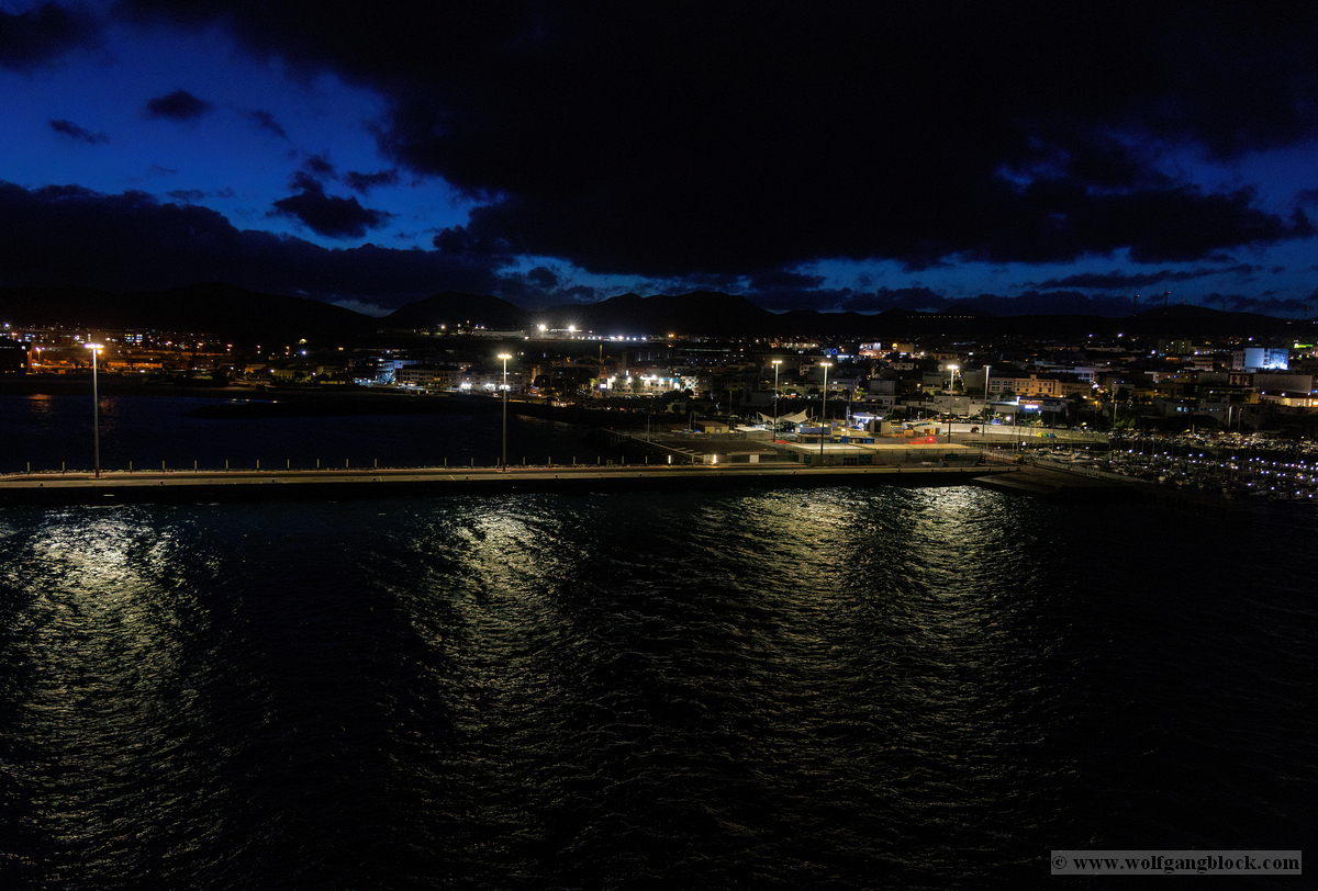 Während wir unser Bier genossen, setzten die ersten Vorbereitungen für das Ablegen ein. Das Hafenbecken von Arrecife bot eine geschäftige Kulisse. Direkt gegenüber lag die „MSC Musica“ wie ein mächtiger, weißer Wall an der Pier. Die Kamera hielt den Kontrast zwischen den eleganten Linien der Kreuzfahrtschiffe und der rauen Funktionalität des Containerterminals fest. Kräne ragten wie eiserne Skelette in den Himmel, während Frachter wie die „WEC Van Gogh“ beladen wurden – ein industrielles Panorama vor den fernen Vulkankegeln Lanzarotes. Dann lösten sich die schweren Taue. Mit einer sanften Vibration der Maschinen begann die Luna, sich von der Kaimauer zu entfernen. Wir passierten die lange Mole, die den Hafen gegen die Brandung des Atlantiks schützt. Von unserem Platz an Deck beobachteten wir, wie der Hafen und die Stadt Arrecife langsam kleiner wurden. Das Licht des späten Nachmittags tauchte die Küste in ein weiches Goldbraun. In der Ferne zeichneten sich die Silhouetten der Feuerberge ab, die wir erst Stunden zuvor mit dem Jeep durchquert hatten. Es war ein Moment des Innehaltens: Lanzarote verschwand langsam am Horizont, während der Bug der Luna bereits Kurs auf das nächste Abenteuer nahm. Das Ziel ist nun klar definiert: Agadir, Marokko. Vor uns liegt eine Nacht auf dem offenen Atlantik – Zeit, die Erlebnisse zu verarbeiten und die Akkus für den Orient aufzuladen.