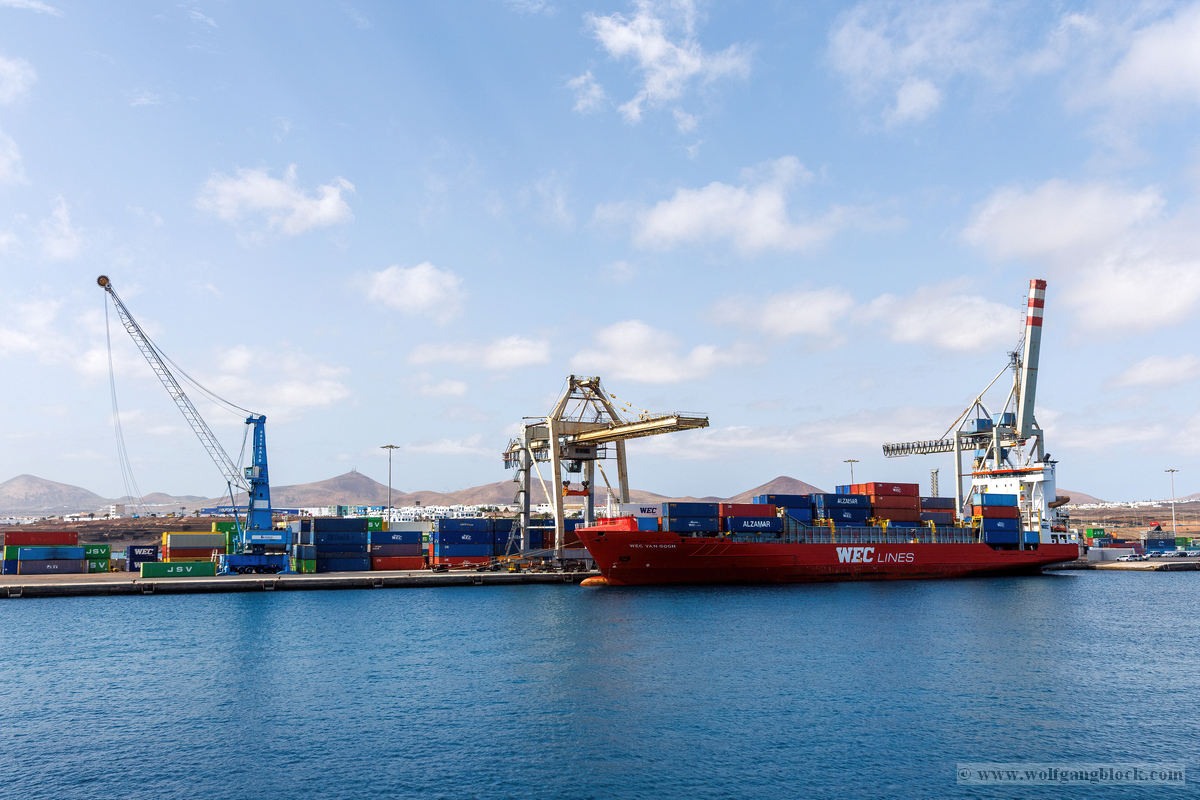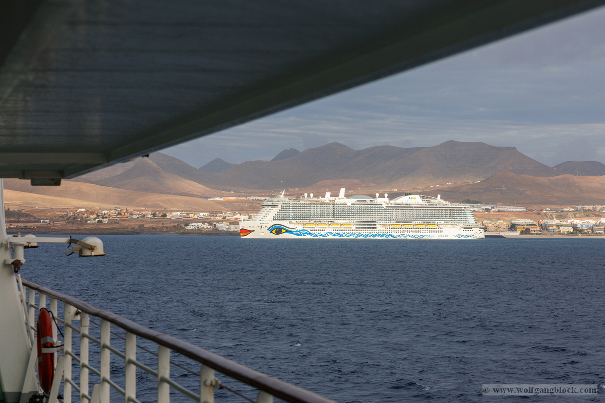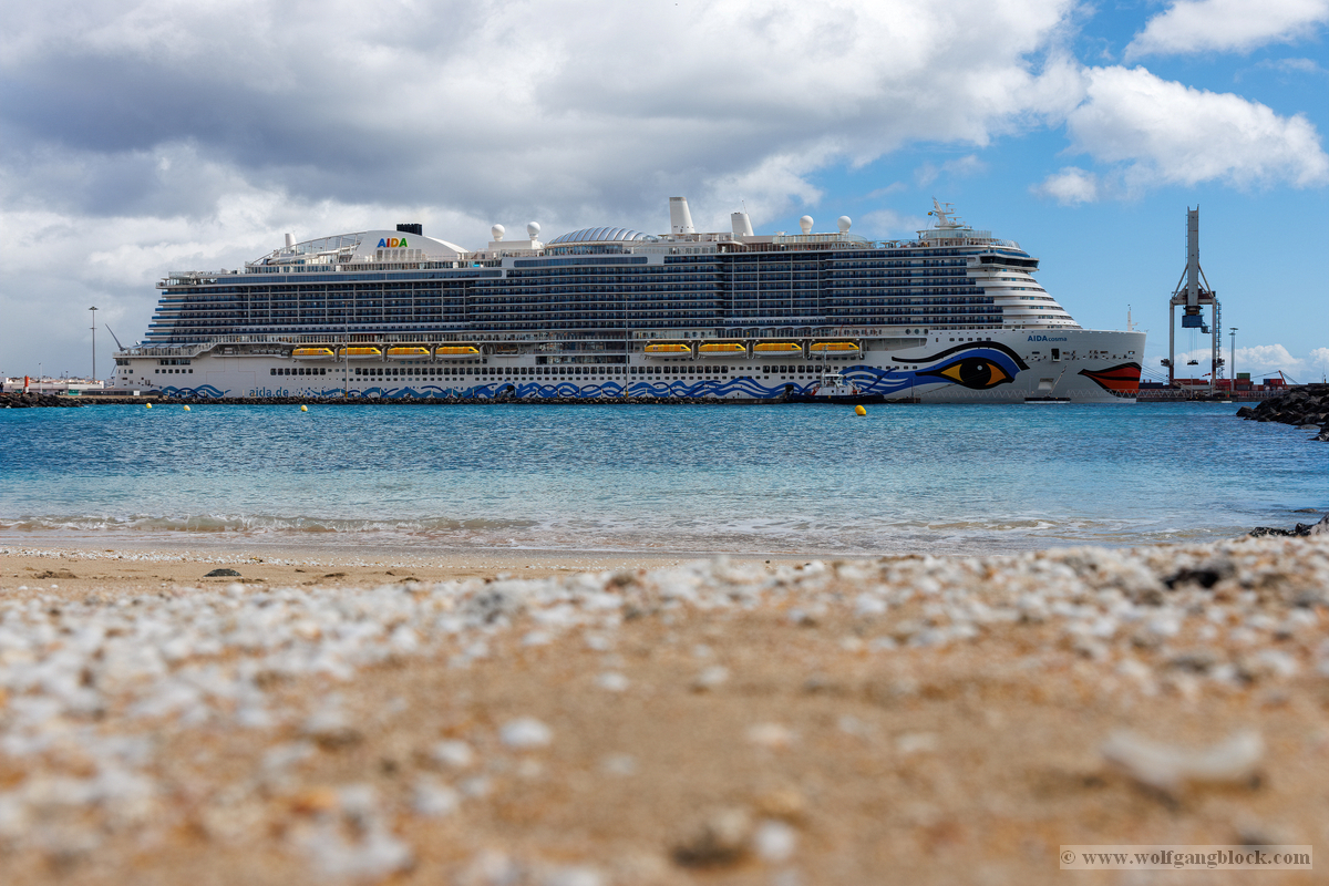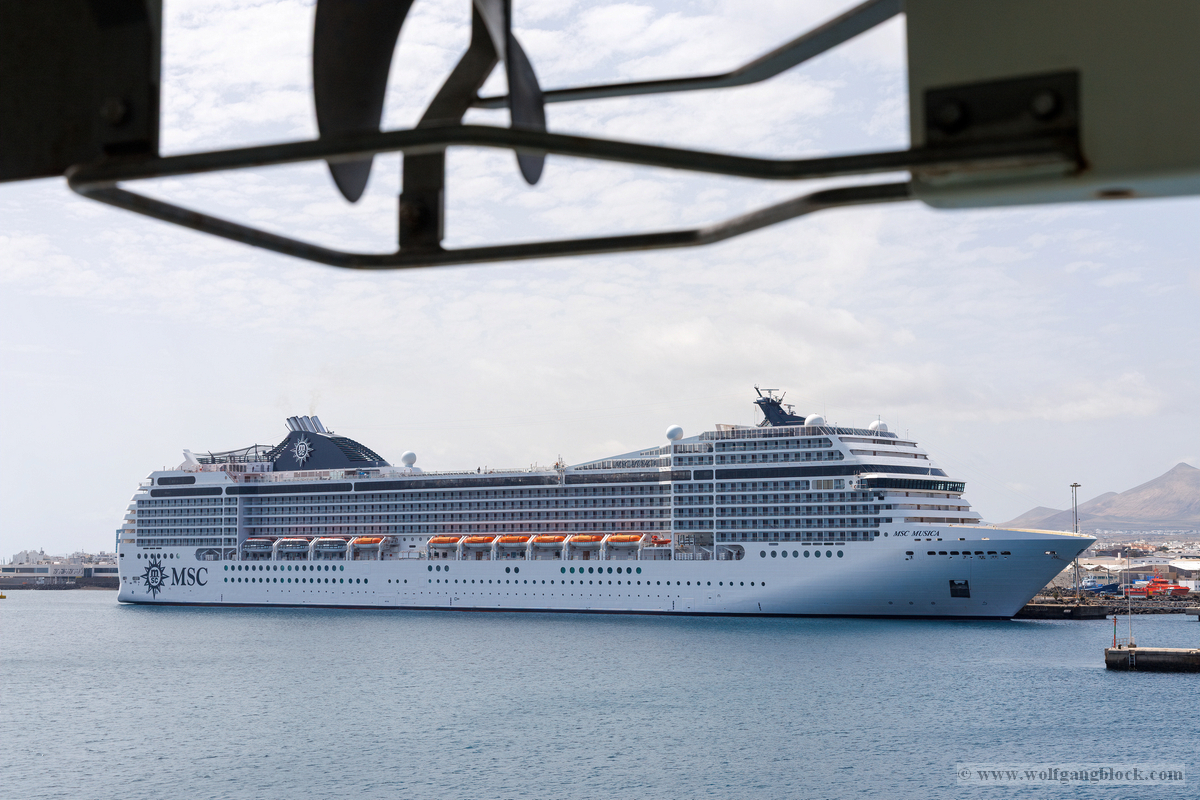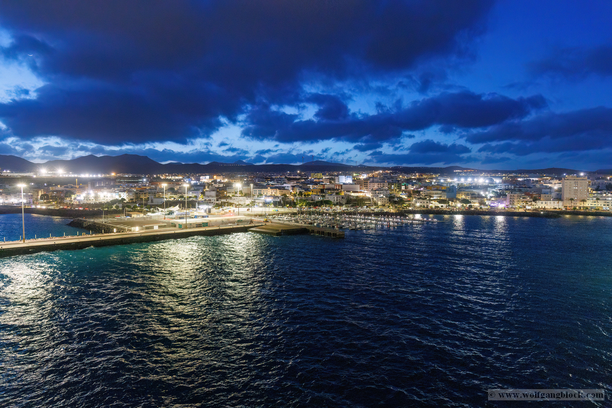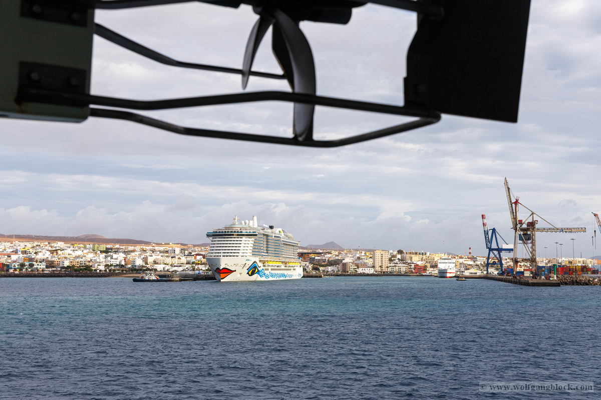 Während wir unser Bier genossen, setzten die ersten Vorbereitungen für das Ablegen ein. Das Hafenbecken von Arrecife bot eine geschäftige Kulisse. Direkt gegenüber lag die „MSC Musica“ wie ein mächtiger, weißer Wall an der Pier. Die Kamera hielt den Kontrast zwischen den eleganten Linien der Kreuzfahrtschiffe und der rauen Funktionalität des Containerterminals fest. Kräne ragten wie eiserne Skelette in den Himmel, während Frachter wie die „WEC Van Gogh“ beladen wurden – ein industrielles Panorama vor den fernen Vulkankegeln Lanzarotes. Dann lösten sich die schweren Taue. Mit einer sanften Vibration der Maschinen begann die Luna, sich von der Kaimauer zu entfernen. Wir passierten die lange Mole, die den Hafen gegen die Brandung des Atlantiks schützt. Von unserem Platz an Deck beobachteten wir, wie der Hafen und die Stadt Arrecife langsam kleiner wurden. Das Licht des späten Nachmittags tauchte die Küste in ein weiches Goldbraun. In der Ferne zeichneten sich die Silhouetten der Feuerberge ab, die wir erst Stunden zuvor mit dem Jeep durchquert hatten. Es war ein Moment des Innehaltens: Lanzarote verschwand langsam am Horizont, während der Bug der Luna bereits Kurs auf das nächste Abenteuer nahm. Das Ziel ist nun klar definiert: Agadir, Marokko. Vor uns liegt eine Nacht auf dem offenen Atlantik – Zeit, die Erlebnisse zu verarbeiten und die Akkus für den Orient aufzuladen.