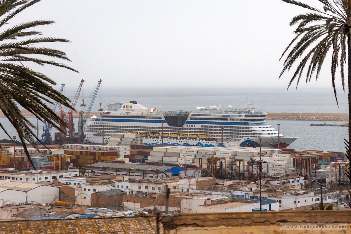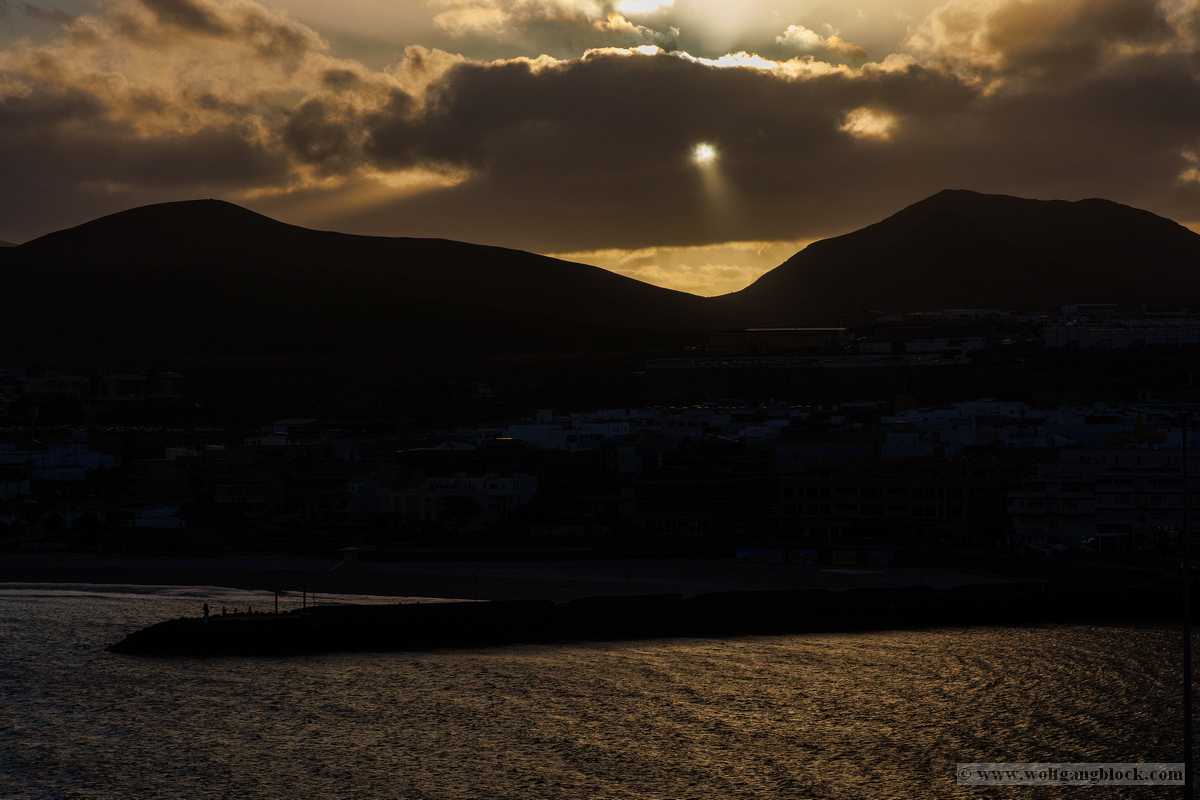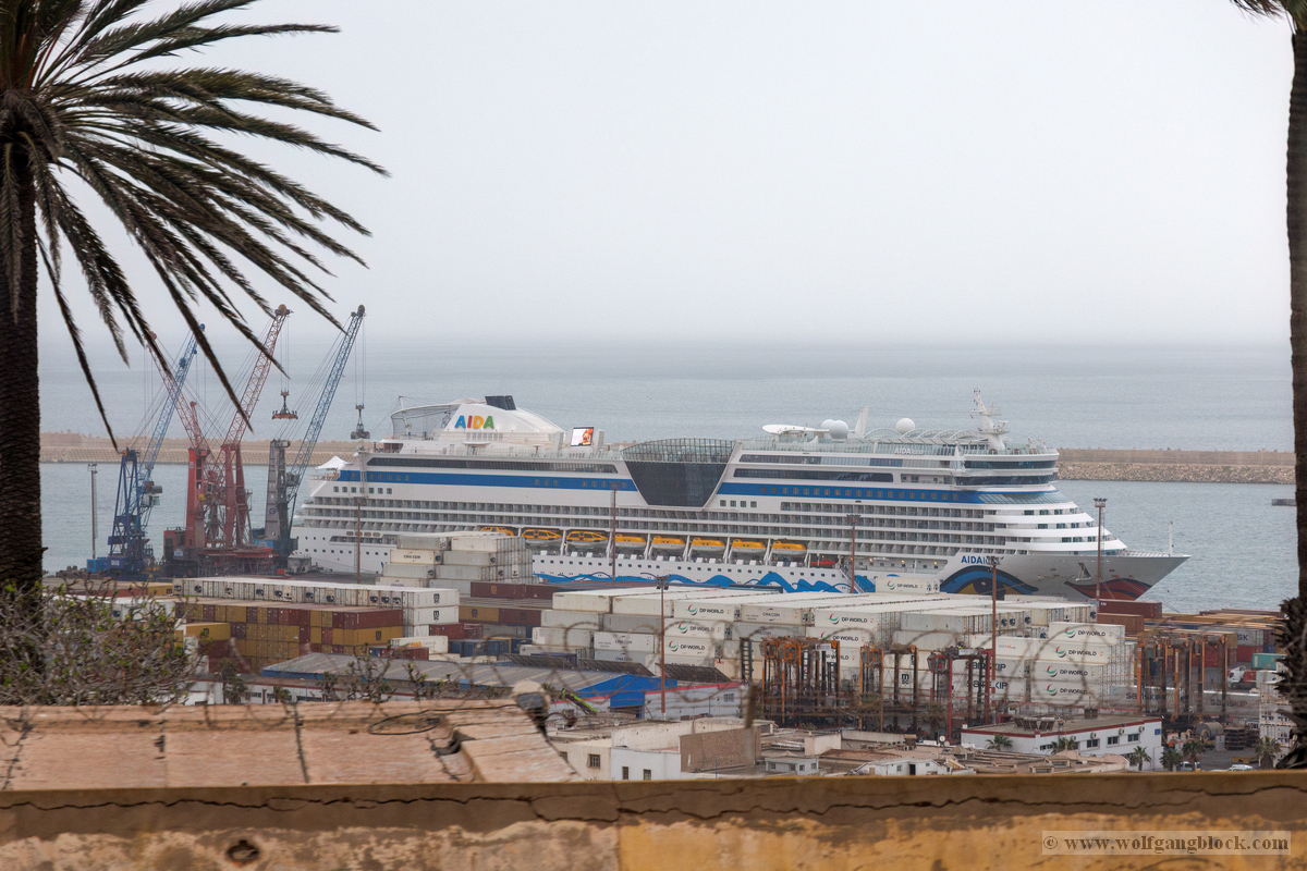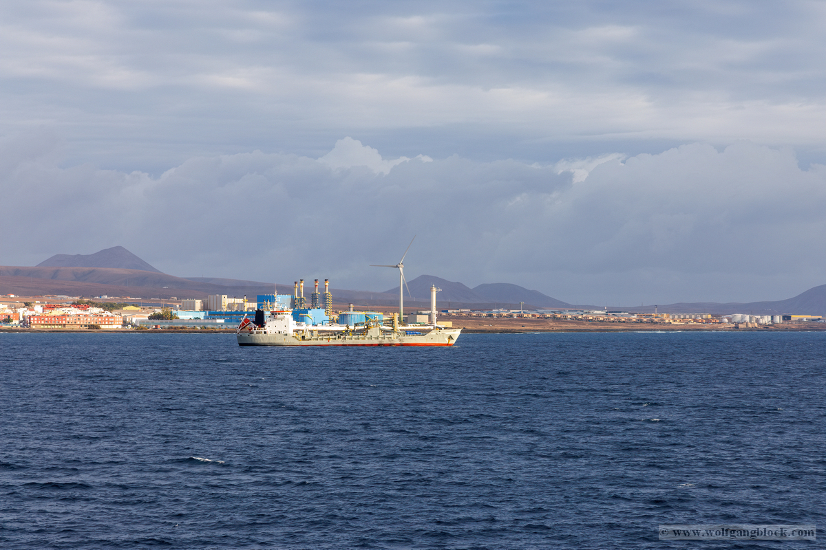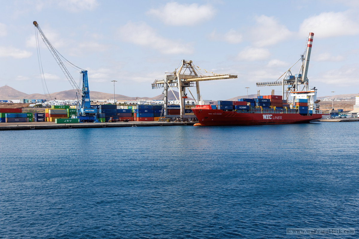 Während wir unser Bier genossen, setzten die ersten Vorbereitungen für das Ablegen ein. Das Hafenbecken von Arrecife bot eine geschäftige Kulisse. Direkt gegenüber lag die „MSC Musica“ wie ein mächtiger, weißer Wall an der Pier. Die Kamera hielt den Kontrast zwischen den eleganten Linien der Kreuzfahrtschiffe und der rauen Funktionalität des Containerterminals fest. Kräne ragten wie eiserne Skelette in den Himmel, während Frachter wie die „WEC Van Gogh“ beladen wurden – ein industrielles Panorama vor den fernen Vulkankegeln Lanzarotes. Dann lösten sich die schweren Taue. Mit einer sanften Vibration der Maschinen begann die Luna, sich von der Kaimauer zu entfernen. Wir passierten die lange Mole, die den Hafen gegen die Brandung des Atlantiks schützt. Von unserem Platz an Deck beobachteten wir, wie der Hafen und die Stadt Arrecife langsam kleiner wurden. Das Licht des späten Nachmittags tauchte die Küste in ein weiches Goldbraun. In der Ferne zeichneten sich die Silhouetten der Feuerberge ab, die wir erst Stunden zuvor mit dem Jeep durchquert hatten. Es war ein Moment des Innehaltens: Lanzarote verschwand langsam am Horizont, während der Bug der Luna bereits Kurs auf das nächste Abenteuer nahm. Das Ziel ist nun klar definiert: Agadir, Marokko. Vor uns liegt eine Nacht auf dem offenen Atlantik – Zeit, die Erlebnisse zu verarbeiten und die Akkus für den Orient aufzuladen.
