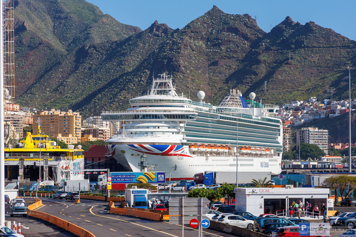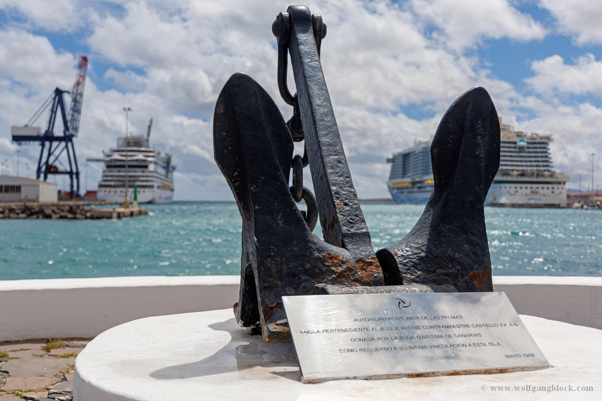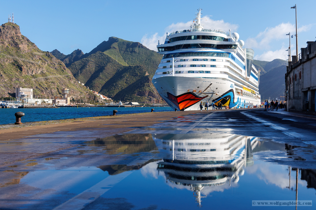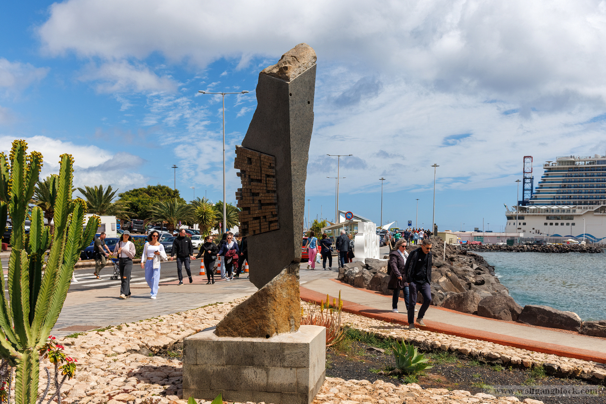 Nachdem wir unsere Luna ausgiebig im Spiegelglanz dokumentiert hatten, machten wir uns zu Fuß auf den Weg in Richtung Stadtzentrum. Der Weg entlang der Kaimauer und der Hafenpromenade entpuppte sich als eine einzige Motiv-Jagd. Santa Cruz präsentiert sich hier wie eine moderne Outdoor-Galerie. Überall am Wegesrand stießen wir auf faszinierende Skulpturen und Kunstobjekte, die einen spannenden Kontrast zur industriellen Hafenlogistik bilden. Besonders beeindruckend war eine hohe Stele aus Steinquadern, die wie ein futuristischer Finger in den Himmel ragt, während im Hintergrund die Luna an der Pier liegt. Auch eine filigrane Metall-Skulptur, die an eine im Wind tanzende Qualle erinnert, fing das maritime Flair perfekt ein. Während wir weiter schlenderten, warfen wir auch einen Blick auf die „Nachbarschaft“. Der Hafen war heute gut besucht: Die gewaltige Mein Schiff 7 lag in ihrer dunkelblauen Eleganz an der Kaimauer, und auch die Azura von P&O Cruises zeigte mit ihrer riesigen Union-Jack-Bemalung am Bug Flagge. Es ist immer wieder faszinierend, diese unterschiedlichen Schiffsarchitekturen im direkten Vergleich zu sehen – jede hat ihren ganz eigenen Charakter. Überall gab es kleine Details zu entdecken: Warnschilder, die vor dem „Suelo Resbaladizo“ (rutschigem Boden) warnten – eine nette Erinnerung an die morgendlichen Regengüsse –, oder die rote Lotsenstation am Ende einer Mole, die sich knallig gegen das türkis leuchtende Wasser abhob. Die Stadt im Hintergrund, eingerahmt von den grünen, wolkenverhangenen Bergen, bildete dazu die perfekte, dramatische Kulisse.