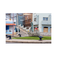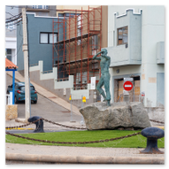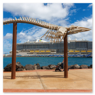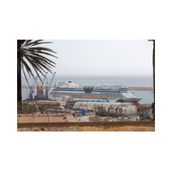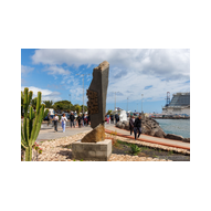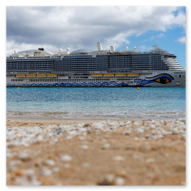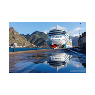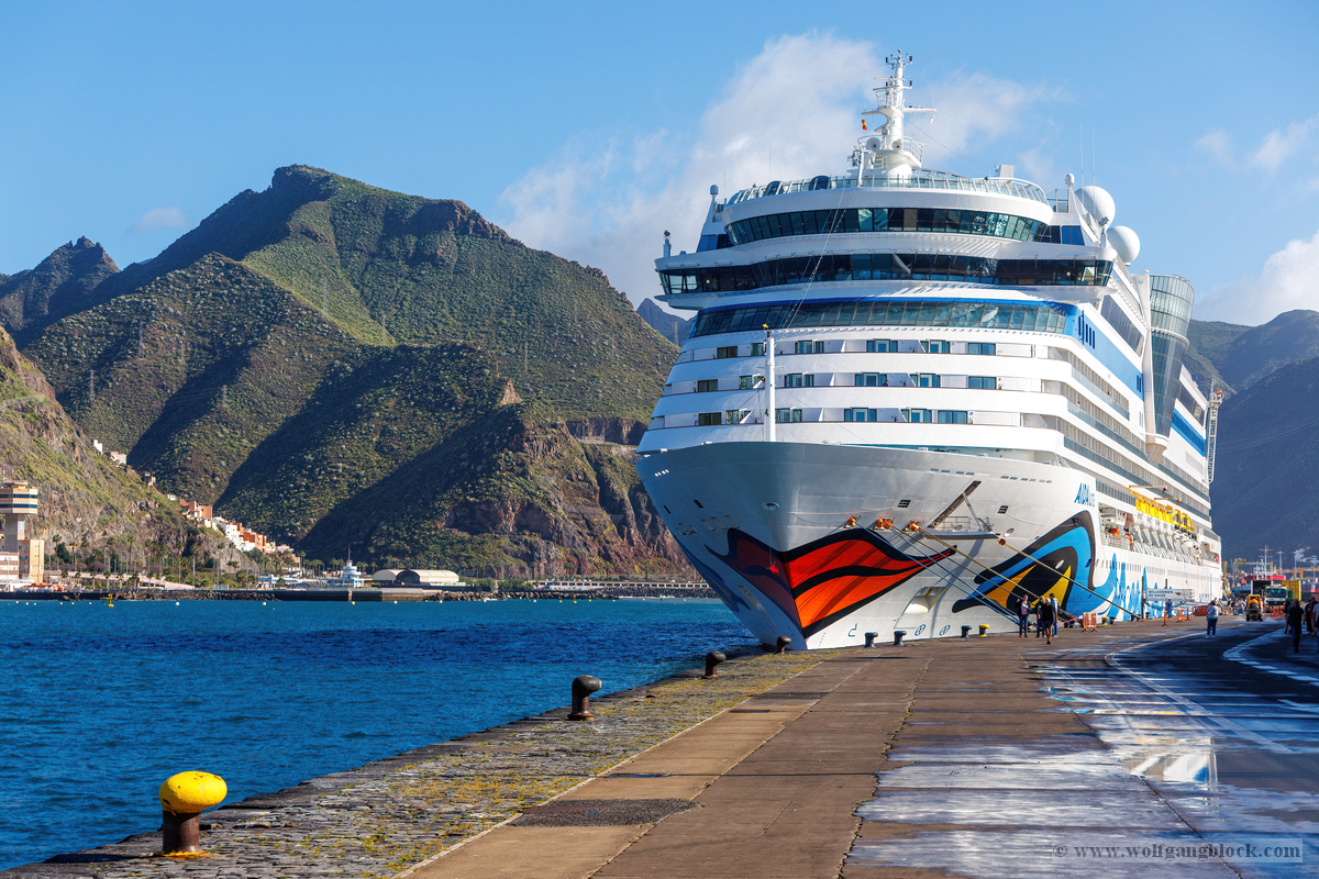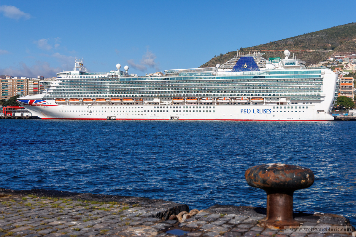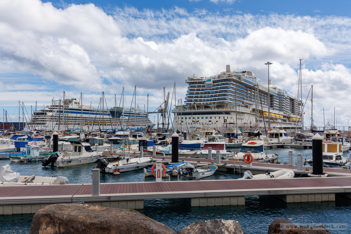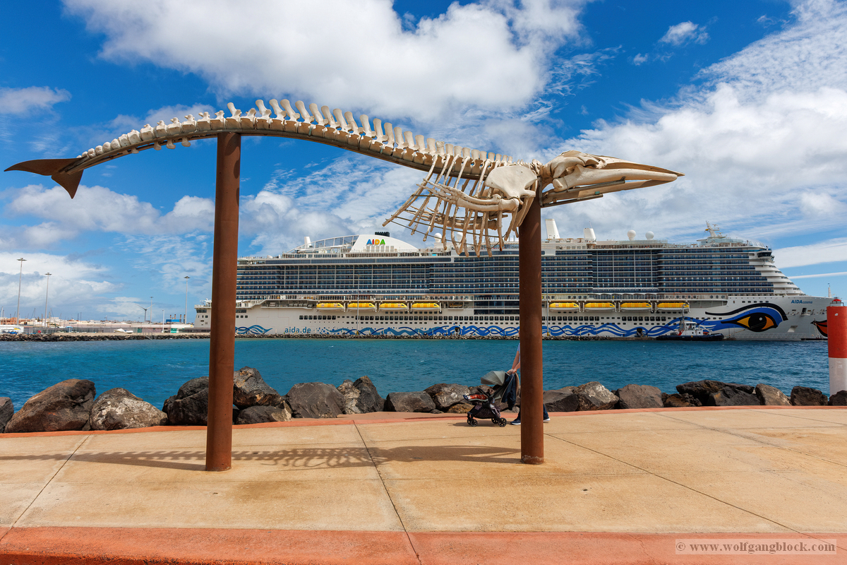 Nachdem wir unsere Luna ausgiebig im Spiegelglanz dokumentiert hatten, machten wir uns zu Fuß auf den Weg in Richtung Stadtzentrum. Der Weg entlang der Kaimauer und der Hafenpromenade entpuppte sich als eine einzige Motiv-Jagd. Santa Cruz präsentiert sich hier wie eine moderne Outdoor-Galerie. Überall am Wegesrand stießen wir auf faszinierende Skulpturen und Kunstobjekte, die einen spannenden Kontrast zur industriellen Hafenlogistik bilden. Besonders beeindruckend war eine hohe Stele aus Steinquadern, die wie ein futuristischer Finger in den Himmel ragt, während im Hintergrund die Luna an der Pier liegt. Auch eine filigrane Metall-Skulptur, die an eine im Wind tanzende Qualle erinnert, fing das maritime Flair perfekt ein. Während wir weiter schlenderten, warfen wir auch einen Blick auf die „Nachbarschaft“. Der Hafen war heute gut besucht: Die gewaltige Mein Schiff 7 lag in ihrer dunkelblauen Eleganz an der Kaimauer, und auch die Azura von P&O Cruises zeigte mit ihrer riesigen Union-Jack-Bemalung am Bug Flagge. Es ist immer wieder faszinierend, diese unterschiedlichen Schiffsarchitekturen im direkten Vergleich zu sehen – jede hat ihren ganz eigenen Charakter. Überall gab es kleine Details zu entdecken: Warnschilder, die vor dem „Suelo Resbaladizo“ (rutschigem Boden) warnten – eine nette Erinnerung an die morgendlichen Regengüsse –, oder die rote Lotsenstation am Ende einer Mole, die sich knallig gegen das türkis leuchtende Wasser abhob. Die Stadt im Hintergrund, eingerahmt von den grünen, wolkenverhangenen Bergen, bildete dazu die perfekte, dramatische Kulisse.