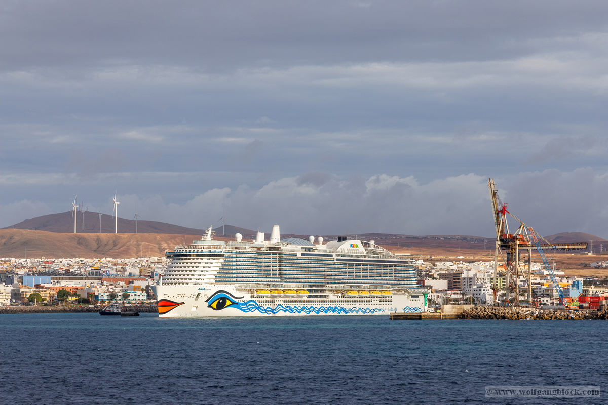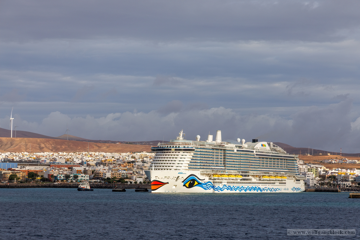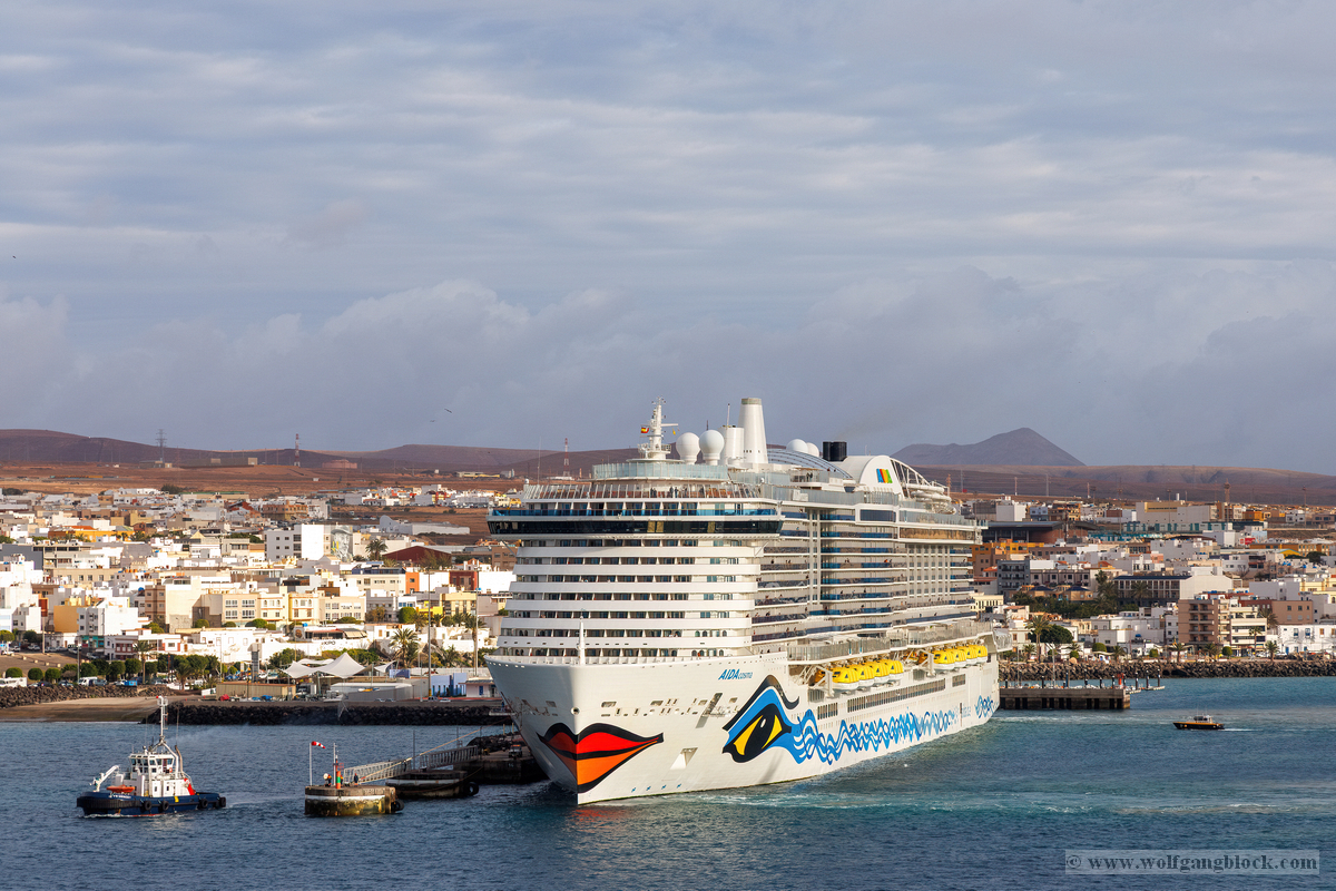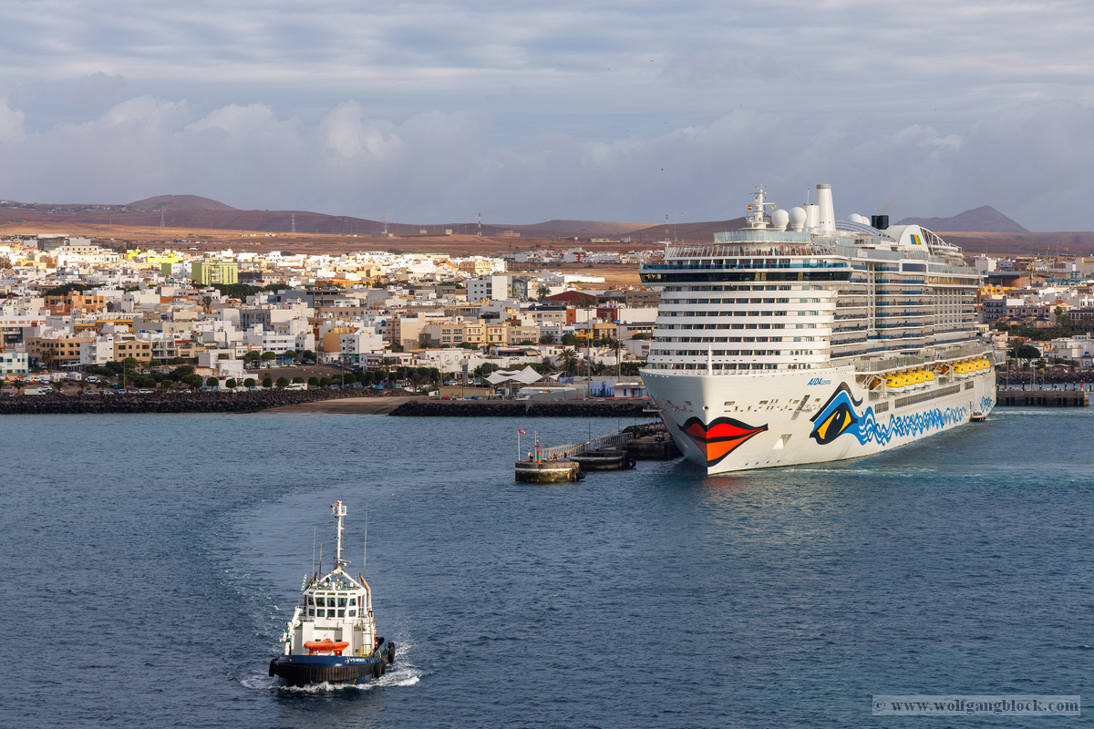Montagmorgen auf Lanzarote. Der erste Blick über die Reling nach dem Aufstehen ist immer ein besonderer Moment der Reise. Die Luft ist noch frisch, und der Himmel zeigt sich in einem sanften Grau, das die dramatische Vulkanlandschaft der Insel perfekt untermalt. Während wir uns langsam dem Hafen von Arrecife näherten, begannen die Vorbereitungen für das Anlegemanöver. An Bord der AIDAluna gibt es einen Ort, der uns als Technik-Begeisterte besonders fasziniert: Die Plakette zur Kiellegung und Fertigstellung des Schiffes. „Kiellegungsmünzen AIDAluna – 29. März 2008“ und der Stolz der Meyer Werft Papenburg aus dem Jahr 2009. Es ist beeindruckend, sich vorzustellen, dass wir uns auf einem über 15 Jahre alten Meisterwerk deutscher Ingenieurskunst befinden, das auch heute noch mit zeitloser Eleganz über die Meere gleitet. Das Manöver im Hafenbecken von Arrecife wurde wieder von einem Lotsenboot unterstützt. Die leuchtend orangefarbene „Pilots“-Barke tanzte auf den Wellen direkt neben unserer massiven Bordwand. Von oben konnten wir den Lotsen beobachten, wie er mit geübten Griffen das kleine Boot steuerte – ein faszinierendes Zusammenspiel von Präzision und maritimer Erfahrung. Arrecife empfing uns mit einer industriellen Hafenkulisse, die von massiven Kränen und Frachtschiffen geprägt war. Direkt an den Kaimauern lagen Schiffe wie die „WEC Van Gogh“ und die blaue „Fred. Olsen Cargo Express“. Die karge, hügelige Landschaft Lanzarotes mit ihren charakteristischen Vulkankegeln im Hintergrund bildete einen fast schon surrealen Rahmen für das geschäftige Treiben im Hafen. Nachdem die Taue fest vertäut waren und das Schiff freigegeben wurde, stand unsere nächste Mission fest: Die Erkundung der Feuerinsel. Die Jeeps warteten bereits und der Vulkansand von Lanzarote rief nach uns.
