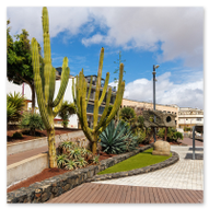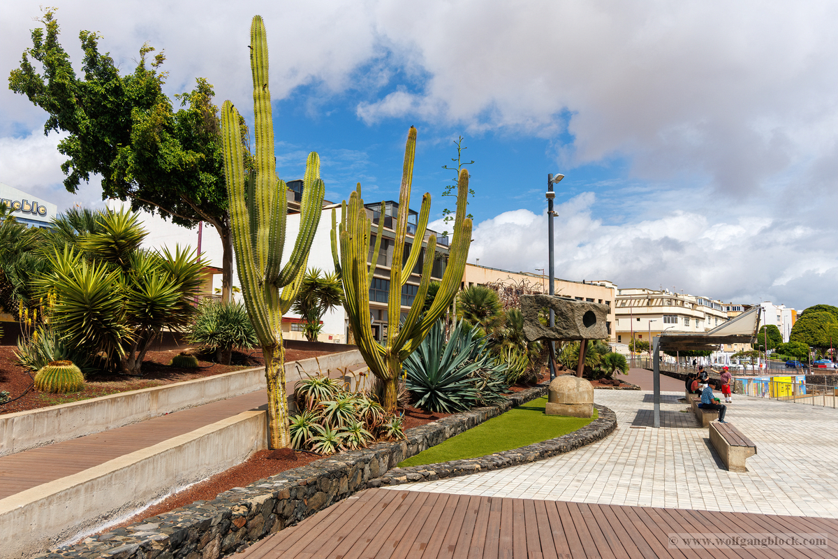 Auch der Kontrast zur Geschichte blieb ein zentrales Thema. Wenn man das Auditorio durch die wehrhaften Zinnen des benachbarten Castillo de San Juan Bautista betrachtet, prallen Jahrhunderte aufeinander. Der tiefschwarze Lavastein der Festung bildet den perfekten Rahmen für die futuristische, schneeweiße Silhouette des Auditorios. Es ist ein Spiel mit Texturen und Epochen, das unsere Speicherkarten zum Glühen brachte. Wir nutzten die Flora der Insel für weitere spannende Bildkompositionen. Mal bildete ein mächtiger Kaktus den grünen, stacheligen Vordergrund für die weichen Kurven der Oper, mal ließen wir den Blick über moderne Skulpturen und gepflegte Palmenanlagen schweifen. Die Weitläufigkeit des Platzes rund um das Gebäude unterstreicht seine monumentale Wirkung.
