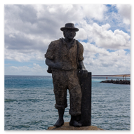 Unsere Nachmittagsrunde führte uns schließlich zu einem Ort der Stille inmitten des urbanen Trubels: der Iglesia de San Francisco de Asís. Diese Kirche, ein ehemaliges Franziskanerkloster, ist ein Juwel des kanarischen Barocks. Die strahlend weiße Fassade mit den dunklen vulkanischen Steineinfassungen bildete einen perfekten Kontrast zum strahlend blauen Himmel. Besonders beeindruckend ist das monumentale Hauptportal. Die schweren, kunstvoll geschnitzten Holztüren wirken wie Wächter der Zeit. Wir hielten einen Moment inne, um die Texturen des alten Holzes und die warmen Reflexionen der Sonne auf den Stufen festzuhalten. Es ist faszinierend, wie diese historische Architektur Ruhe ausstrahlt, während nur wenige Meter weiter das moderne Leben pulsiert. Auf dem Vorplatz der Kirche stießen wir auf bedeutende Denkmäler. Direkt vor dem Eingang steht die Bronzebüste von Dr. Santiago Beyro Martín, einem geschätzten Priester dieser Gemeinde, dessen Blick fest über den Platz wacht. Diese bronzenen Zeugen der Geschichte verleihen dem Ort eine ganz besondere, würdevolle Atmosphäre.