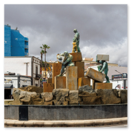 Nachdem wir die kühlen Hallen des Fischmarktes verlassen hatten, sog uns das urbane Leben von Santa Cruz wieder auf. Wir schlenderten durch Straßen, in denen der Puls der Hauptstadt spürbar war. Vorbei an typisch kanarischen Cafeterien wie der „San Miguel“, wo die Einheimischen im Schatten der Bäume ihren Espresso genossen, führte uns der Weg in Richtung des modernen Geschäftszentrums. Die Architektur änderte sich schlagartig. Die schmalen Gassen wichen weiten Alleen und modernen Fassaden. Besonders beeindruckend war das gewaltige Gebäude von El Corte Inglés, das mit seiner klaren Linienführung und den davor aufragenden, majestätischen Palmen ein mondänes Flair versprühte. Die Sonne stand nun hoch am Himmel und betonte die harten Schatten und die satten Farben der Stadt. Unser Marsch führte uns weiter in Richtung Küste, vorbei am Busbahnhof (Intercambiador). Hier änderte sich die Kulisse erneut und wir standen vor der imposanten Skyline der Moderne. Die beiden Torres de Santa Cruz, die höchsten Wolkenkratzer der Stadt, ragten wie zwei gläserne Wächter in das tiefe Blau des Himmels. Direkt davor entdeckten wir das weiße, geometrische Monumento a la Constitución, dessen abstrakte Formen in der Mittagssonne fast schon blendeten. Schließlich erreichten wir wieder die Uferpromenade und näherten uns dem Auditorio aus einer neuen Perspektive. Hier stießen wir erneut auf das Castillo de San Juan Bautista. Aus dieser Perspektive, direkt am Wasser stehend, wirkte die dunkle Festung noch massiver. Der Kontrast zwischen dem alten Lavastein der Burg, den modernen Hochhäusern im Hintergrund und den schäumenden Wellen des Atlantiks ist schlichtweg faszinierend. Es ist dieser Mix aus wehrhafter Geschichte und futuristischer Vision, der Santa Cruz so einzigartig macht.