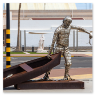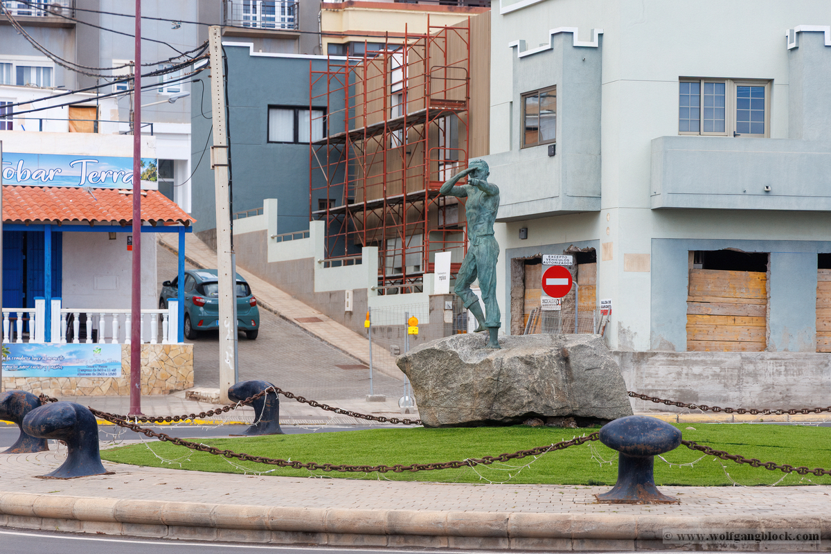 Der Spaziergang führte uns schließlich zum pulsierenden Mittelpunkt von Santa Cruz: der Plaza de España. Nach der stürmischen Nacht und dem grauen Morgen wirkte dieser Ort im strahlenden Sonnenschein fast schon wie eine Postkarte. Das erste, was ins Auge sticht, ist das ikonische Santa Cruz Logo – ein großes, weißes Schild mit einem grün-blauen Herzen, das ein beliebtes Fotomotiv für jeden Besucher ist. Dahinter erstreckt sich der riesige, künstliche See, dessen flaches Wasser in der Sonne glitzert und die Silhouette der umliegenden Berge und Schiffe im Hafen widerspiegelt. Die Architektur an der Plaza ist ein faszinierender Mix aus Moderne und Historie. Ein echtes Highlight ist das mit Blumen und Pflanzen bewachsene Dach der Touristeninformation, das wie ein grüner Hügel aus dem Boden wächst. Ein starker Kontrast dazu ist das monumentale „Monumento a los Caídos“. Die gewaltigen Steinsäulen und die dramatischen Skulpturen – wie der Krieger mit dem Schwert oder die geflügelte Siegesgöttin – wirken in dem harten, klaren Licht Teneriffas besonders plastisch und ausdrucksstark.