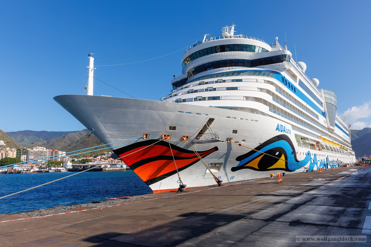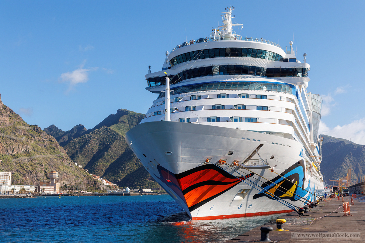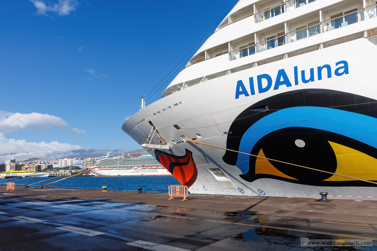 Bevor wir endgültig die Gangway betraten und das feste Land gegen die Planken der Luna tauschten, hielten wir noch einmal kurz inne. Die Sonne stand mittlerweile so perfekt, dass sie den gesamten Bugbereich in ein warmes, brillantes Licht tauchte. Wir konnten nicht widerstehen und schossen noch ein weiteres Bugbild unserer tollen Luna. In dieser Perspektive wirkt das Schiff besonders dynamisch und stolz – fast so, als würde es selbst die warme kanarische Sonne genießen, bevor die Reise heute Abend weitergeht. Das Auge und der Kussmund leuchten förmlich gegen das Blau des Himmels und die schroffen Bergflanken im Hintergrund. Ein Motiv, das die Eleganz unserer schwimmenden Basis perfekt zusammenfasst.
