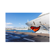 Bevor wir wieder an Bord gingen, nutzten wir die Gelegenheit für eine ausführliche fotografische Dokumentation des Schiffsäußeren. Unter der prallen kanarischen Sonne zeigten sich die architektonischen Details der Sphinx-Klasse in ihrer vollen Schärfe. Wir fokussierten uns auf die technischen und gestalterischen Merkmale, die dieses Schiff so einzigartig machen. Besonders der Bug mit dem ikonischen Kussmund und dem großen, wachsamen Auge ist ein Muss für jeden Fotografen. Die Kamera hielt die massiven Taue fest, die die Luna sicher an der Kaimauer hielten – ein Symbol für Stabilität nach der Dynamik der Jeep-Tour. Ein weiteres Motiv-Thema waren die Rettungsboote. In ihrem leuchtenden Gelb bildeten sie einen starken farblichen Akzent zur weiß-blauen Bordwand. Wir dokumentierten verschiedene Stationen, von Boot Nummer 7 bis hin zu den Tenderbooten 11 und 13. Die Symmetrie der Davits und die technologische Ordnung an der Schiffsflanke lieferten grafisch höchst interessante Kompositionen. Sogar die Brücke, das Gehirn des Schiffes, rückte in unser Visier. Von der Pier aus wirkten die weit ausladenden Nocken fast wie der Kopf eines futuristischen Giganten, der über das Hafenbecken wacht. Auch die abstrakten Formen der Schiffsbemalung – blaue Wellen, die über die runden Bullaugen der unteren Decks schwappen – boten erstklassiges Material für Detailstudien. Nachdem wir die Luna aus jeder denkbaren Perspektive im Kasten hatten, führte uns der Weg über die Gangway zurück an Bord. Die Speicherkarten waren prall gefüllt mit dem Kontrast zwischen der rauen Natur Lanzarotes und der glänzenden Ästhetik unseres Schiffes.