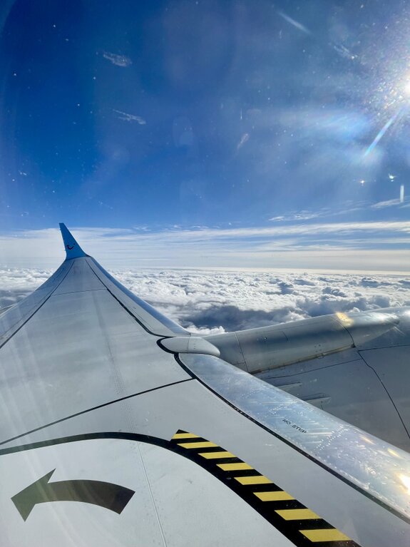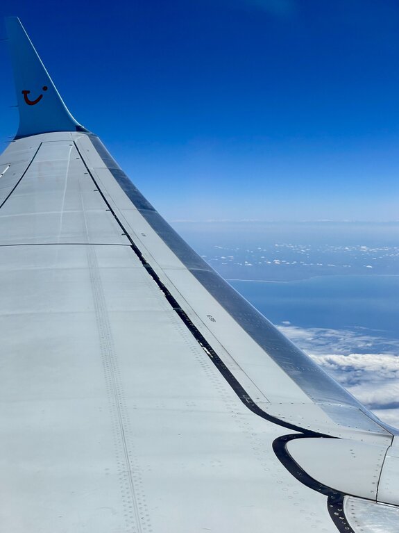 Der Blick aus dem Fenster war an diesem Tag einfach spektakulär. Zuerst überflogen wir ein endloses weißes Wolkenmeer, aus dem ab und zu die schroffen, verschneiten Gipfel der Berge hervorlugten. Später riss der Himmel auf und gab den Blick frei auf den tiefblauen, schier unendlichen Atlantik. Das hellblaue Winglet mit dem TUI-Logo im strahlenden Sonnenlicht war dabei das perfekte Motiv für die ersten Urlaubsaufnahmen.