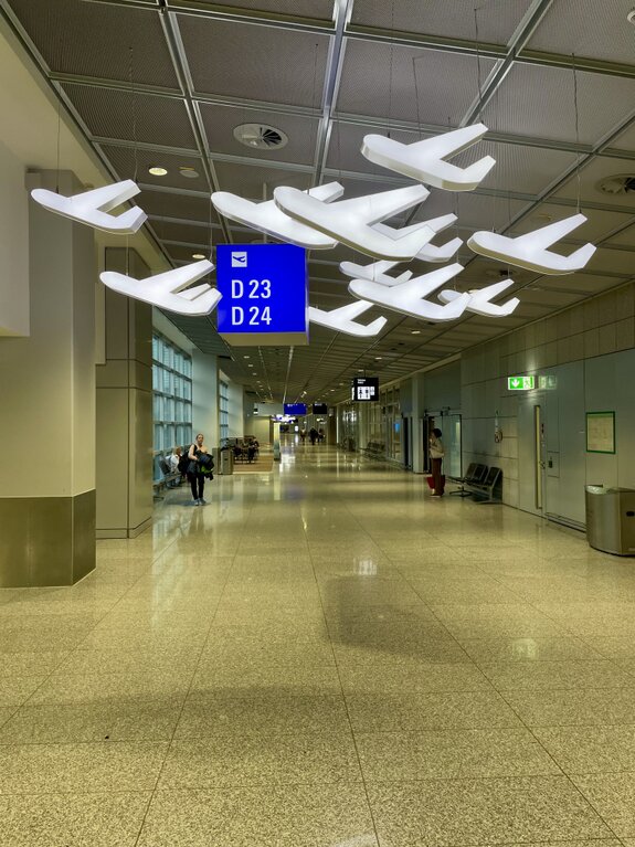 Der Weg zu unserem Gate D23/D24 führte uns durch die modernen, hellen Flure des Terminals. Besonders die Lichtinstallation an der Decke – stilisierte Flugzeug-Silhouetten, die über den Köpfen der Passagiere zu schweben scheinen – ist ein tolles architektonisches Detail, das die Vorfreude auf das Fliegen noch einmal steigert.