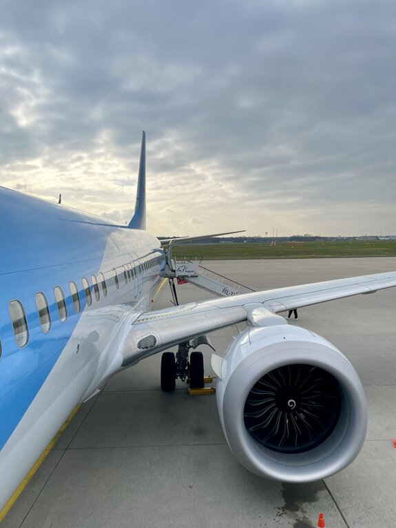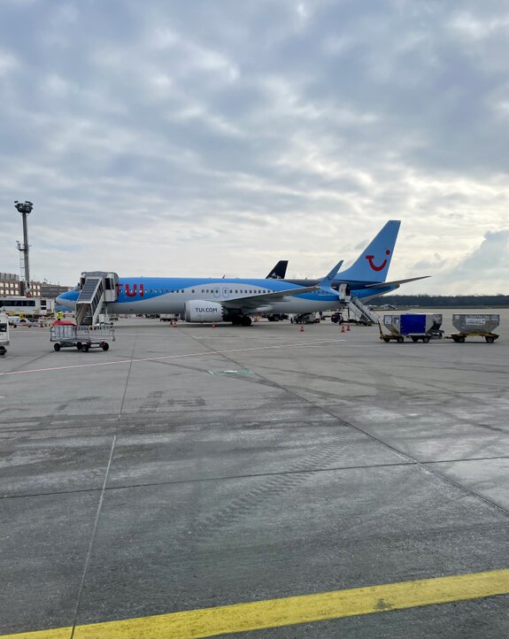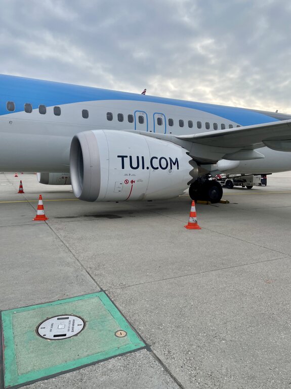 Da stand sie: Unsere TUI Boeing 737-MAX 8. Aus dieser Perspektive wirken die Triebwerke mit dem markanten "TUI.COM"-Schriftzug erst richtig gewaltig. Der Wind, der über das Rollfeld wehte, mischte sich mit dem typischen Geruch von Kerosin – für uns der ultimative Duft des Aufbruchs. Das ikonische rote Lächeln auf dem Leitwerk schien uns direkt zuzuzwinkern, bevor wir die Treppen zum Flugzeug erklommen.